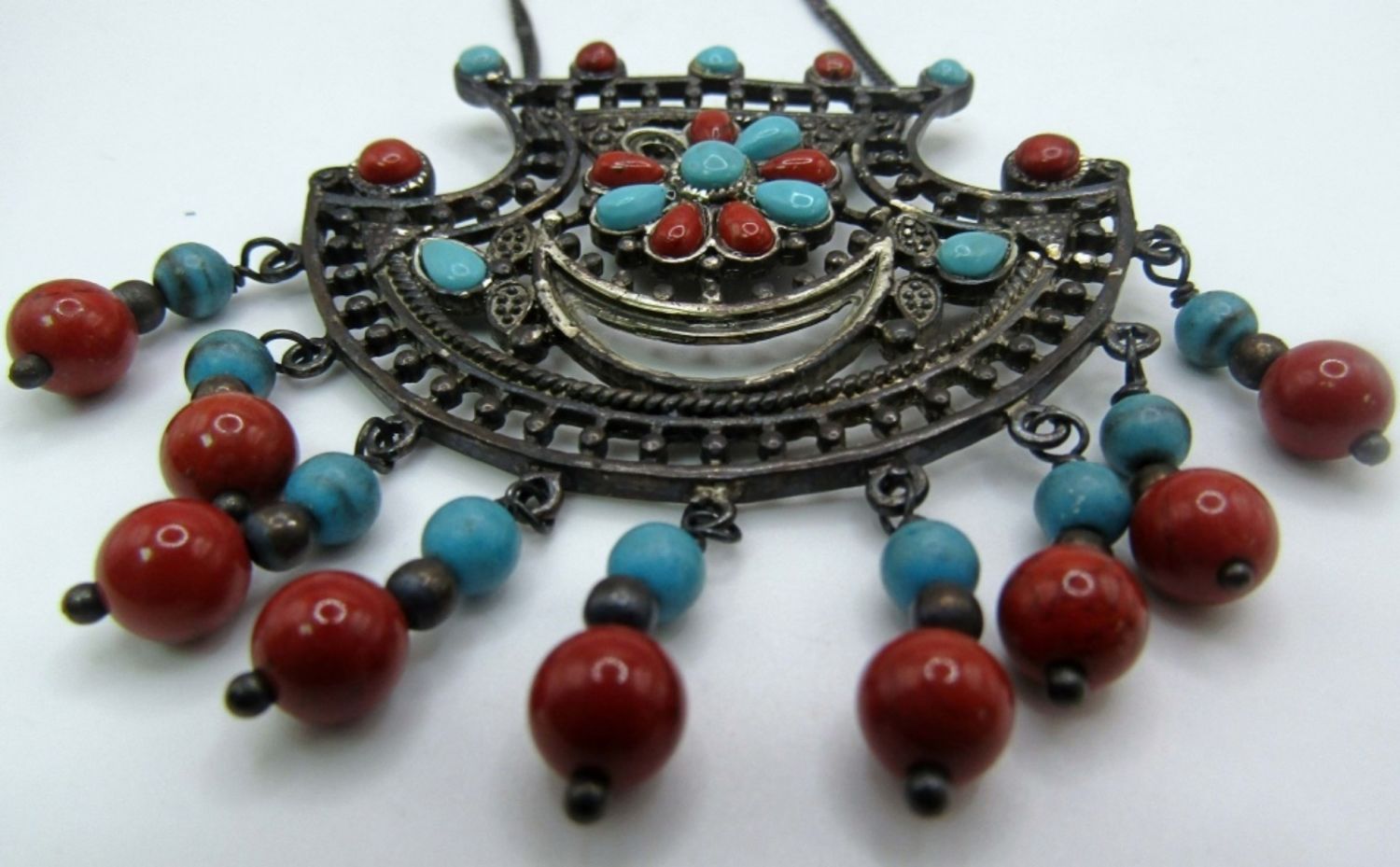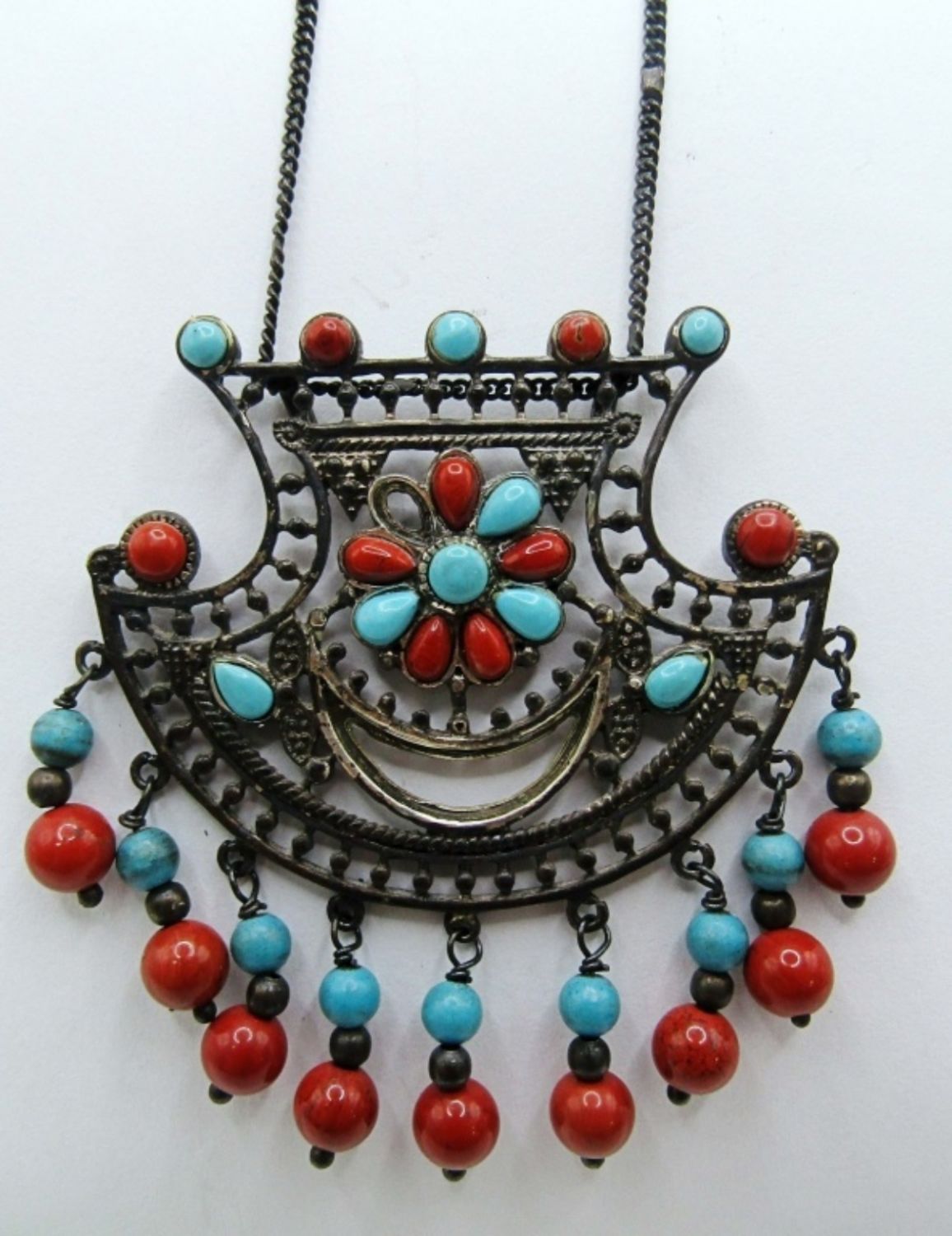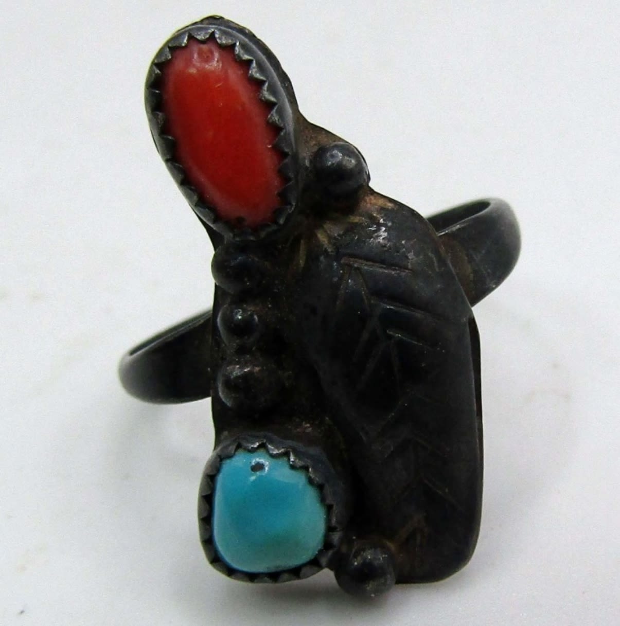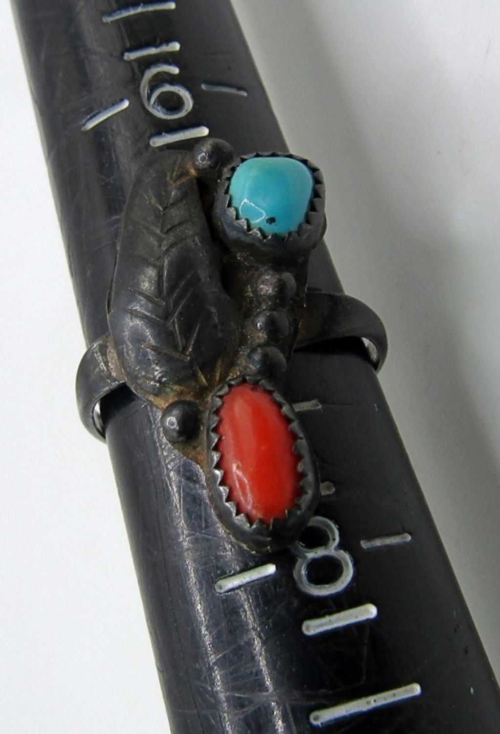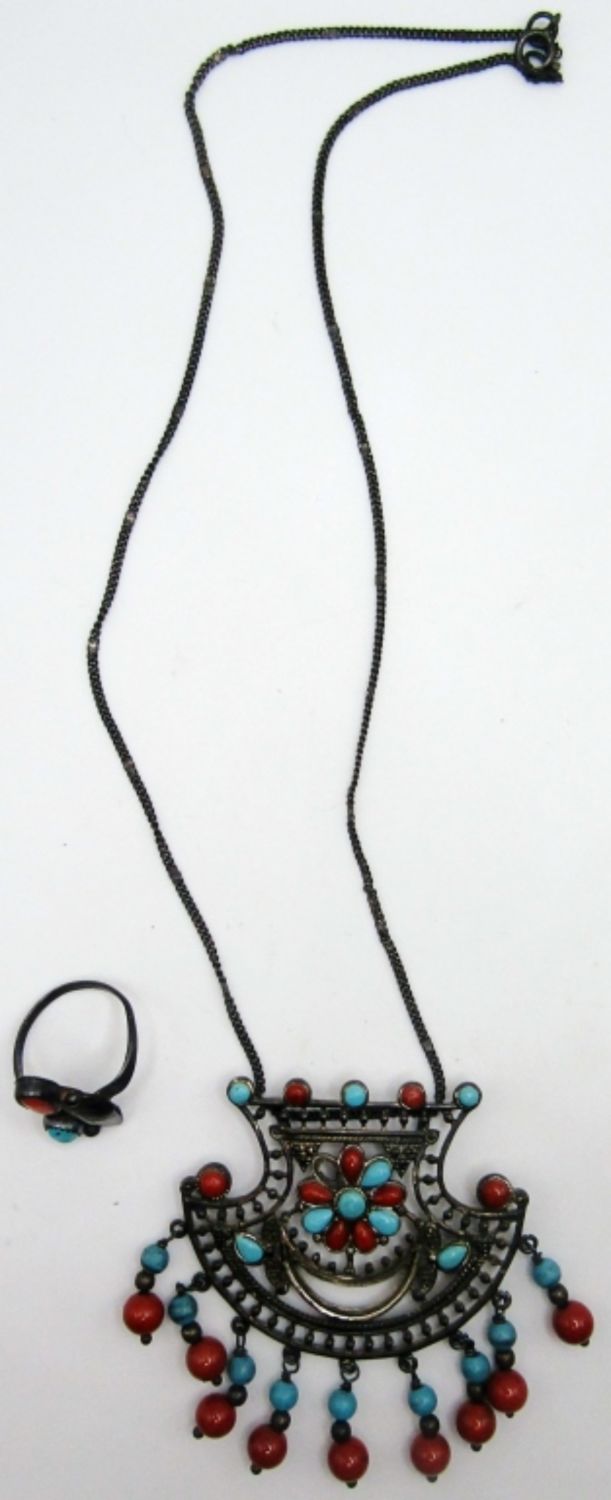 15.3dwt, ring size 7, ring has a feather with small turquoise and coral stones, Necklace marked 925 on back. Stunning design is missing one small coral stone