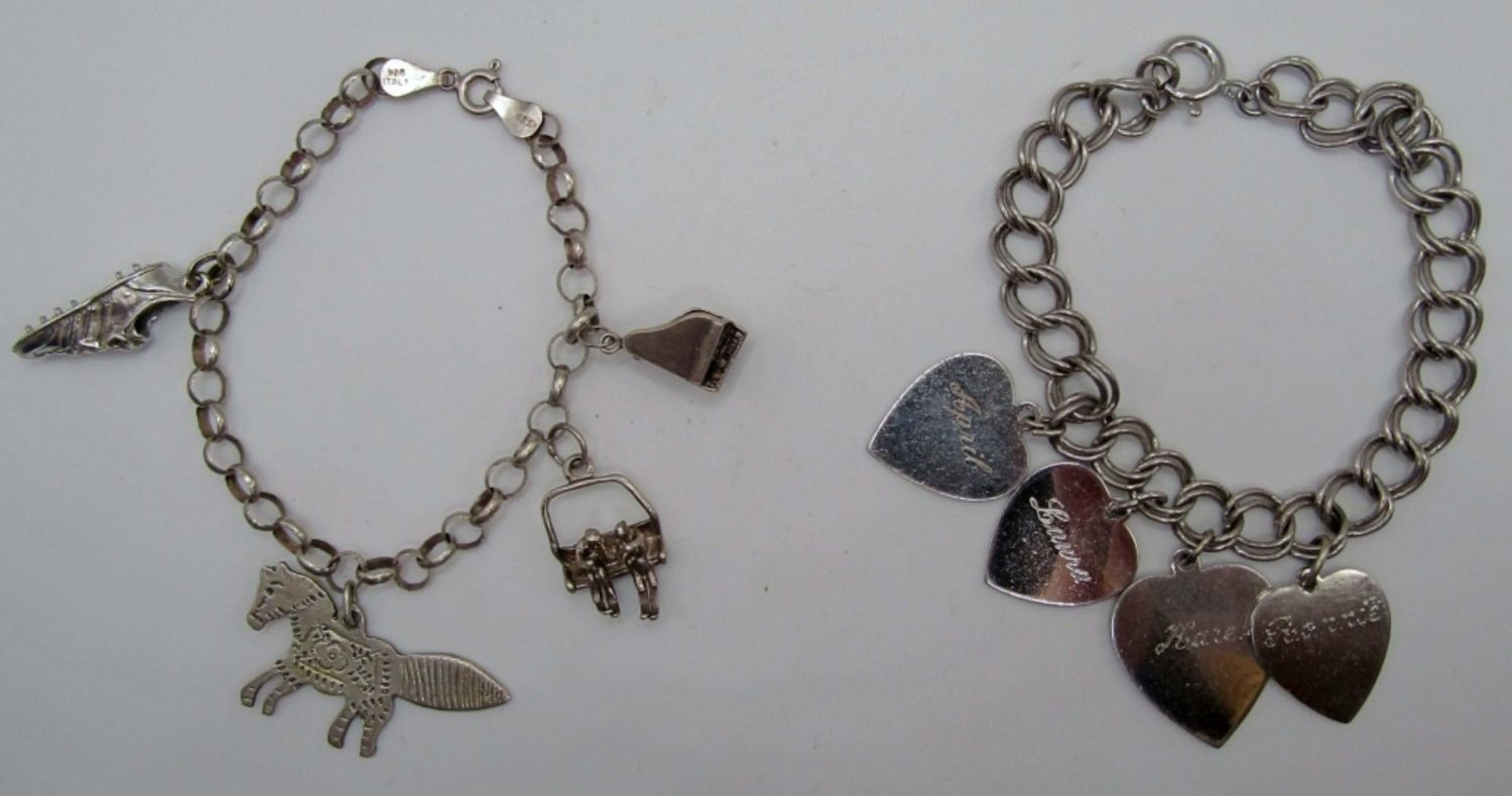 both are 7in in length, one has 4 heart charms with names on front and dates on the back all charms are marked sterling and bracelets as well, second charms are a cleat, a donkey, ski lift and a piano, 21.5 dwt