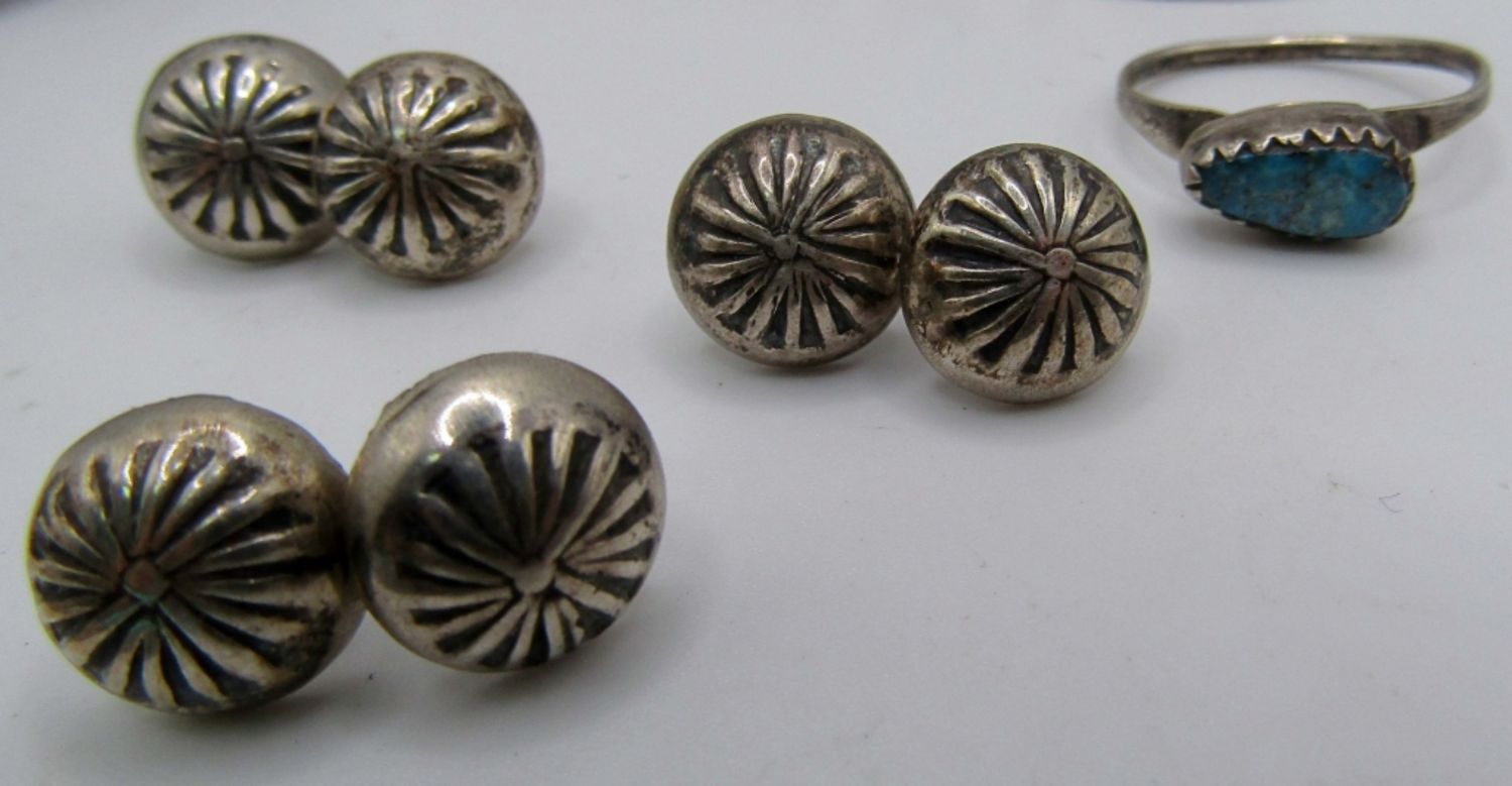 26.8dwt, 3 paris of sterling stud earrings, 1 pair of medium round earrings with a star in the middle and a turquoise bead in the middle no markings, 2 stering button clips with design on the front no markings, a