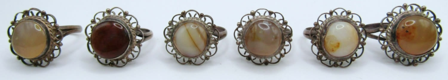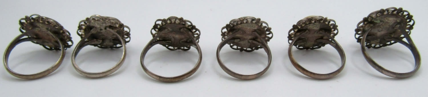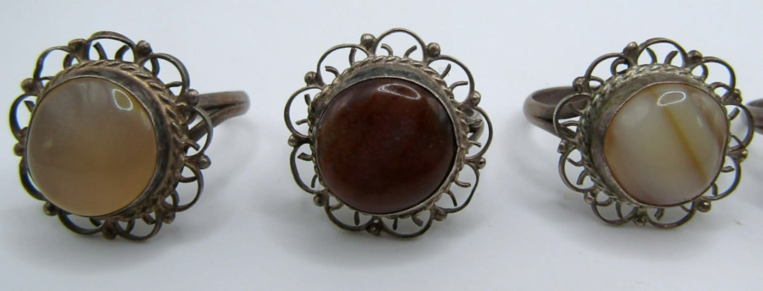 sizes from 6.5 to 9, 14dwt, each marked with 925, stones in the middle with a petal like design around it