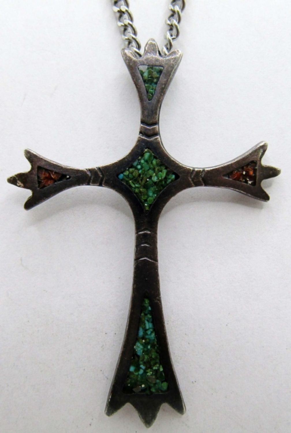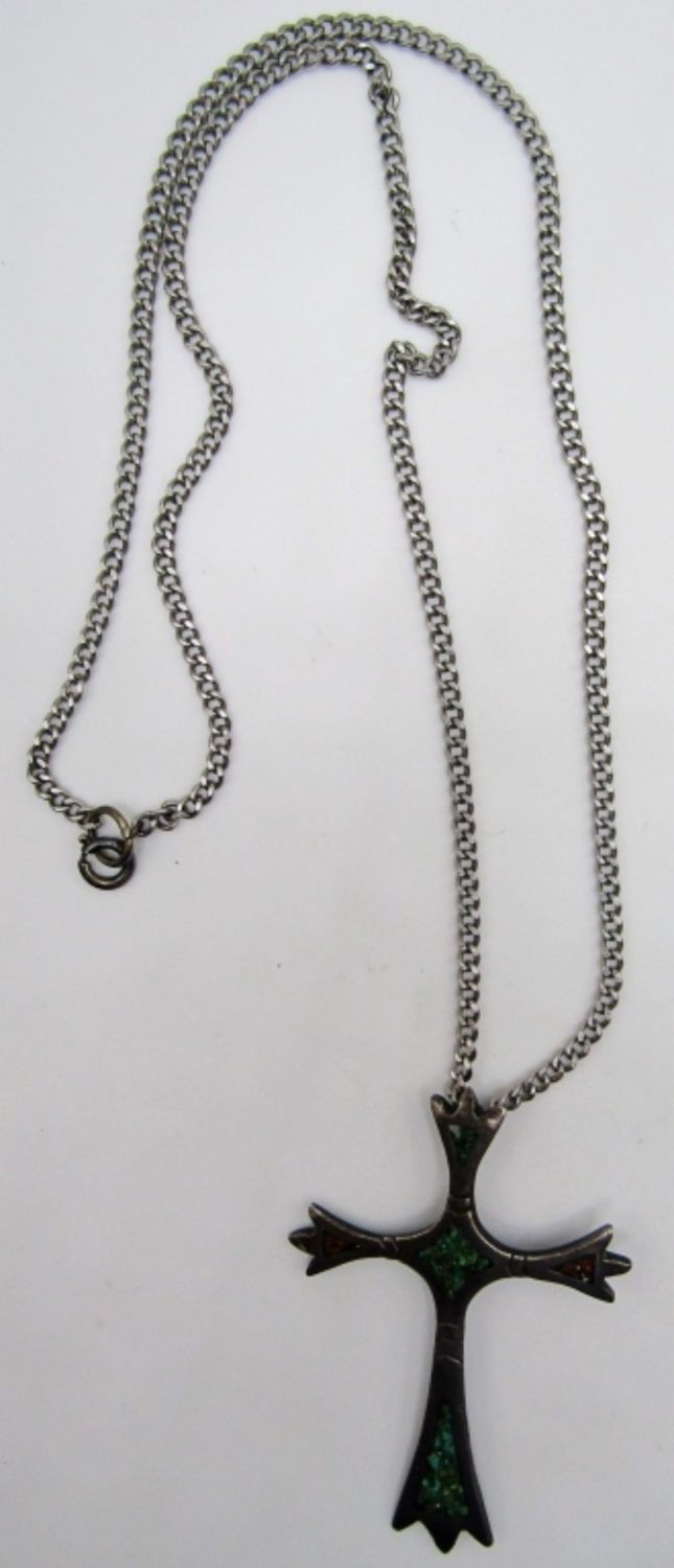 10dwt, 21in in length, Crushed Gems inlay of Turquoise and coral, Handmade in 2/11/74 craved on back also with the letter B & A