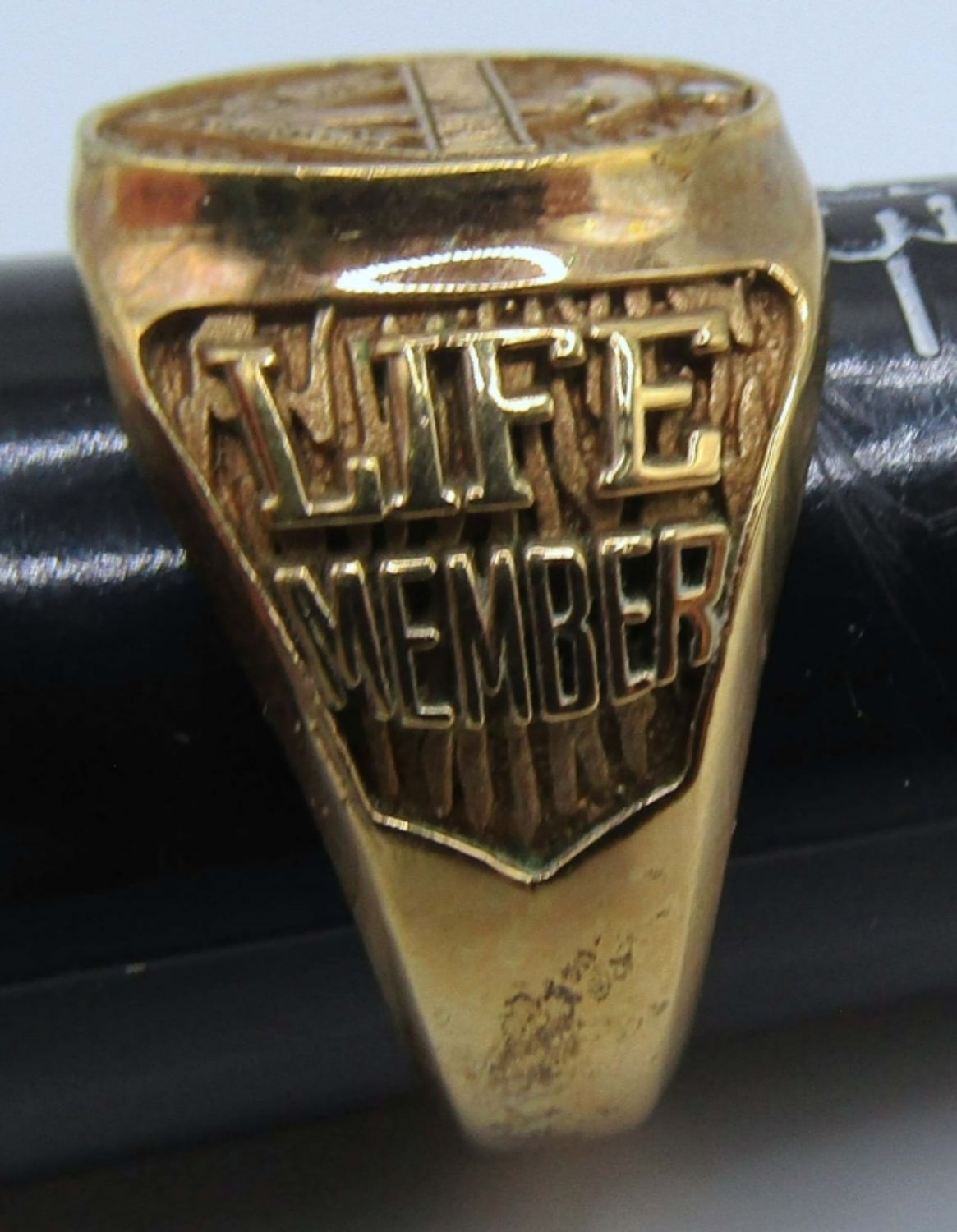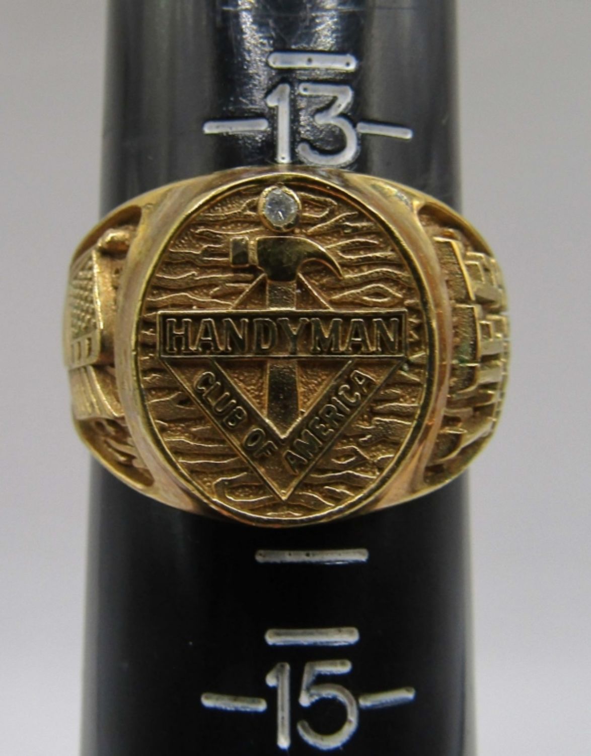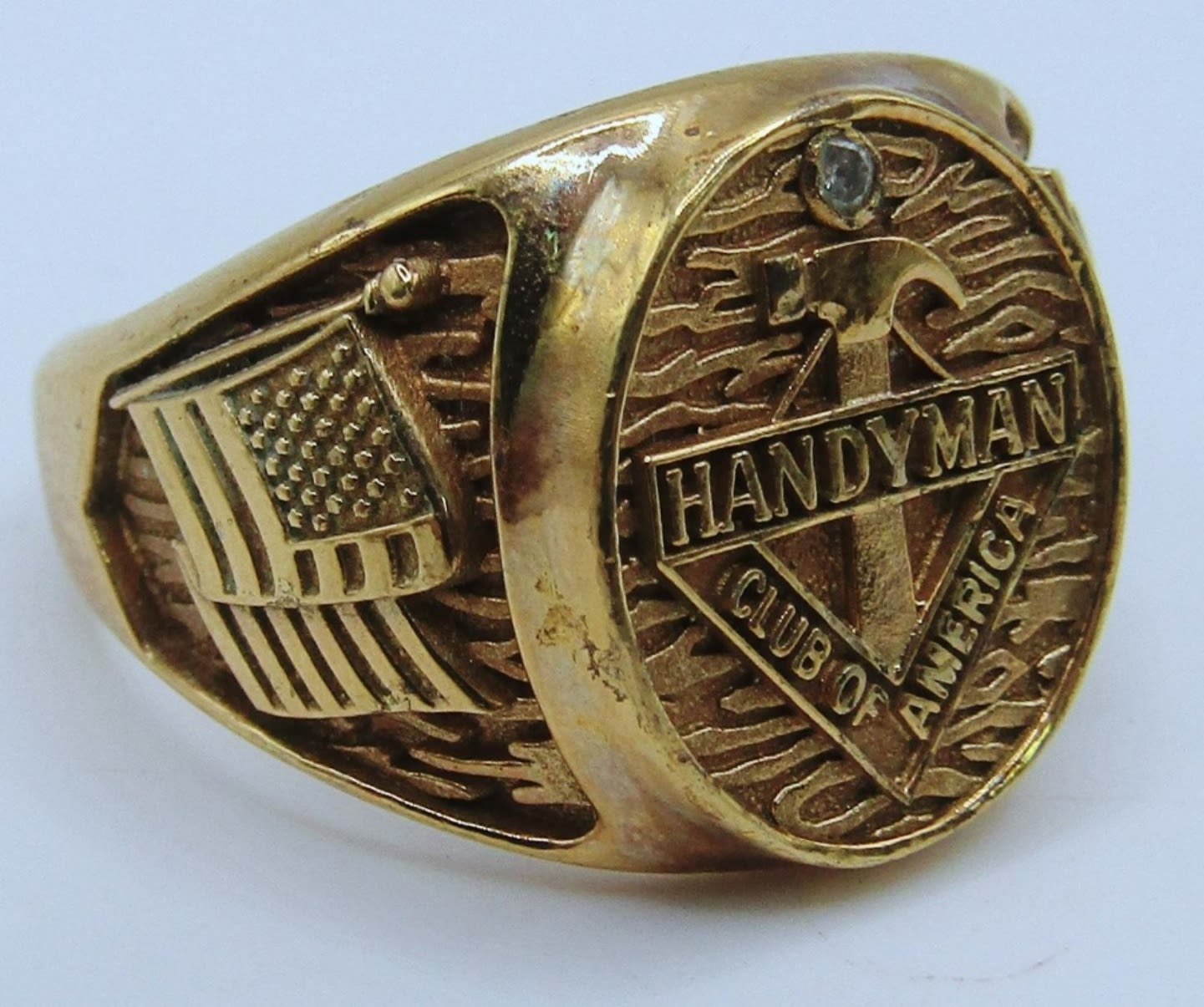 10dwt, size 10, Marked Sterling inside,American flag on one side and life member on the other. Handyman Club of America with a hammer on the front with a clear stone above