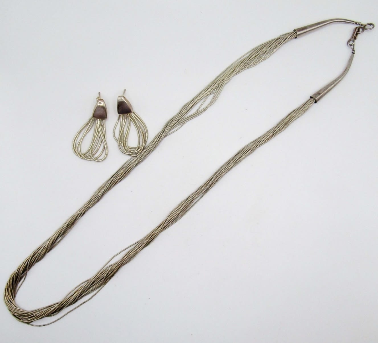 24in in length with a hook clasp, marked sterling, one earring is missing the backing both are marked with 925, dwt 21.2