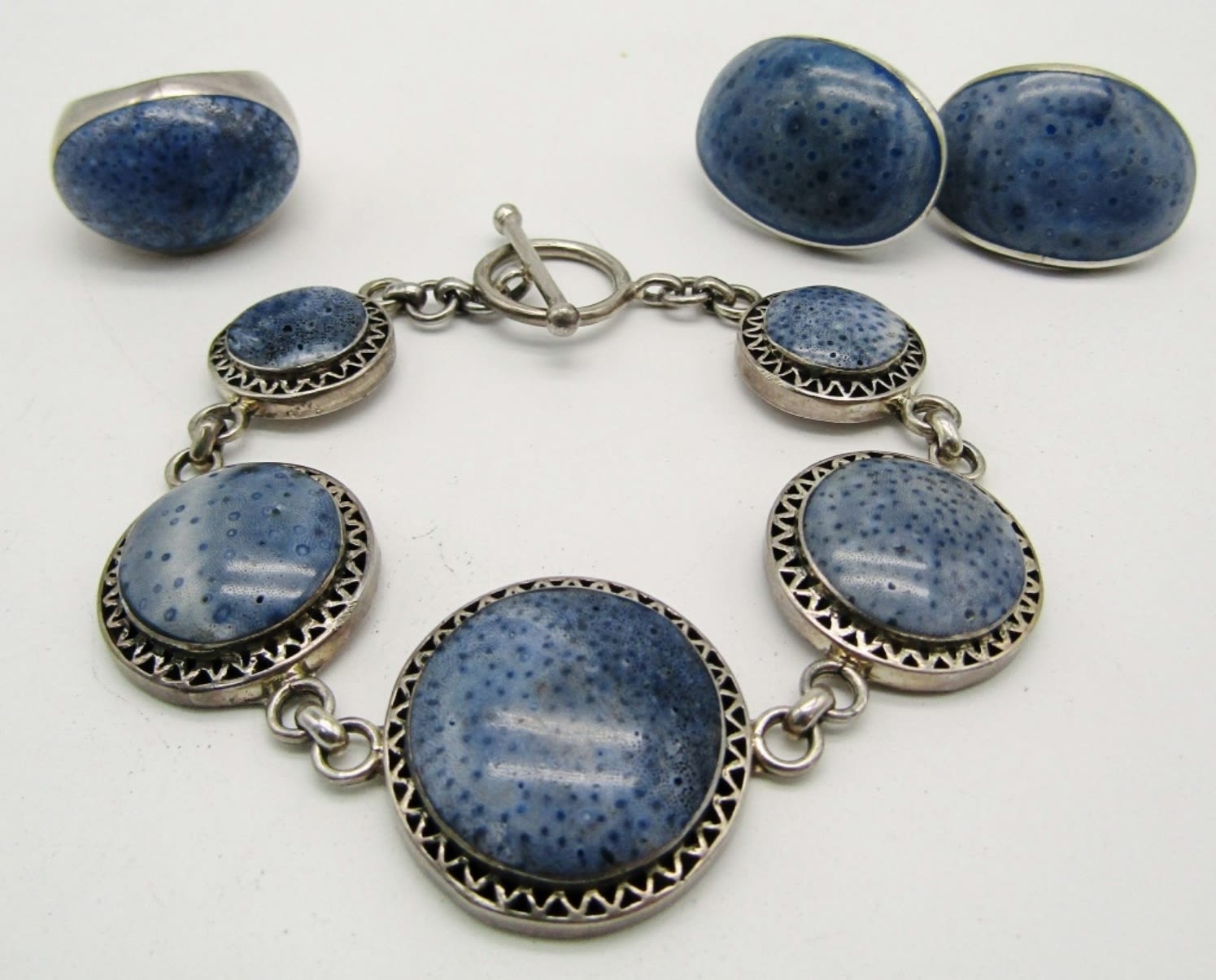 Bracelet 7 in with a toggie clasp marked with 925 on the back, matching ring that as 925 marked, pierced earrings no markings 28dwt all together