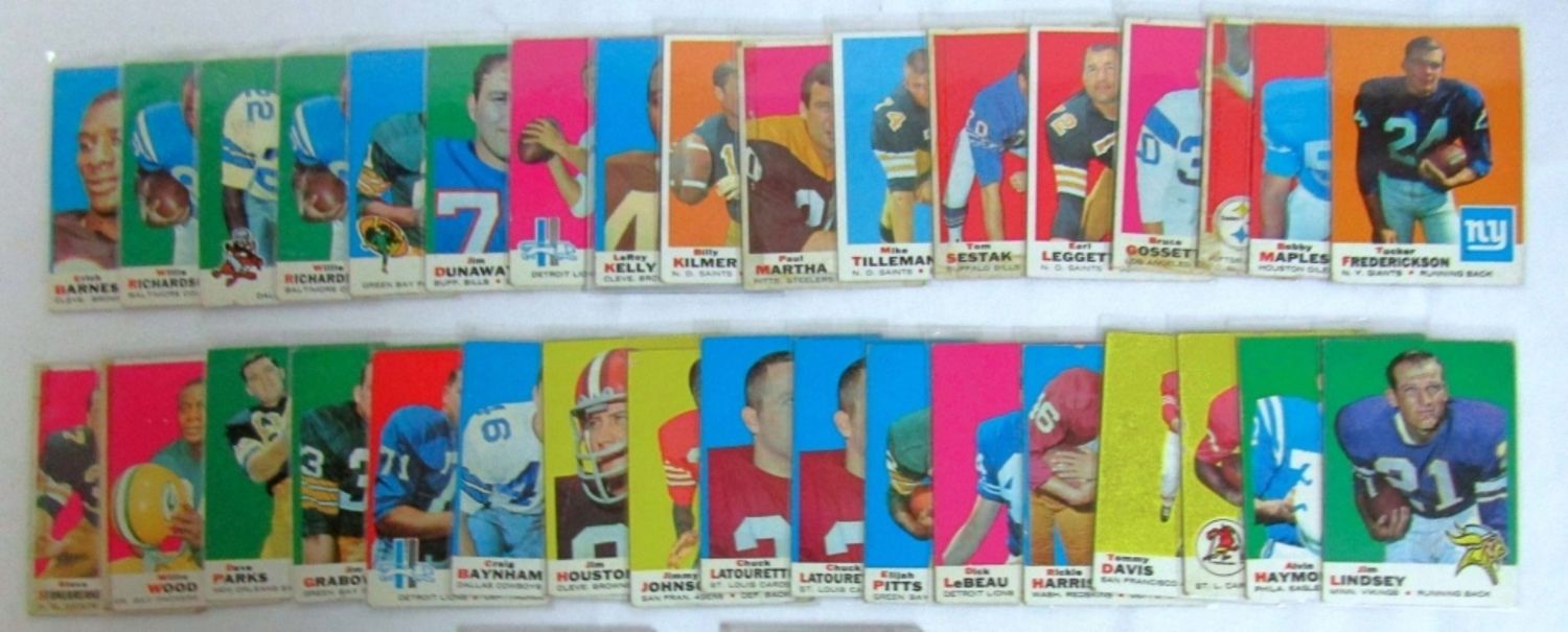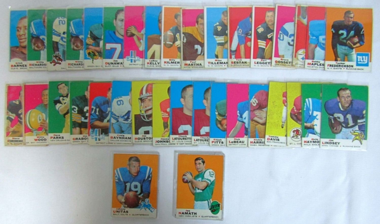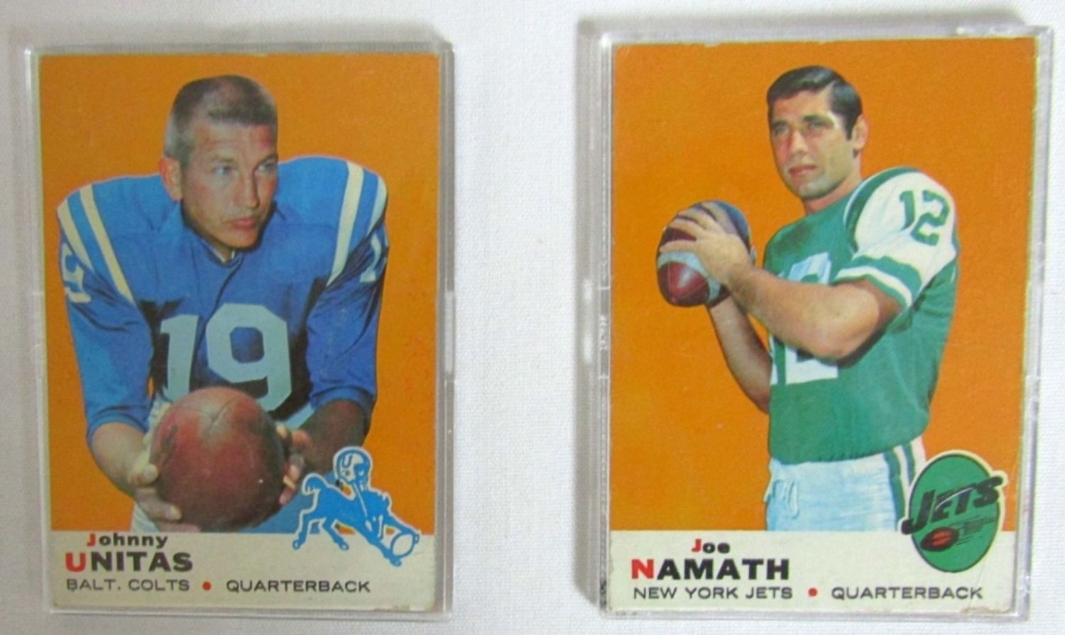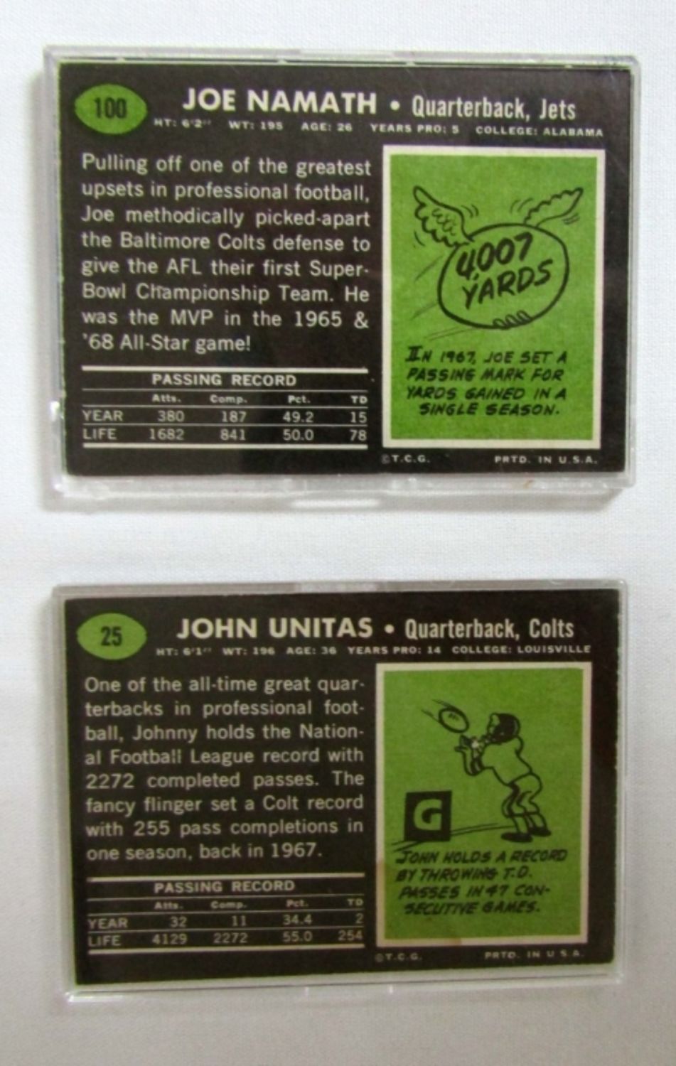 THIS LOT INCLUDES #25 JOHNNY UNITAS VGEX, #100 JOE NAMATH VGEX, #1 KELLY plus OTHER NFL GREATS – OVERALL EX/VGEX with (6) LESSER w/TAPE