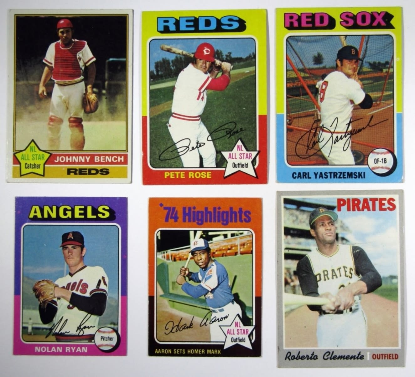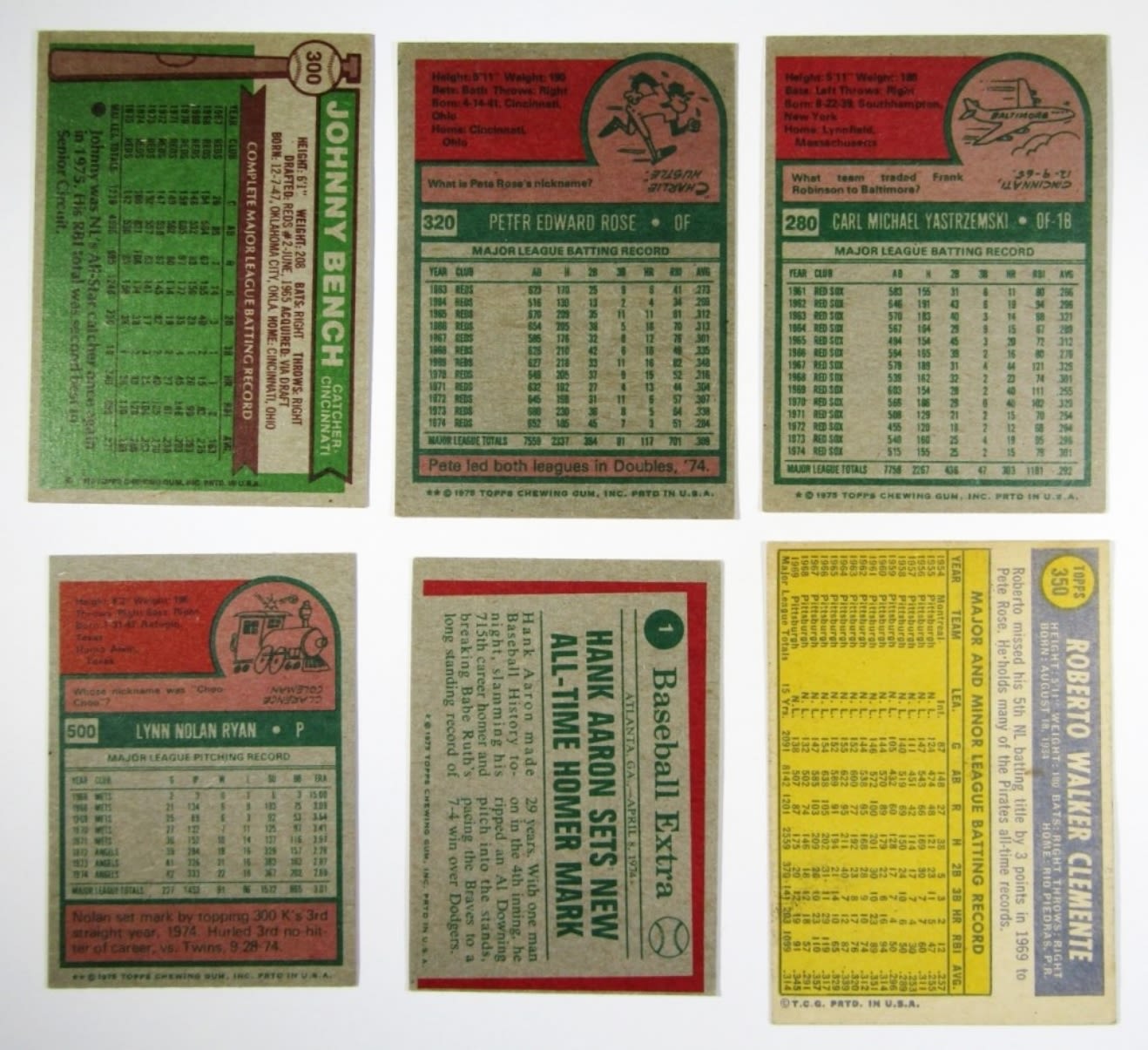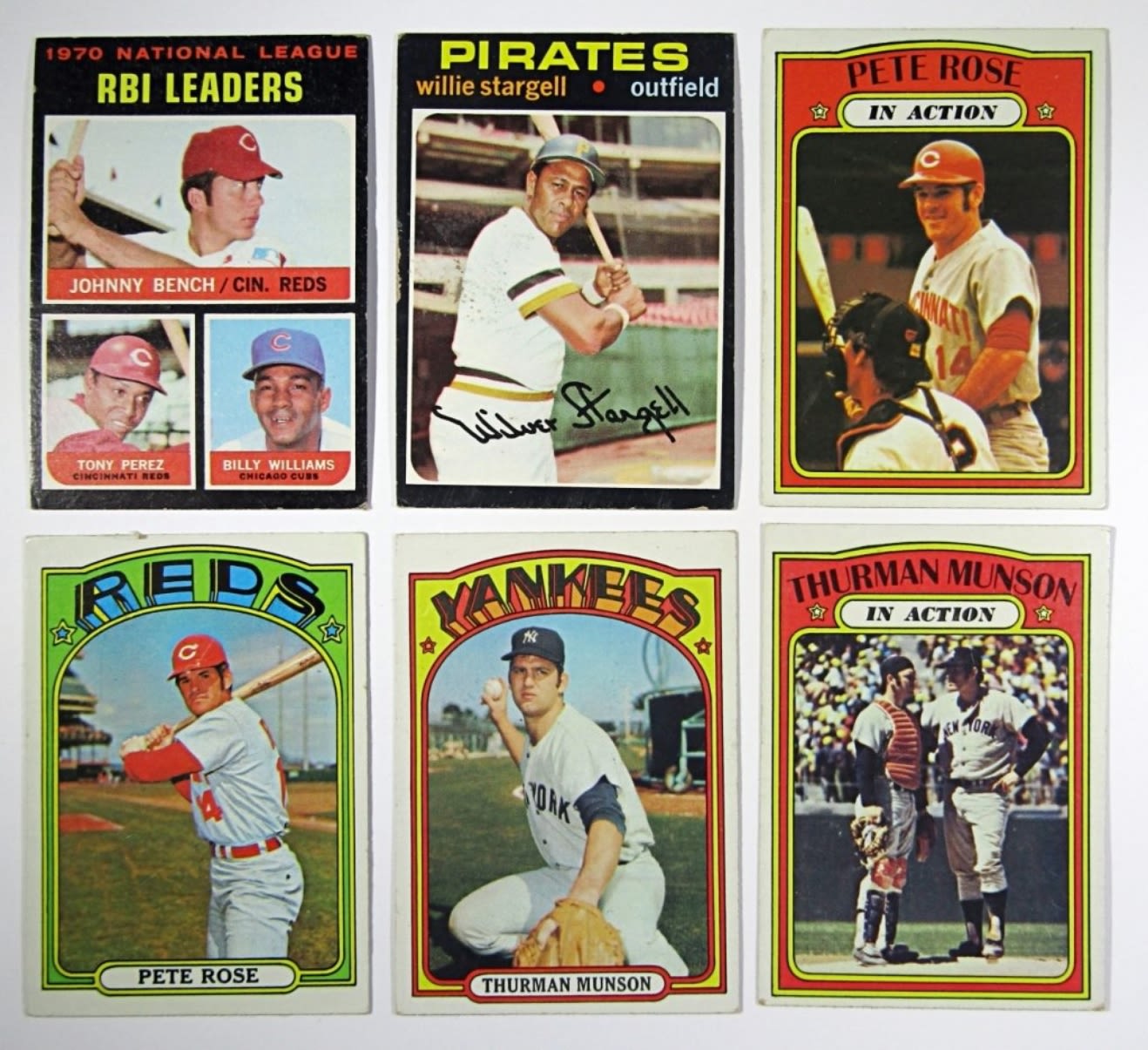 1970 TOPPS CLEMENTE, 1971 TOPPS STARGELL & LDRS, 1972 TOPPS PETE ROSE, ROSE IA, MUNSON, MUNSON IA, 1973 TOPPS BENCH, MORGAN, 1975 TOPPS MINI RYAN, AARON HIGHLIGHTS, PETE ROSE, YASTRZEMSKI, 1976 TOPPS BENCH, 1977 TOPPS