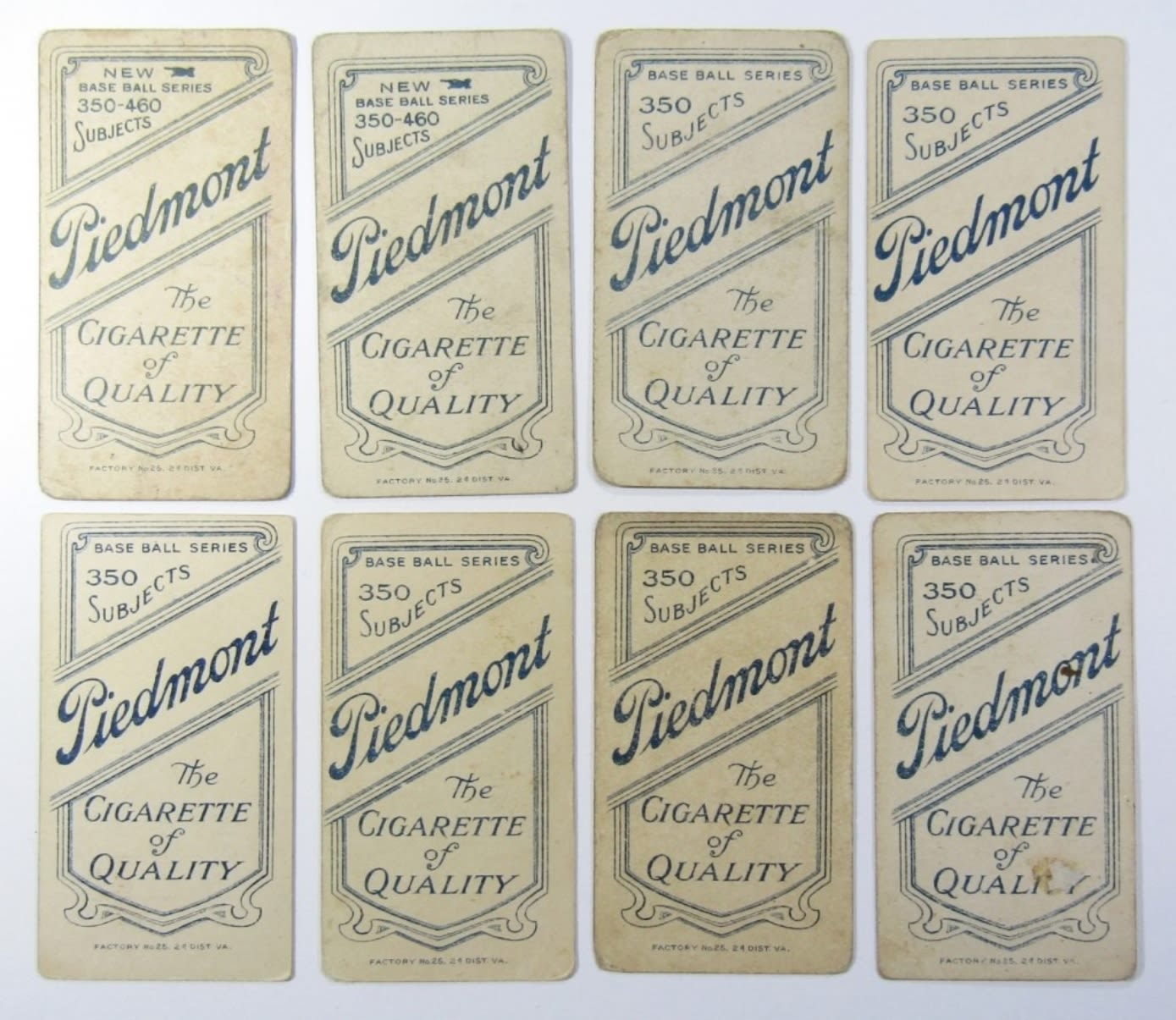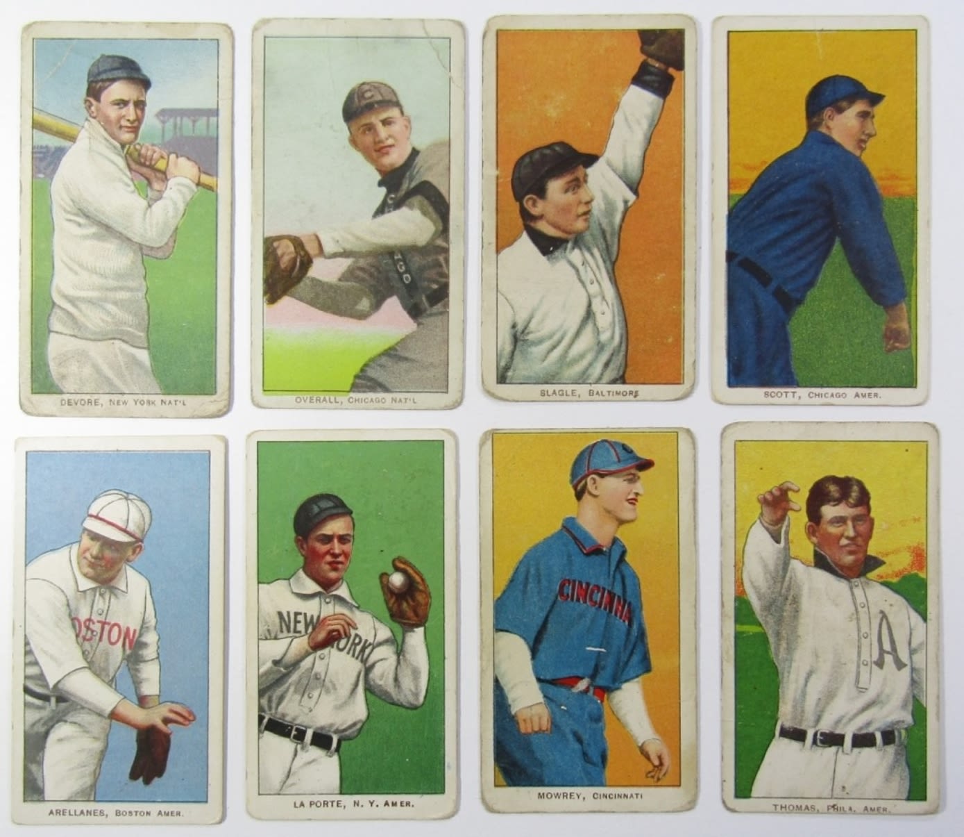 SLAGLE, BALTIMORE – SCOTT, CHICAGO AMER. – ARELLANES, BOSTON AMER.- LA PORTE, N.Y. AMER. – MOWREY, CINCINNATI – THOMAS, PHILA AMER. – OVERALL, CHICAGO NAT’L – DEVORE, NEW YORK NAT’L – ALL WITH PIEDMONT BACKS – NICE