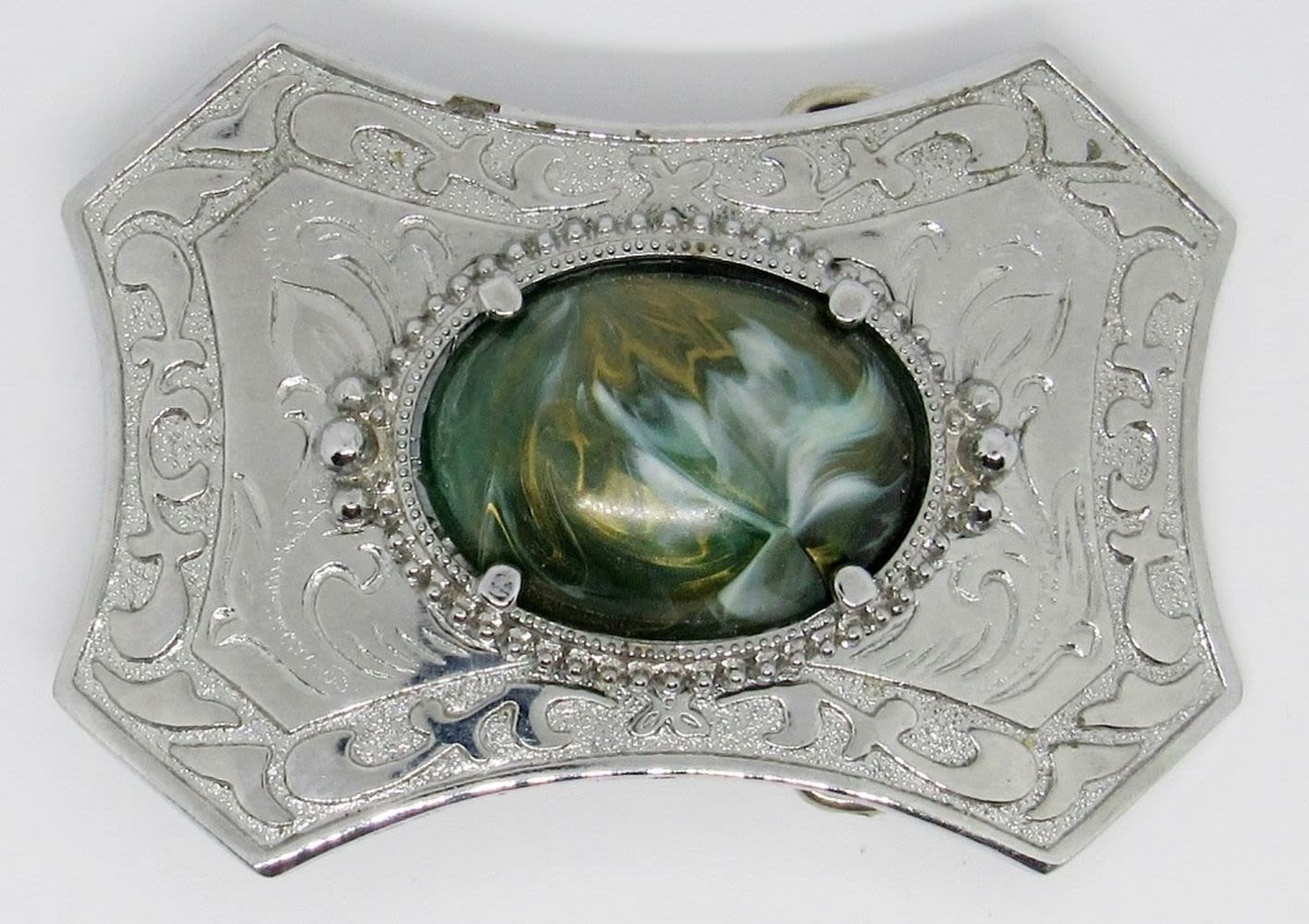 Set of 3 Vintage Belt Buckles, Silver Tone w/ Green Gold Center Marble Stone, Silver Flower Design, Brown Gold Leaf