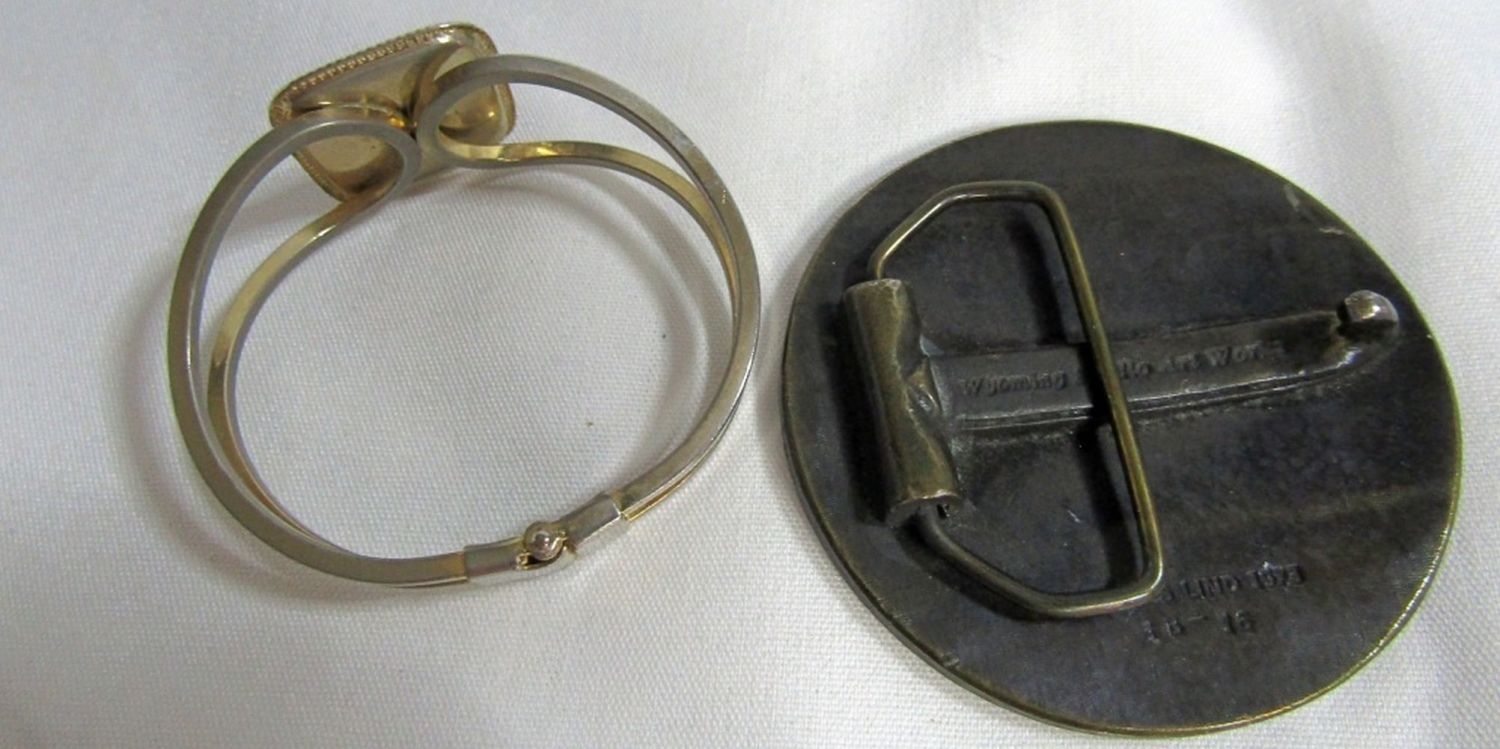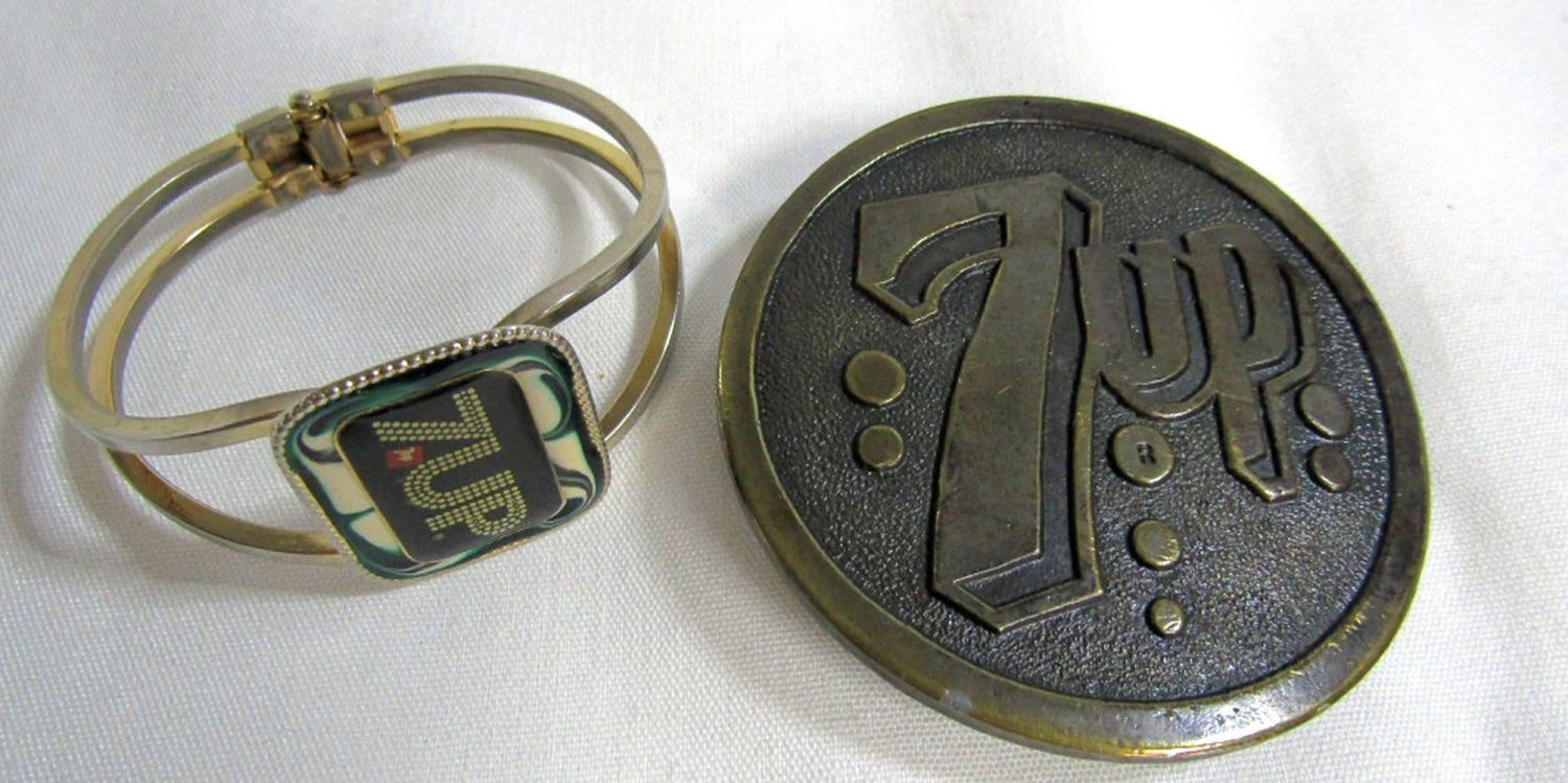 Round Soda Advertising Belt, Wyoming Studio Art Works James Lind 1973; 7UP Hinge Bracelet!