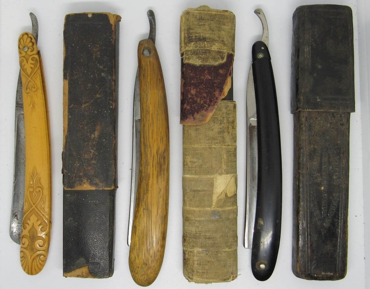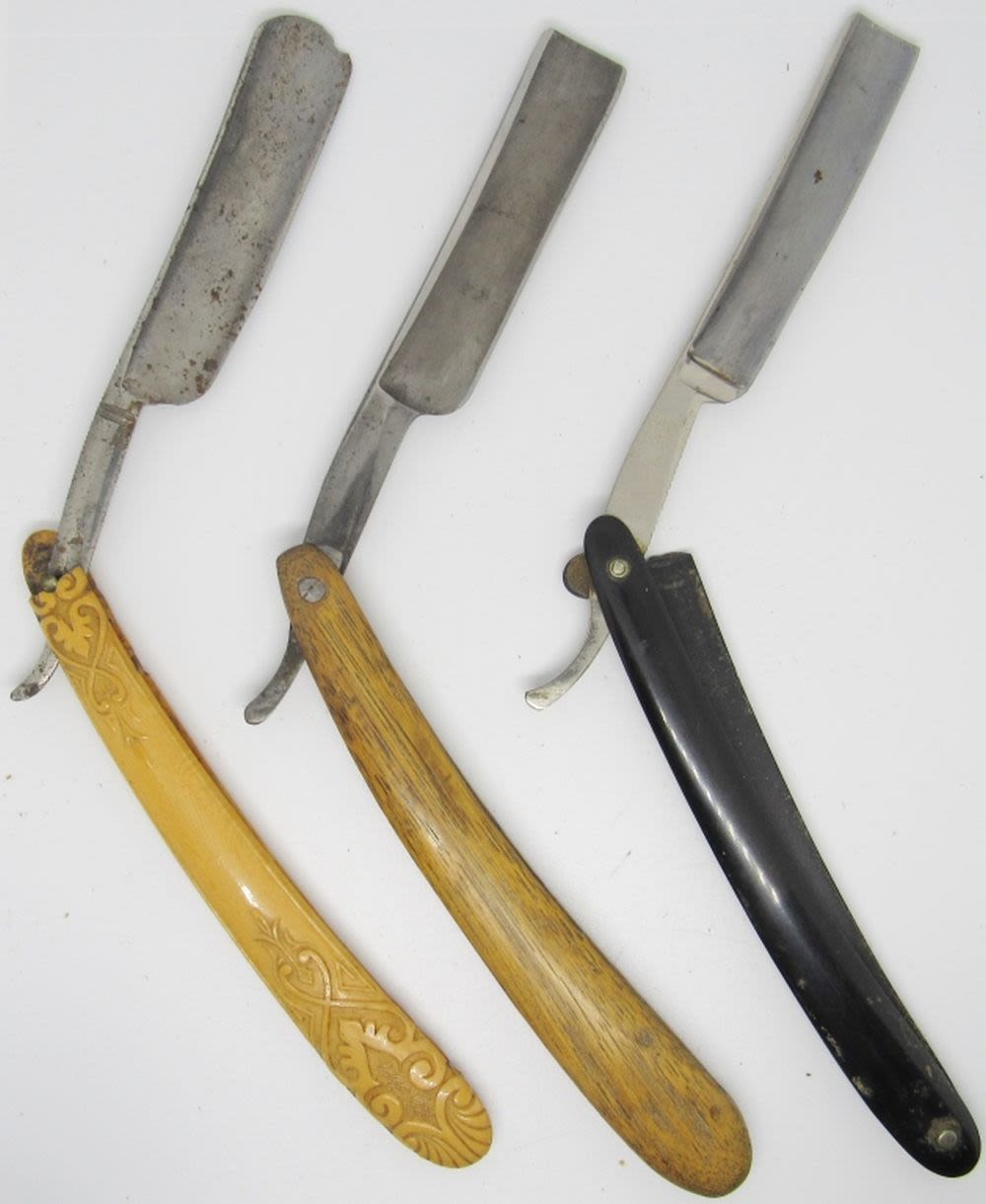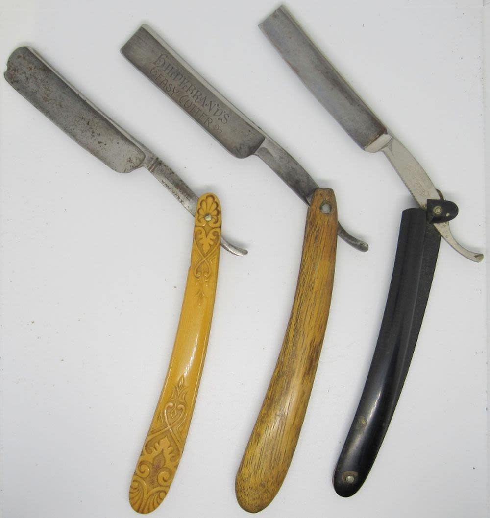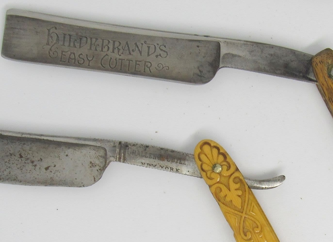 Challenge Cutlery Co. New York Straight Razor (Back piece on side is broken, pictured); Hildebrand’s Easy Cutter Straight Razor, Wood Handle; Fremont Ohio International Cutlery Company Straight Razor (Back Side Piece is