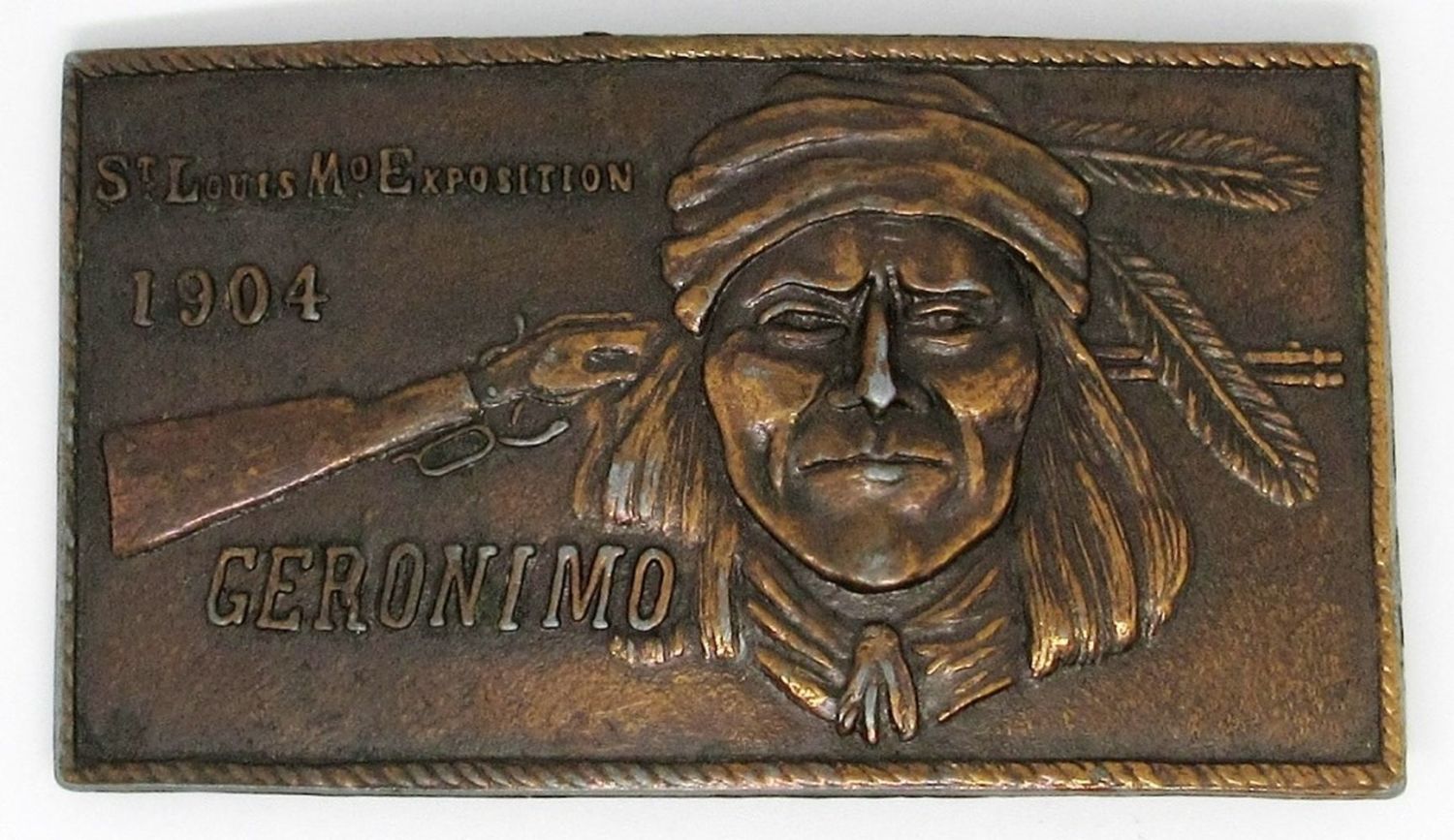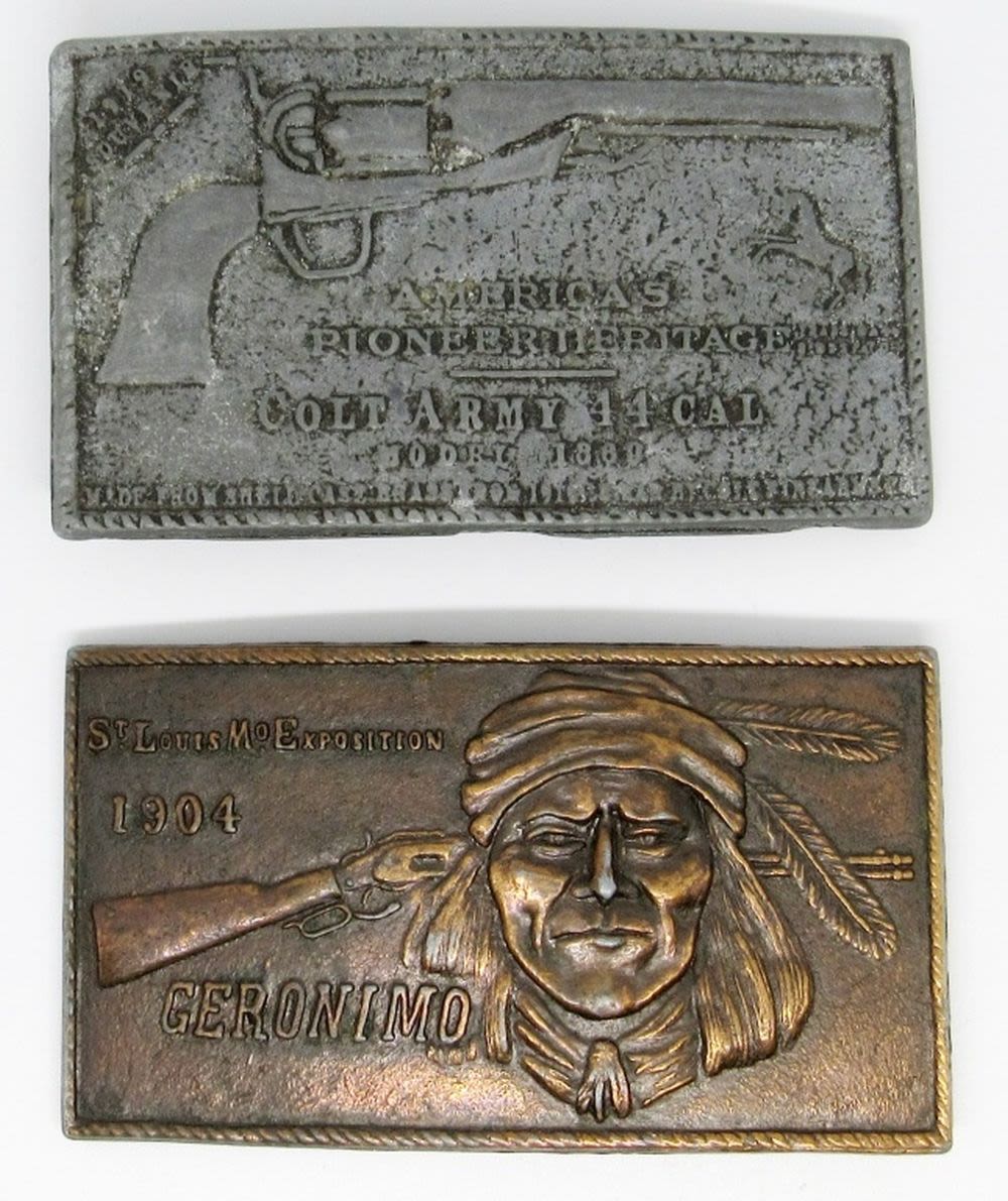 Set of 2 Vintage Solid Brass Belt Buckles, St. Louis Expo Geronimo, America’s Pioneer Heritage