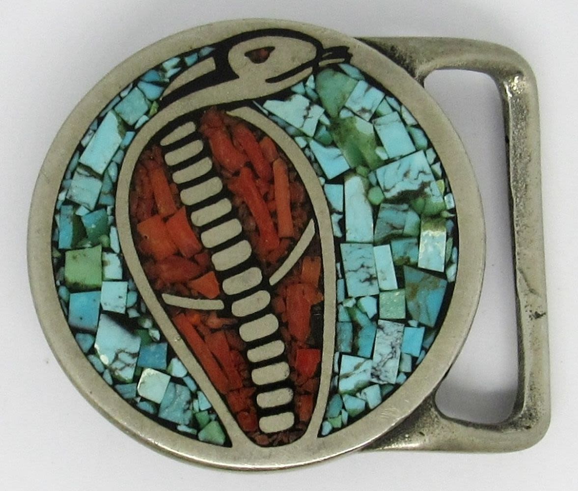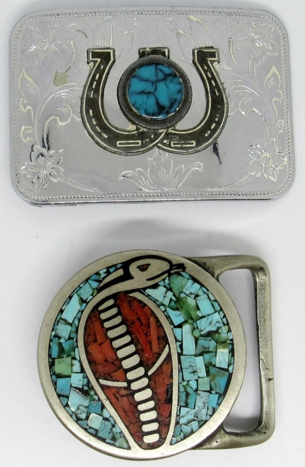 Set of 2 Vintage Belt Buckles, Turquiose Centerpiece in Lucky Horseshoe, Turquoise Snake Inlay Design