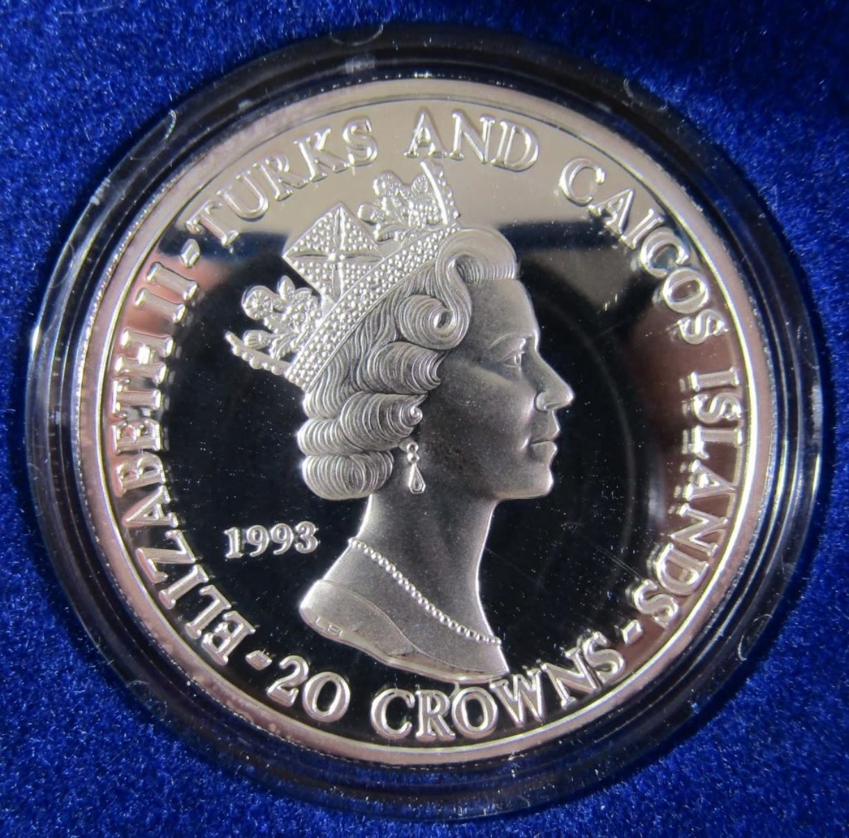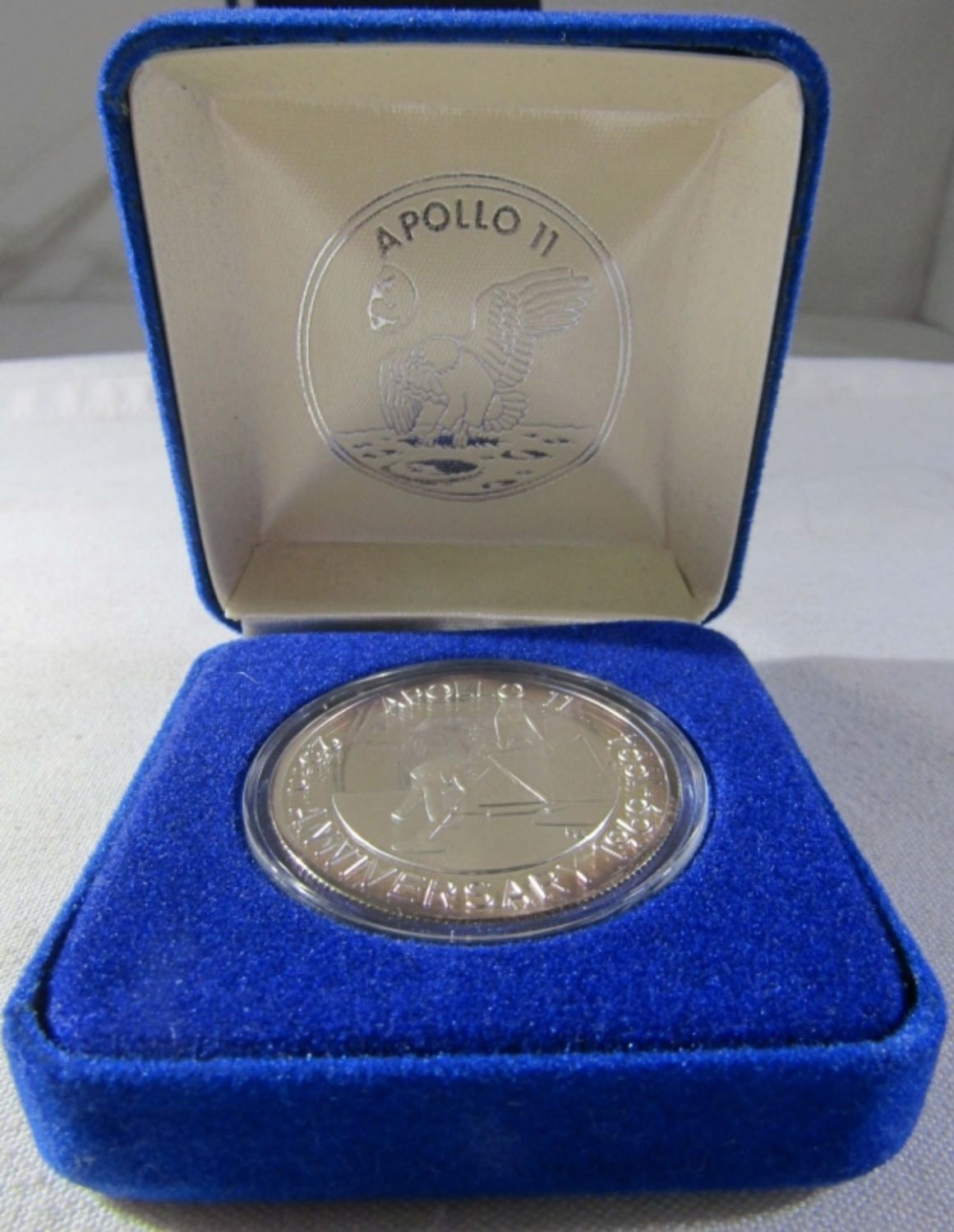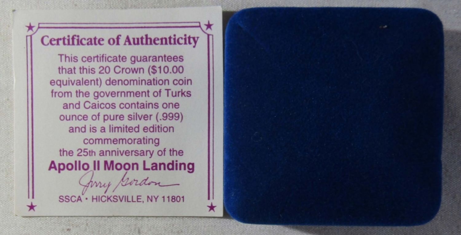 1oz .999 SILVER APOLLO 11 25TH ANNIVERSARY TURKS AND CAICOS ISLANDS 20 CROWNS COMMEMORATIVE COIN IN VELVET BOX WITH COA