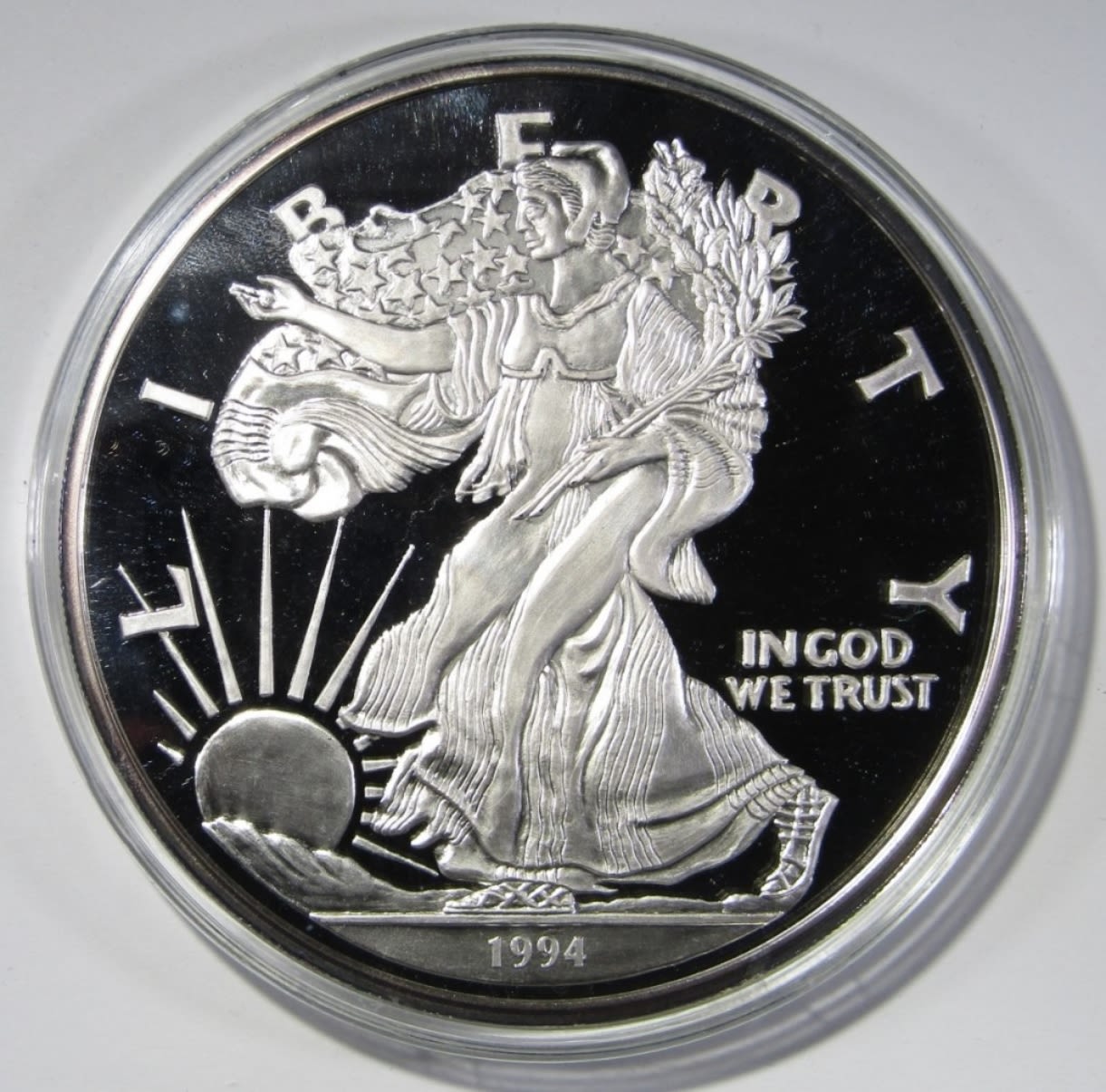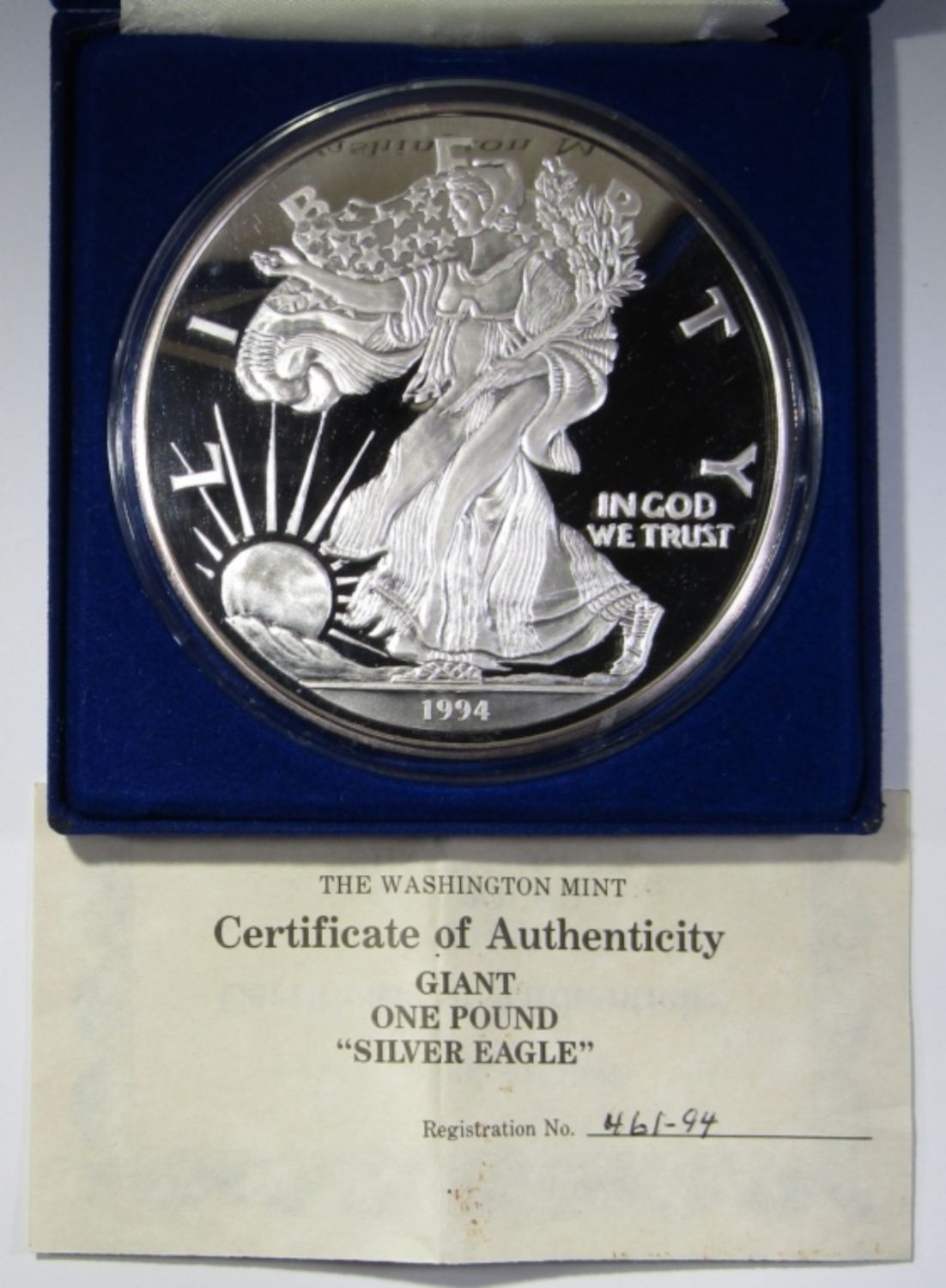 16 TROY OZ SILVER PROOF REPLICA OF 1994 SILVER EAGLE, IN VELVET BOX WITH COA. WASHINGTON MINT.