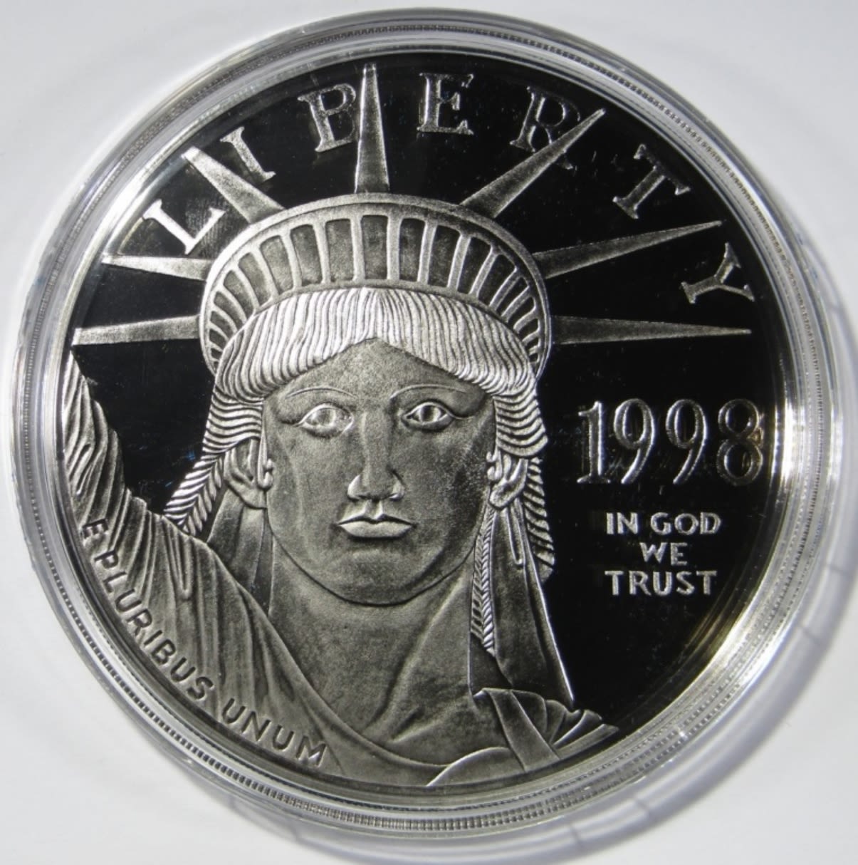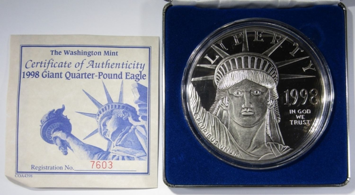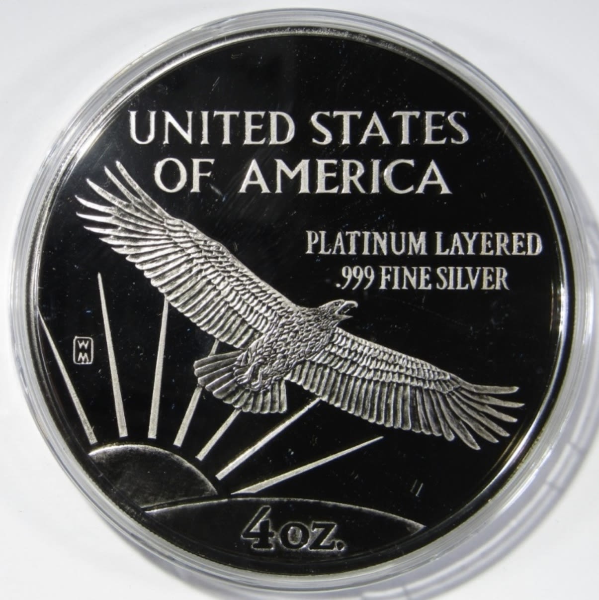 4 TROY OZ .999 SILVER LAYERED IN .999 PLATINUM, PROOF REPLICA OF 1998 $100 PLATINUM EAGLE, IN BOX WITH COA. WASHINGTON MINT