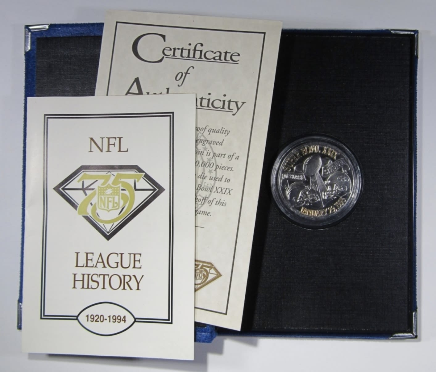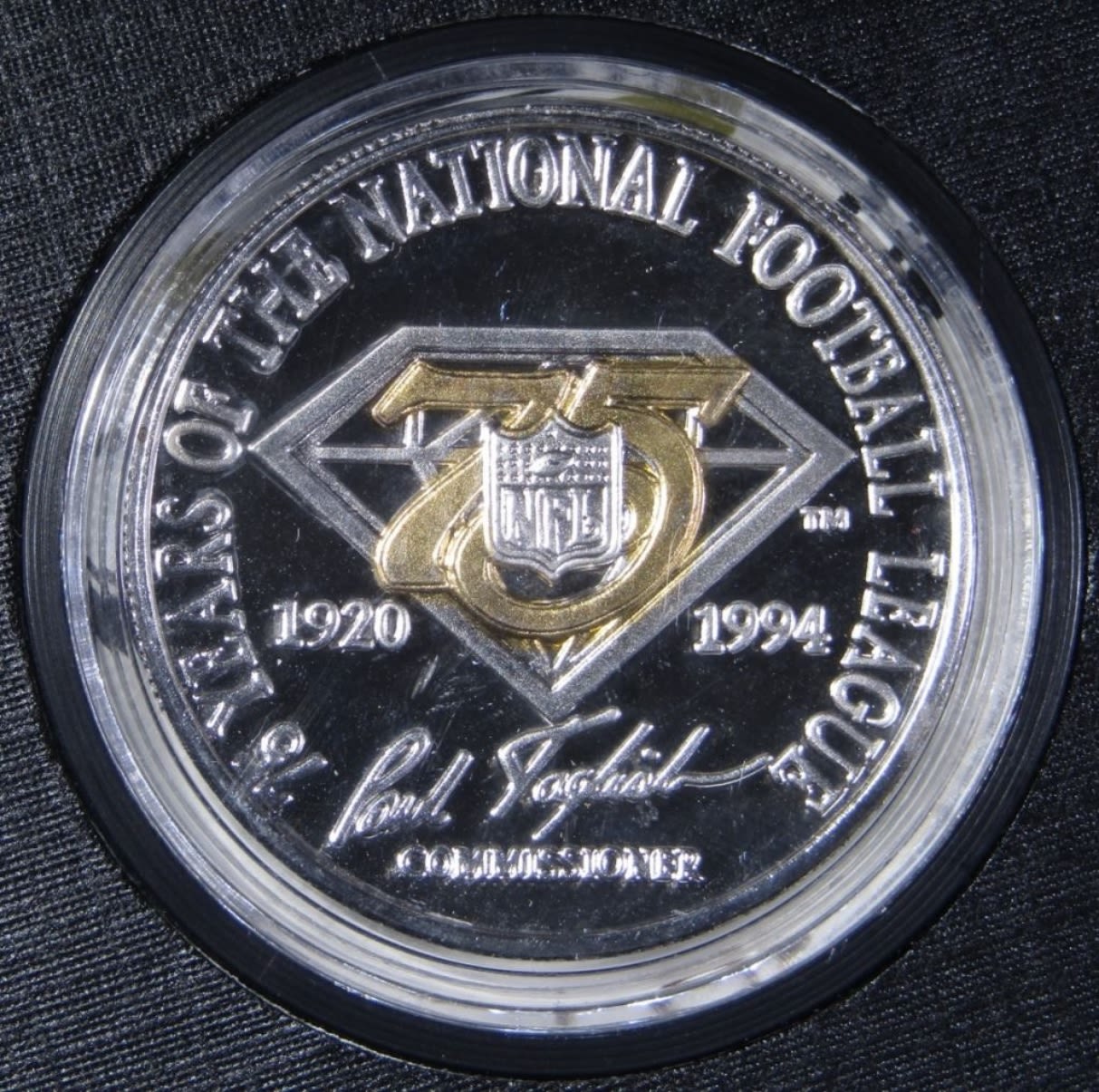 NFL 75TH ANNIVERSARY PROOF STERLING SILVER AND GOLD ENGRAVED OFFICIAL NFL GAME COIN. IN DISPLAY BOOK WITH COA.
