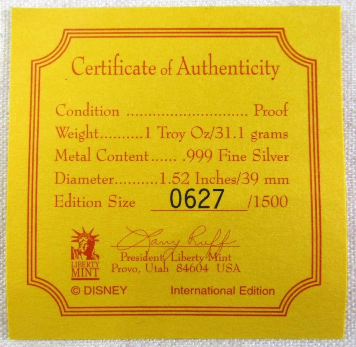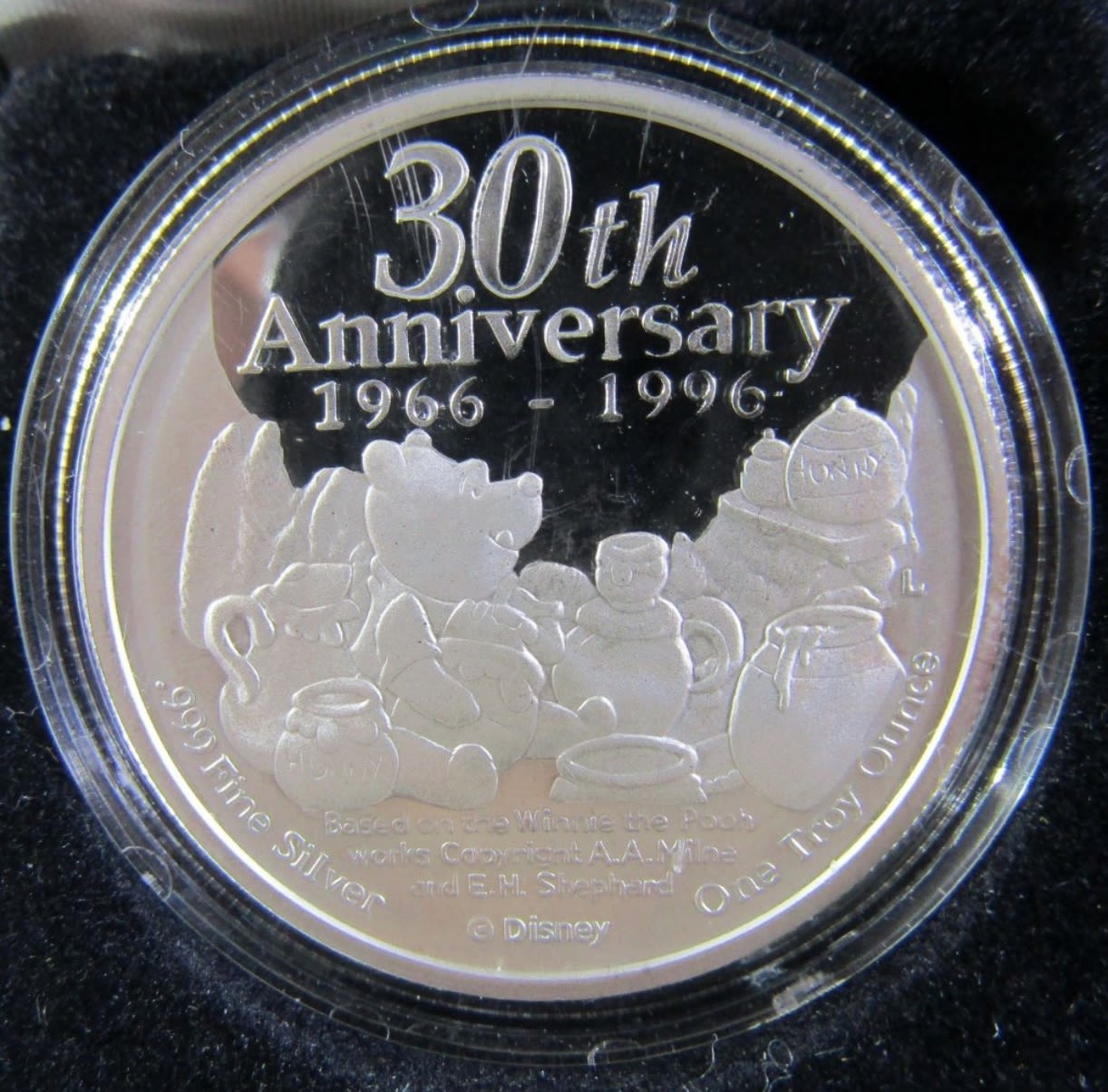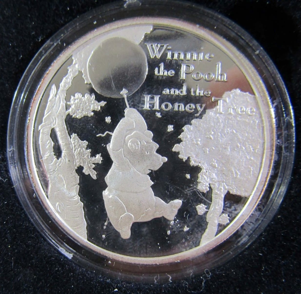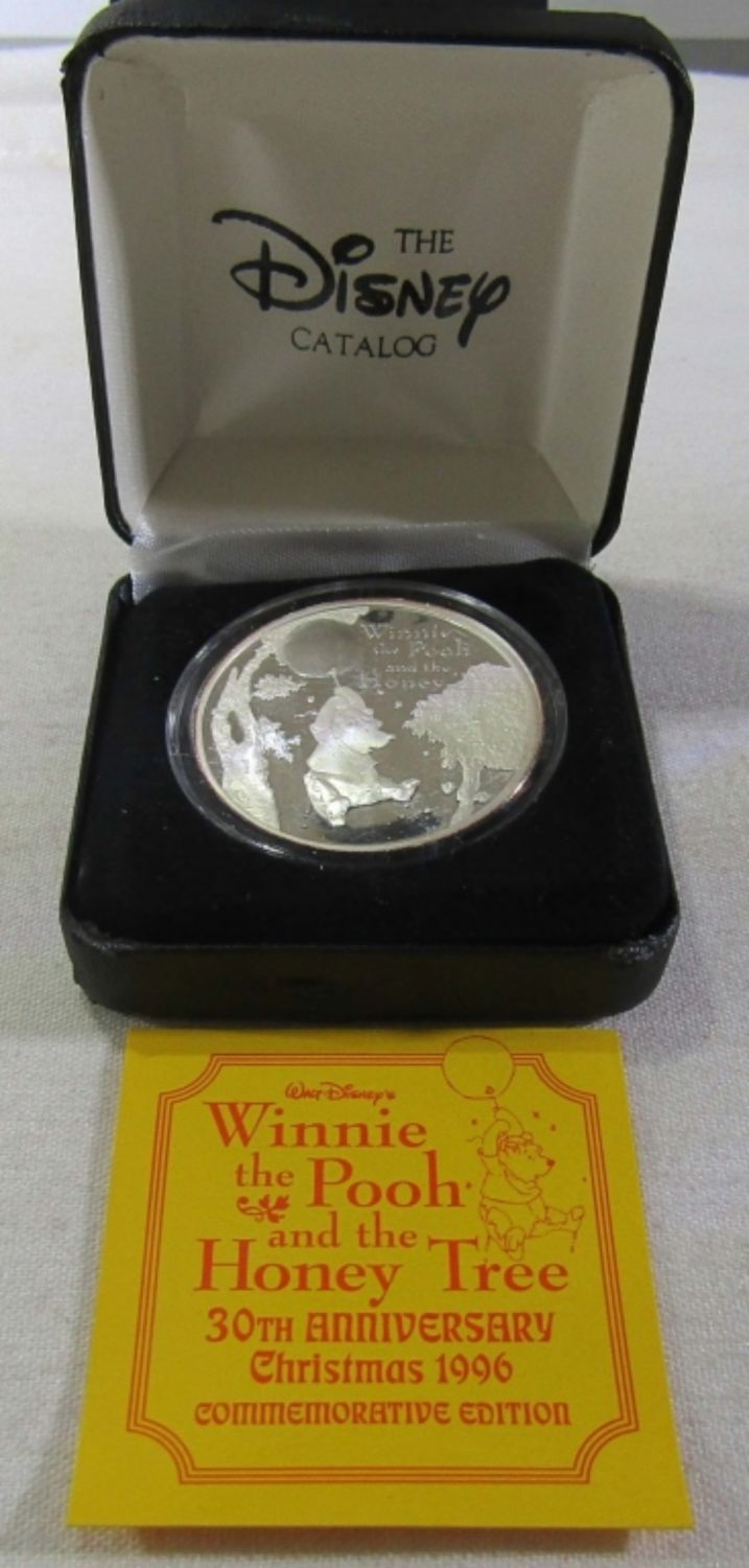 1oz .999 SILVER DISNEY’S WINNIE THE POOH AND THE HONEY TREE 30TH ANNIVERSARY CHRISTMAS COMMEMORATIVE EDITION. IN LEATHERETTE CASE WITH COA.