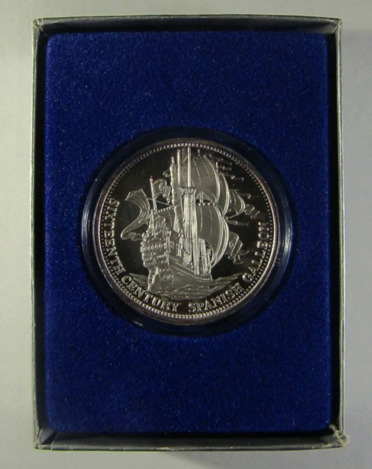 SIXTEENTH CENTURY SPANISH GALLEON DESIGN SILVERTOWNE ROUND IN GIFT BOX.