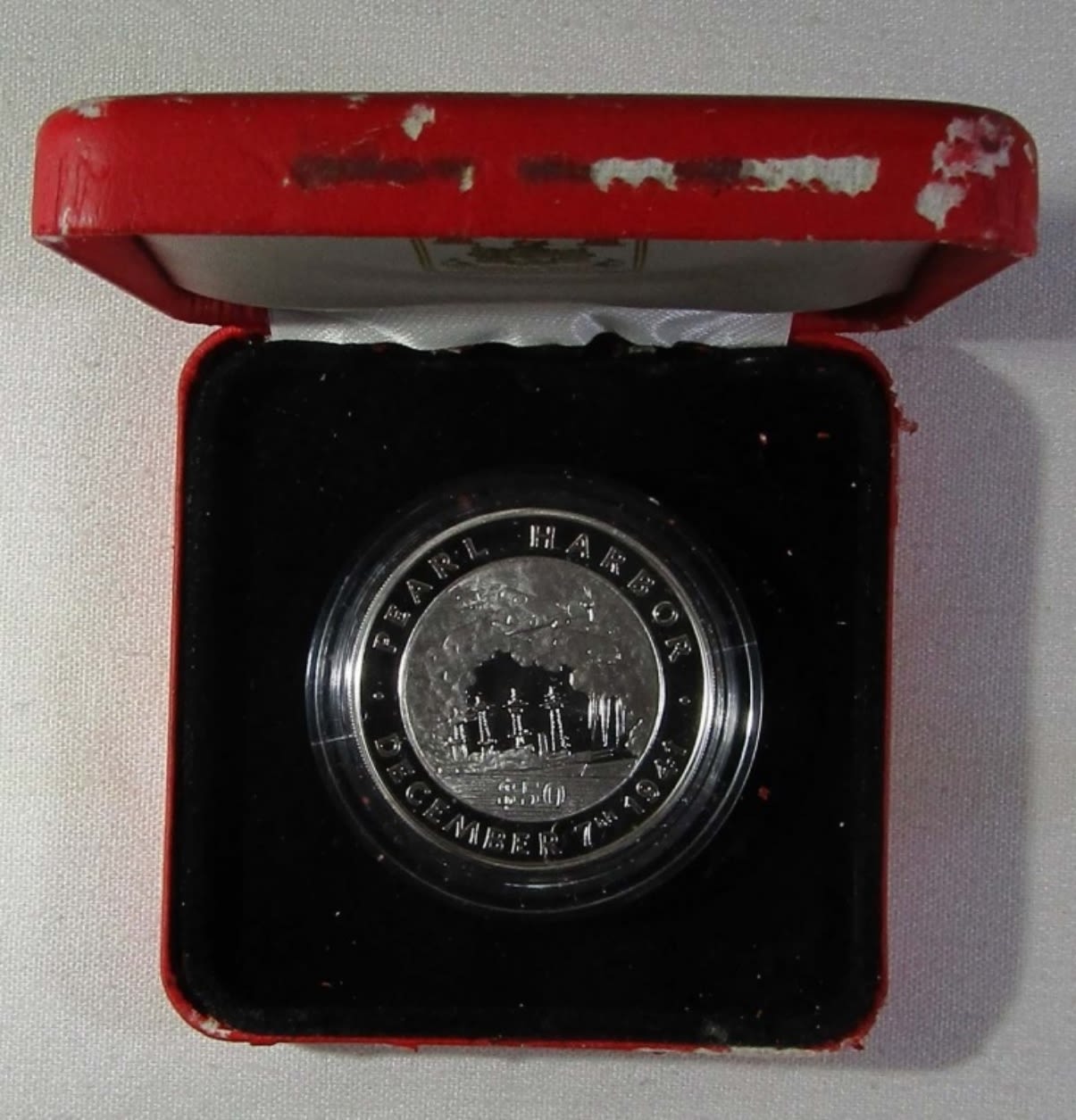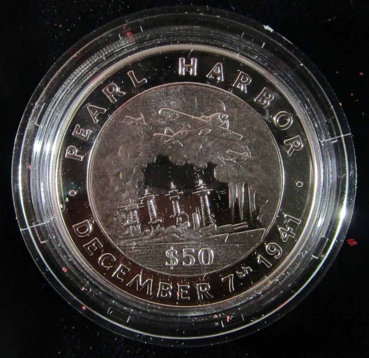 1oz .999 SILVER PEARL HARBOR 50TH ANNIVERSARY COMMEMORATIVE PROOF. IN DISPLAY BOX.
