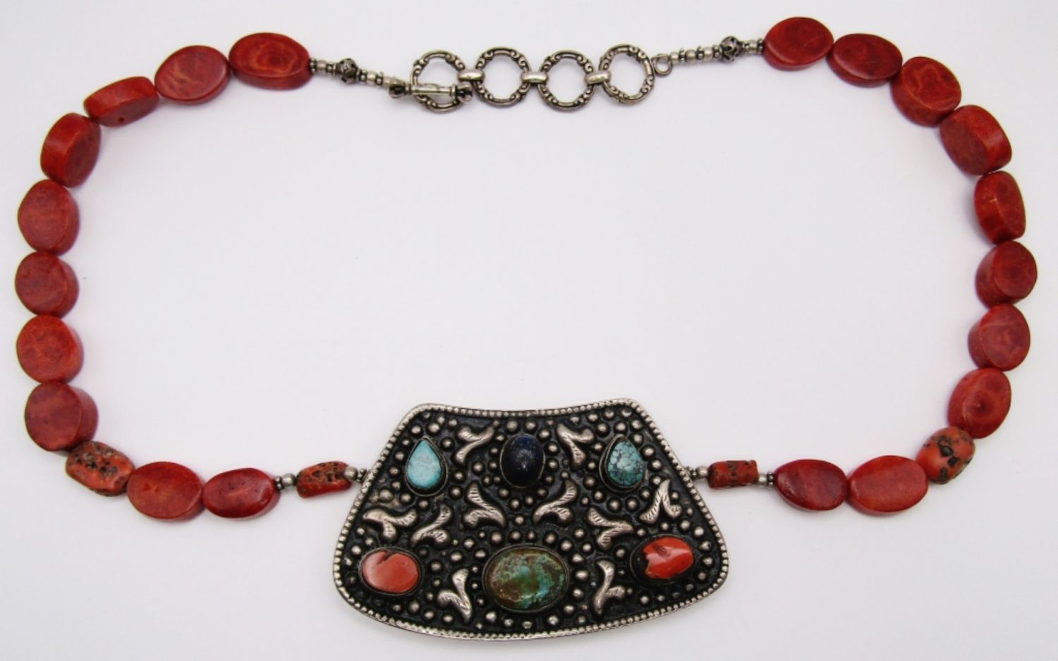 NECKLACE WITH STERLING PENDANT WITH TURQUOISE RED CORAL AND JASPER BEAD ACCENTS-STERLING CLASP-MEASURES 24 INCHES-TOTAL 74 DWT