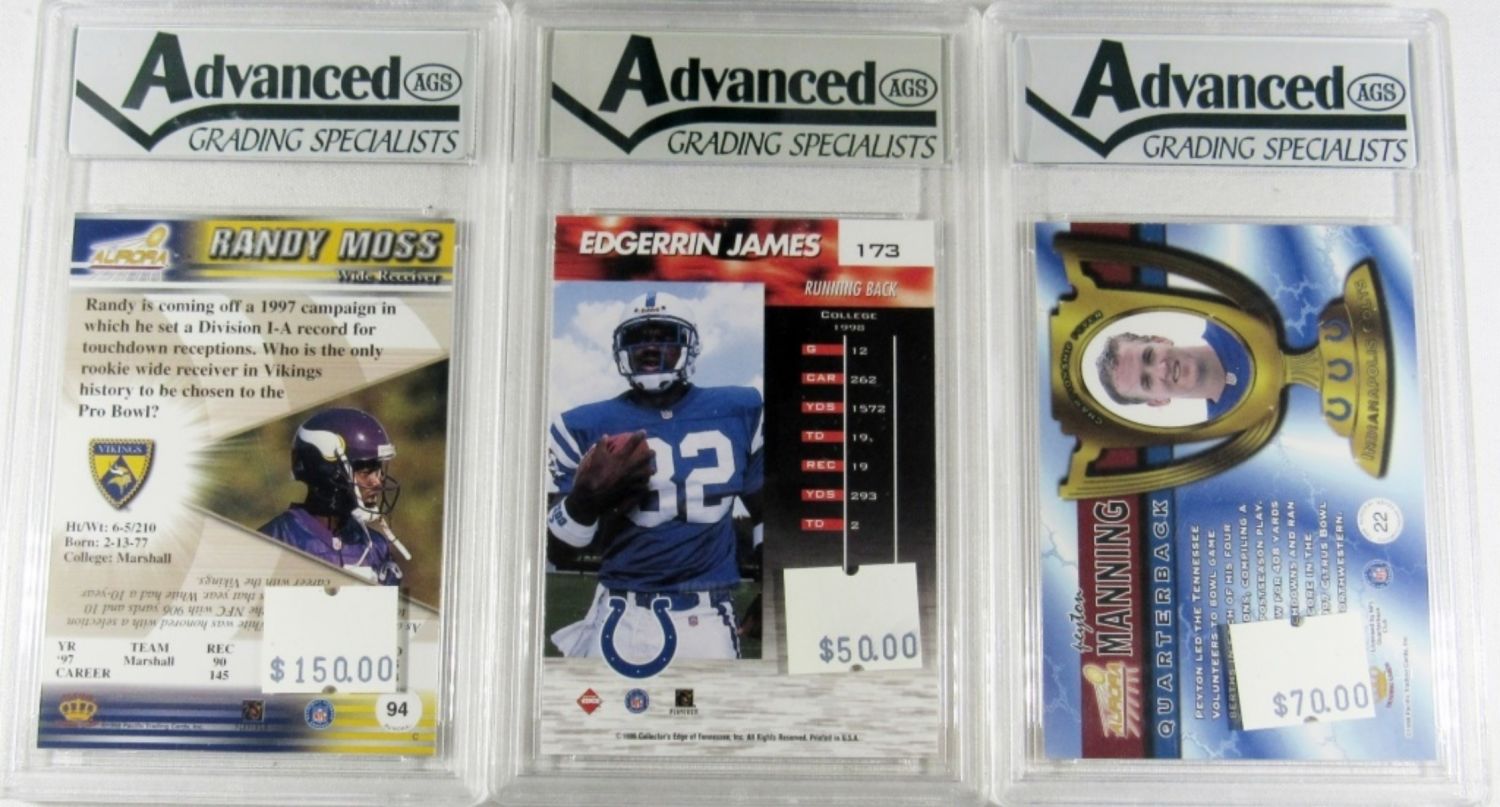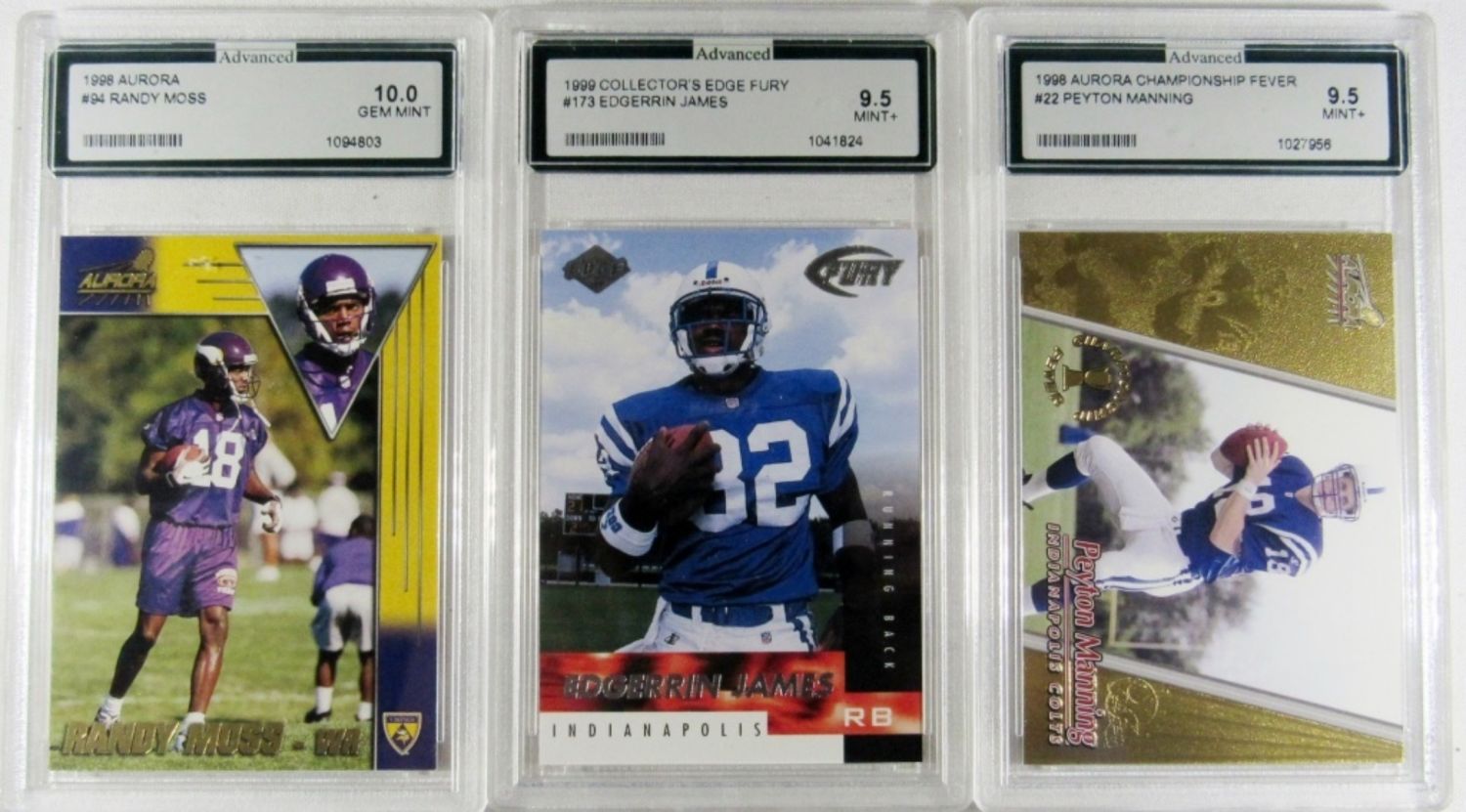 1998 AURORA CHAMPIONSHIP FEVERPEYTON MANNING, 1998 AURORA #94 RANDY MOSS, 1999 COLLECTOR’S EDGE FURY EDGERRIN JAMES – ALL MINT+ / GEM MINT