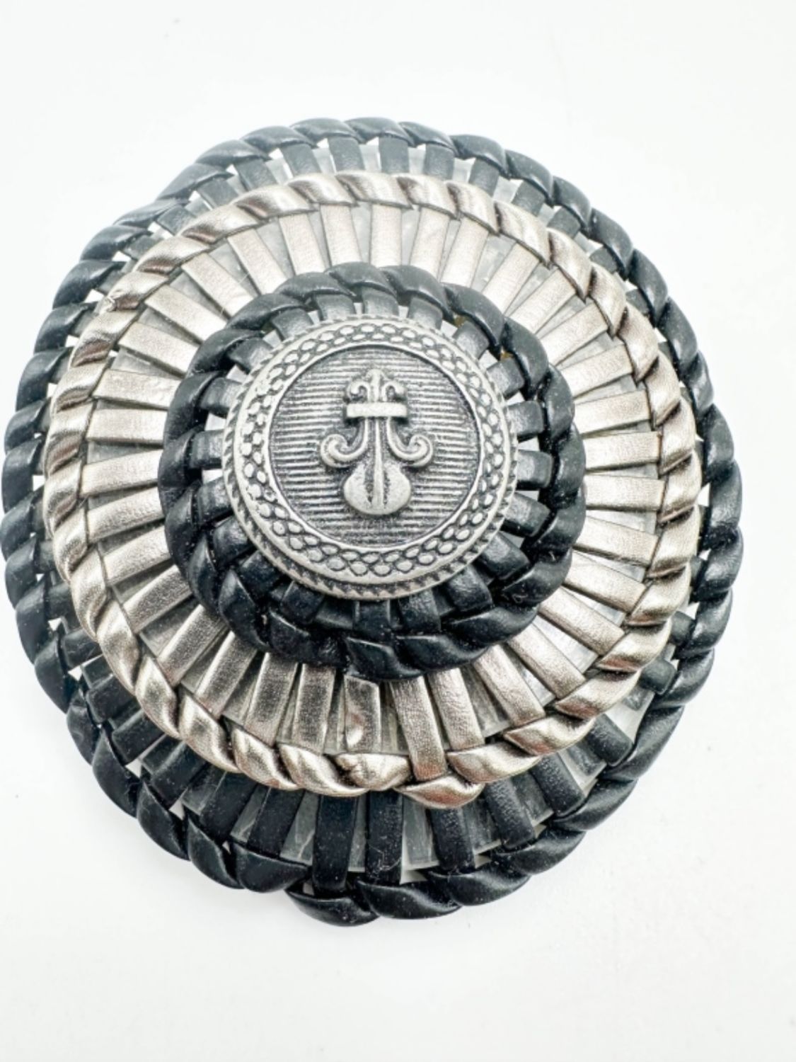 LARGE LEATHER BROOCH WITH MUTED SILVER TONES HIGHLIGHTS