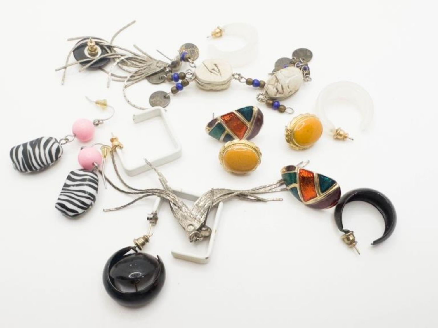 EARRINGS ASSORTMENT, COLOR , DANGLE AND MORE 3 PAIRS OF HUGGIE EARRINGS 3 PAIRS OF STUDS 3 PAIRS DANGLE EARRINGS (one pair needs repair with hooks)