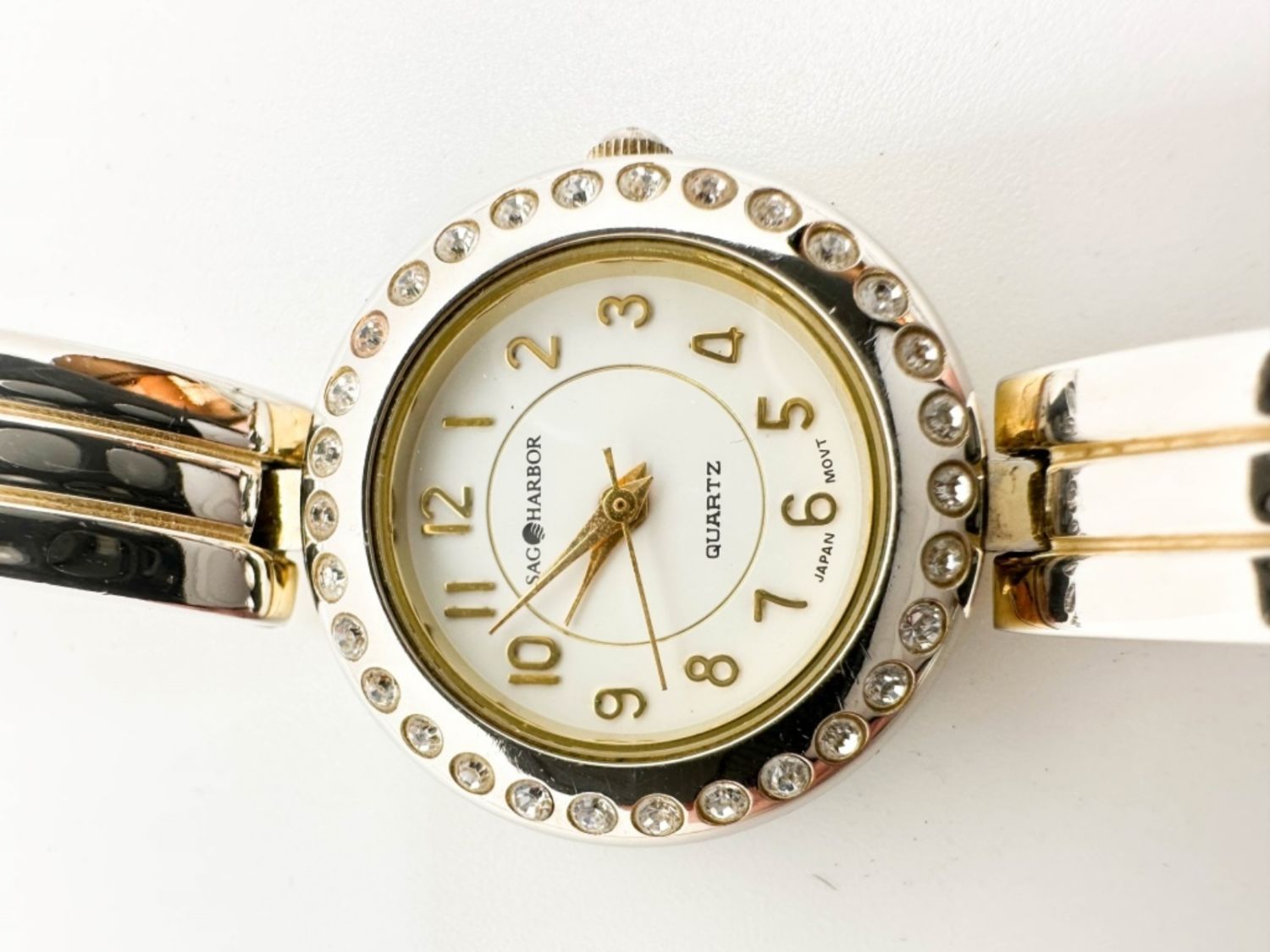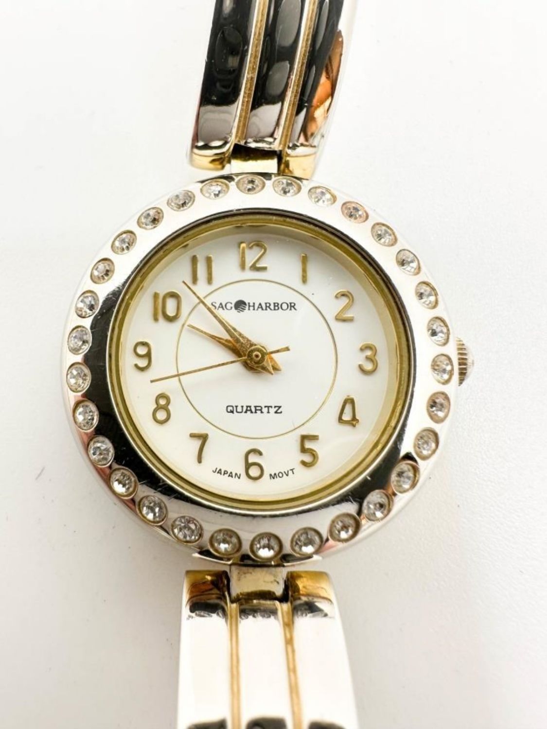 TWO TONED SAG HARBOR WATCH WITH CLEAR STONES AOUND THE FACE , NOT TESTED