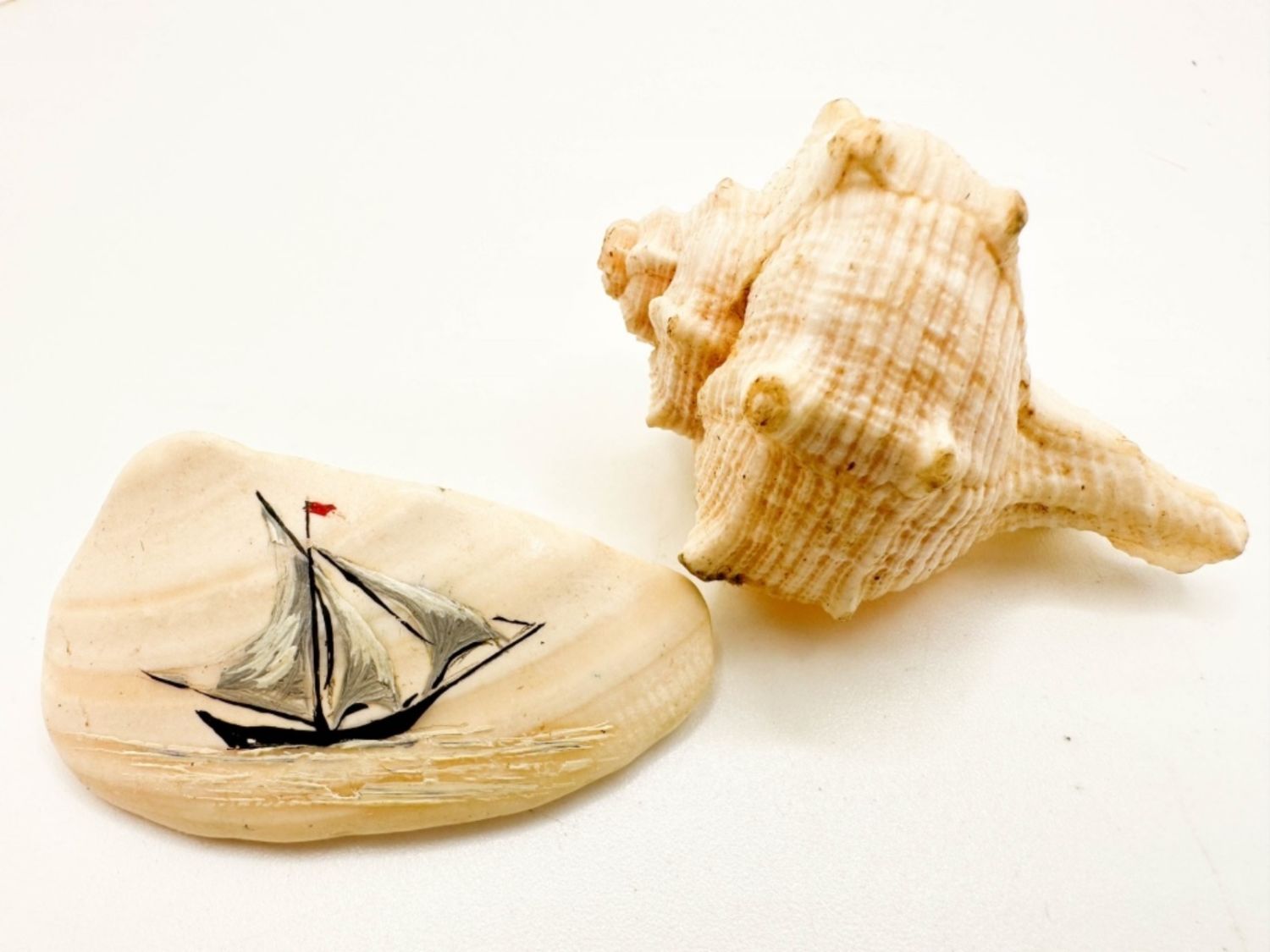 SHELL AND SHIP BROOCHES, NAUTICAL , HAND PAINTED SHIP, SIGNED