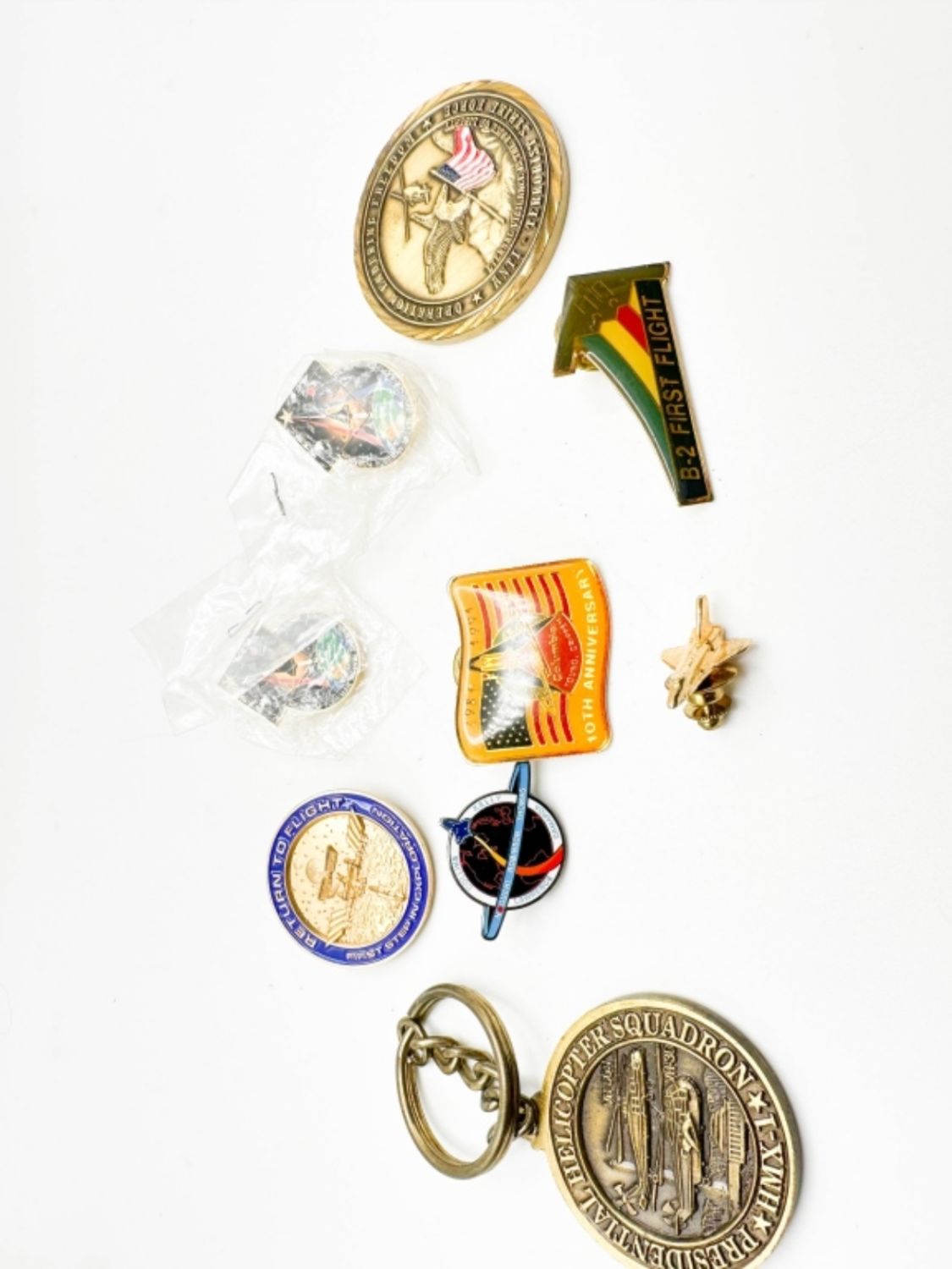 SPACE FLIGHT PINS, ONE KEYCHAIN, ONE COIN
