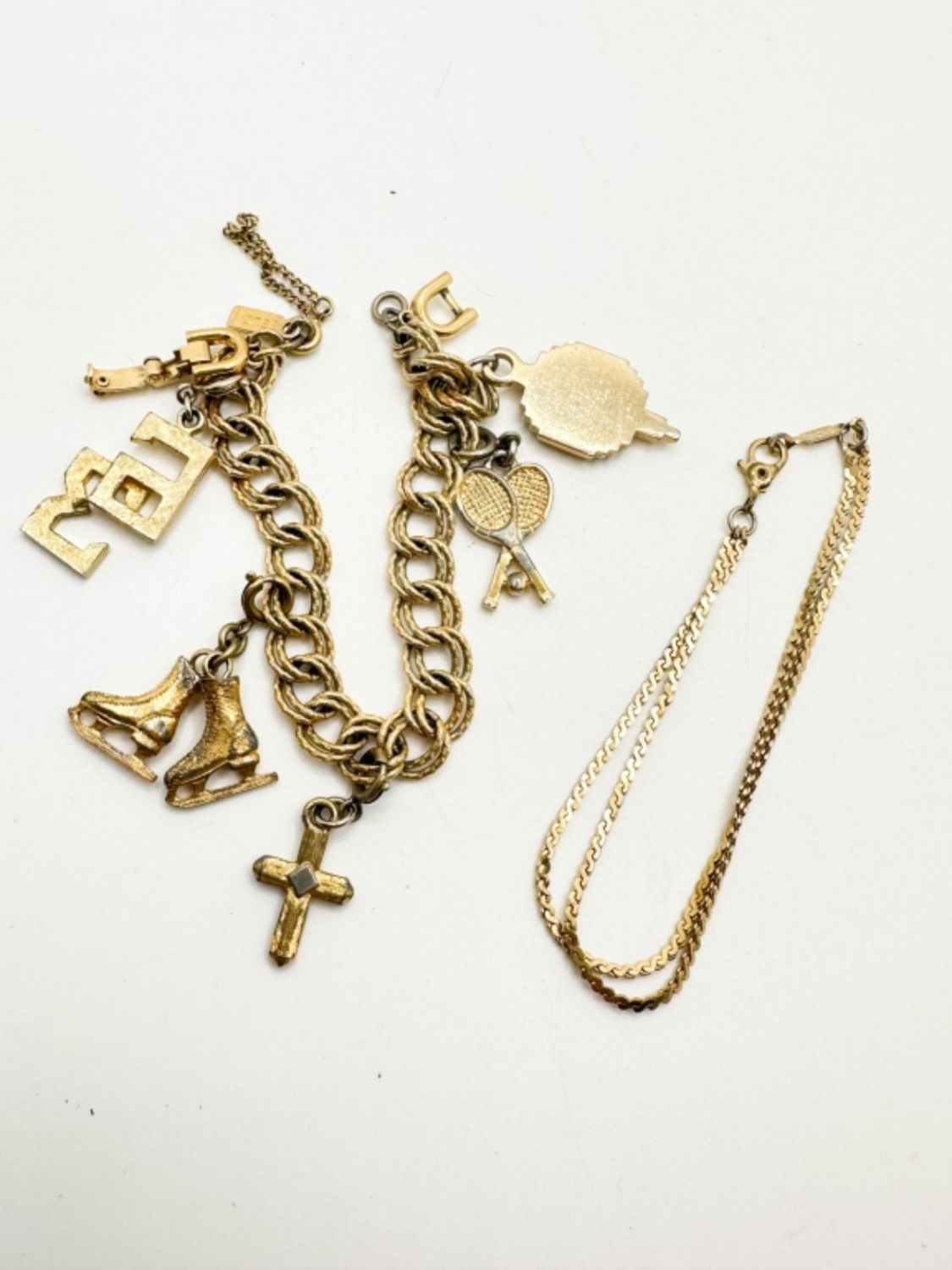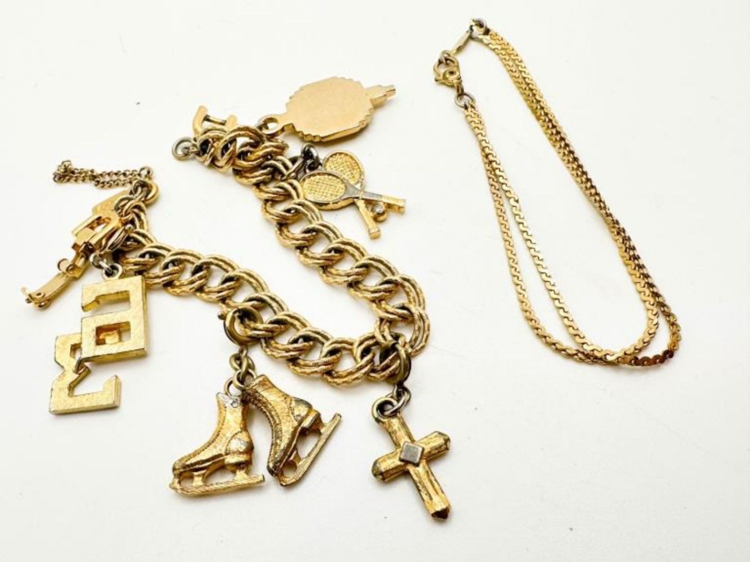2 MONET SIGNED VINTAGE BRACELETS , ONE WITH 5 CHARMS, BOTH WITH LOBSTER CLASPS, BOTH 7IN IN LENGTH,