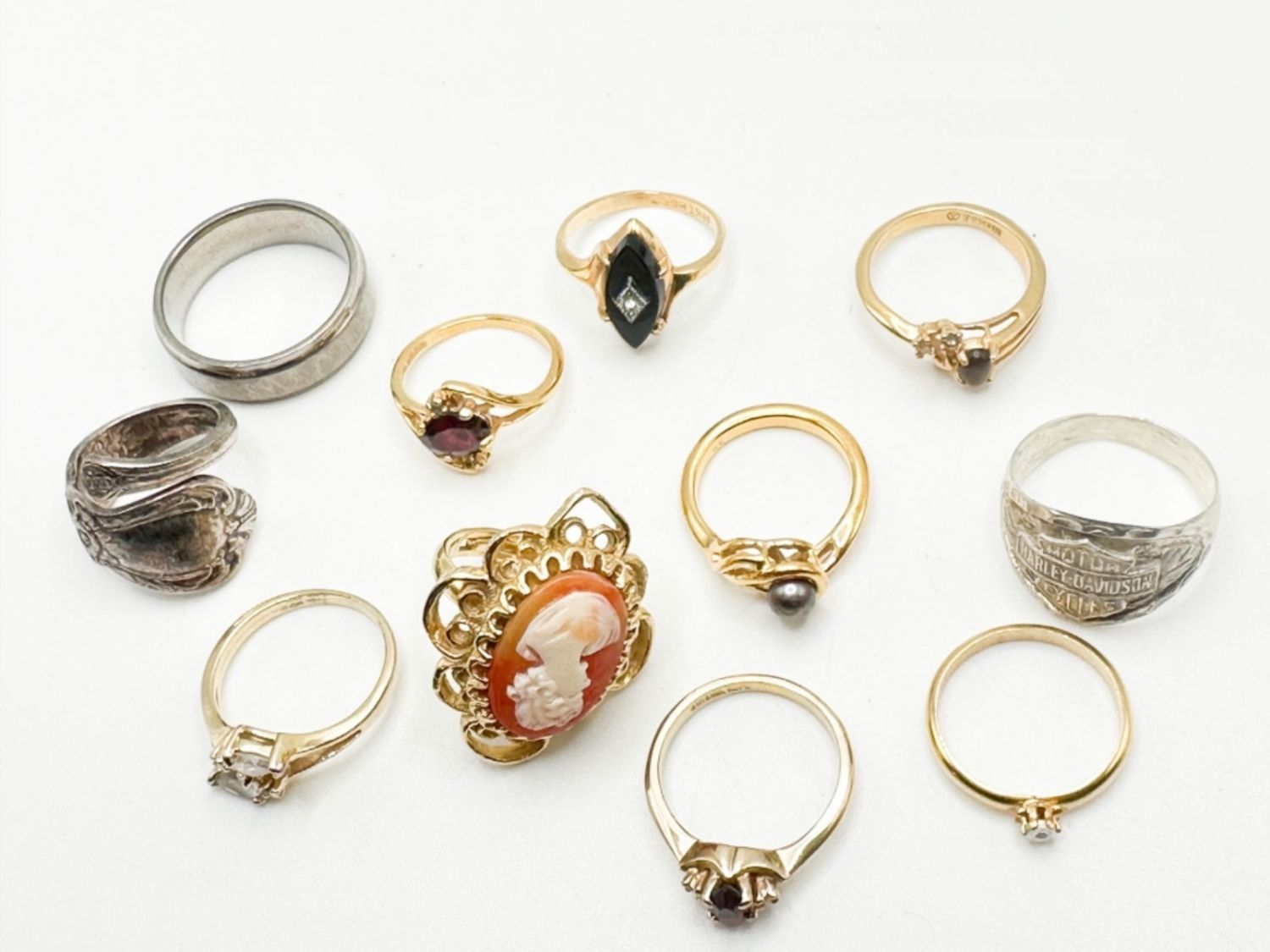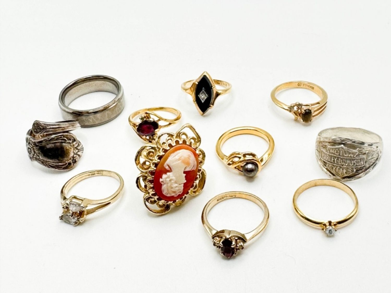 RINGS ASSORTMENT, ASSORTED STYLES, COLORS, CONDITIONS SOME INCLUDE MOTOR HARLEY DAVIDSON SLIVER RING, CAMEO RING, SLIVER PEARL RING RING SIZES RANGE FROM 4-12