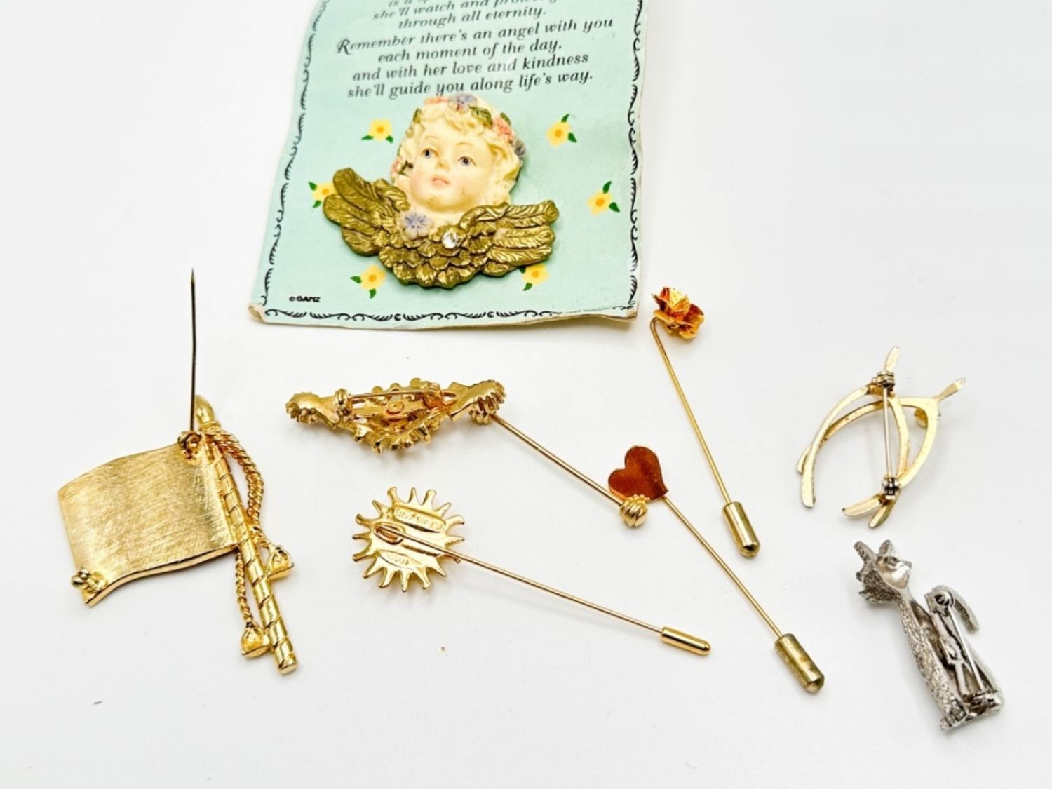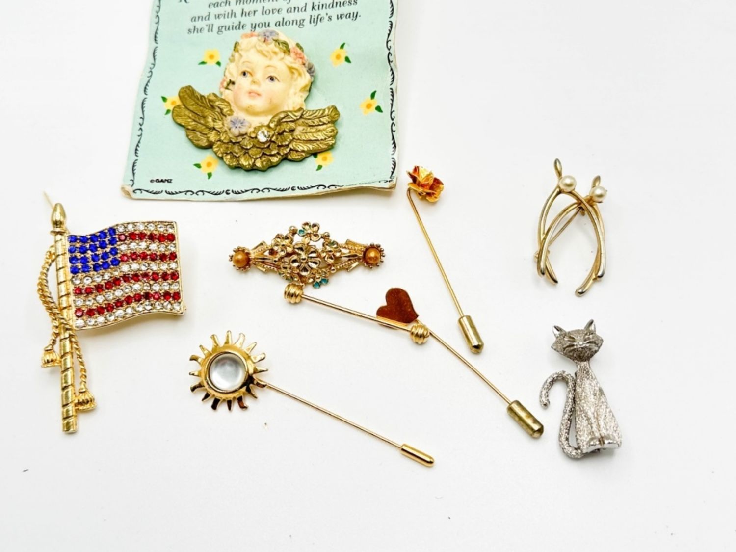 (9) SMALL PINS INCLUDING BIRTHSTONE ANGEL, FLAG, CAT & MORE
