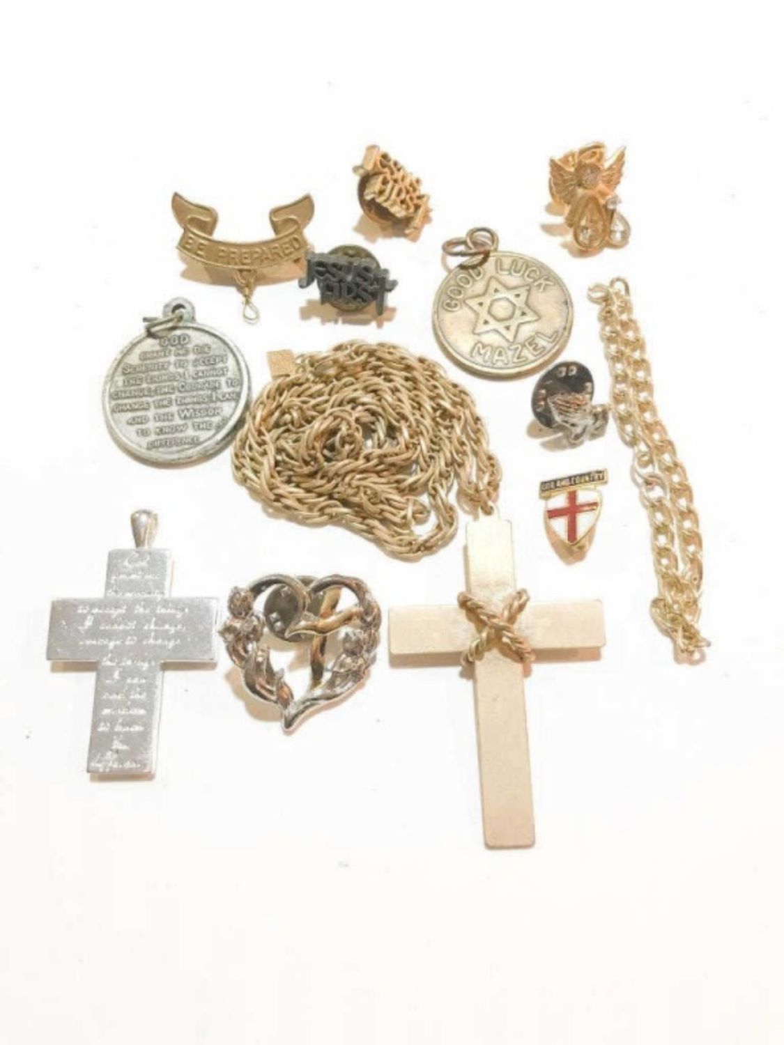 VARIETY OF PINS, PENDANTS & NECKLACE.