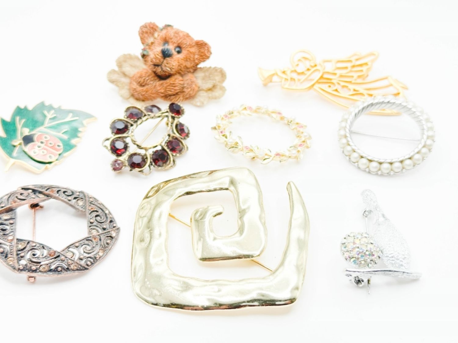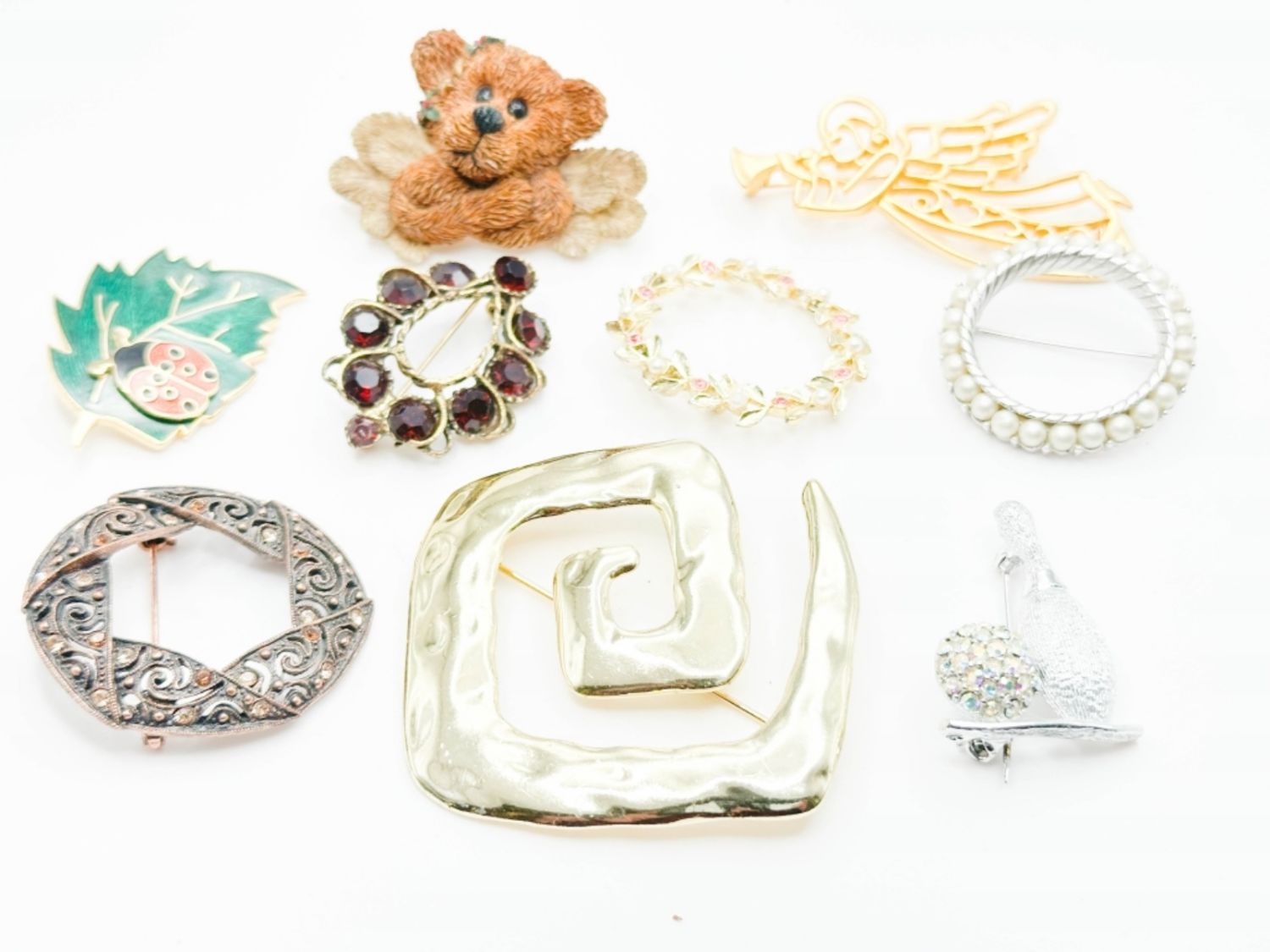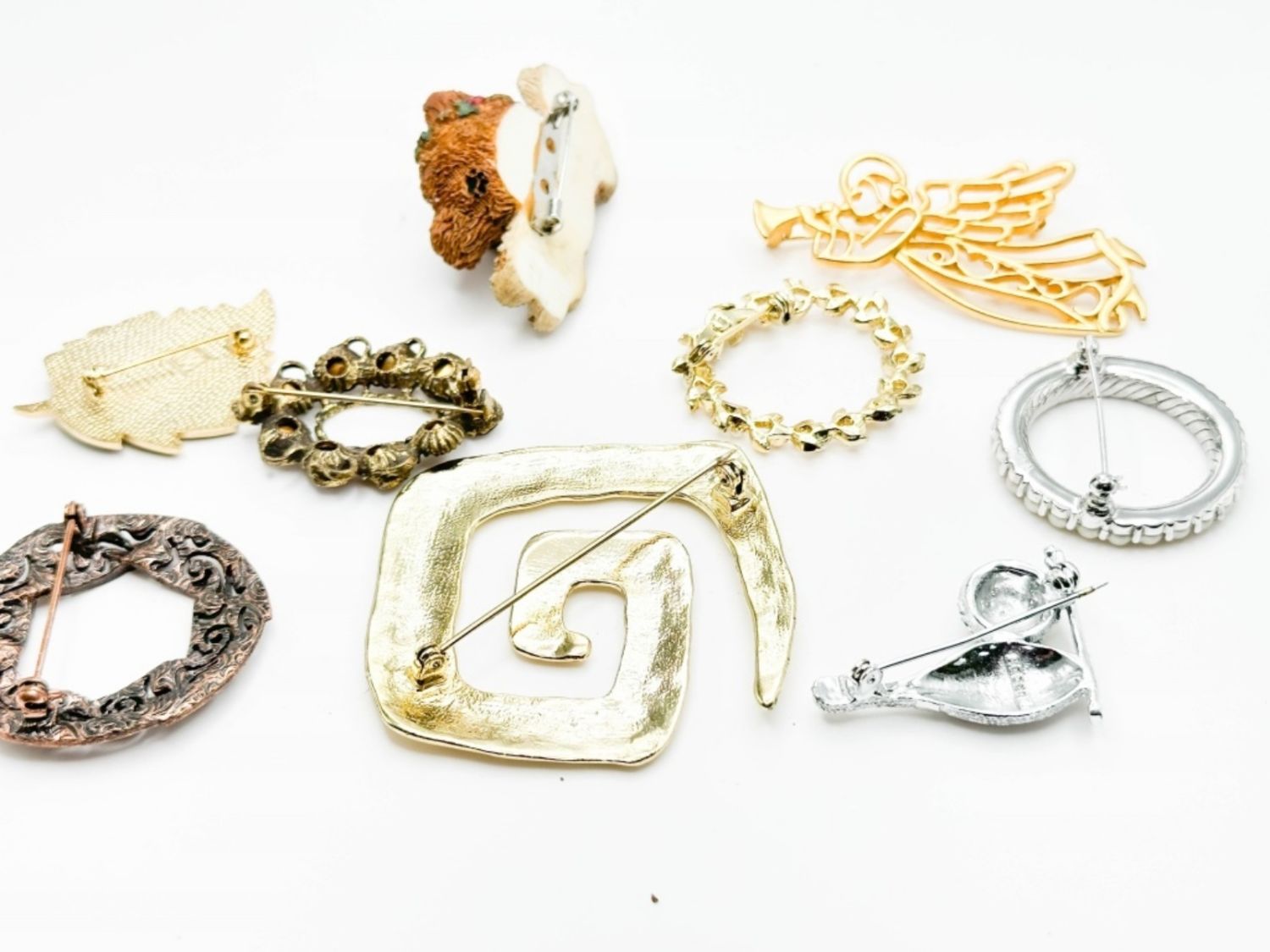 BROOCH ASSORTMENT WITH STONES, CIRCLES, MODERN, ANGEL BEAR AND MORE