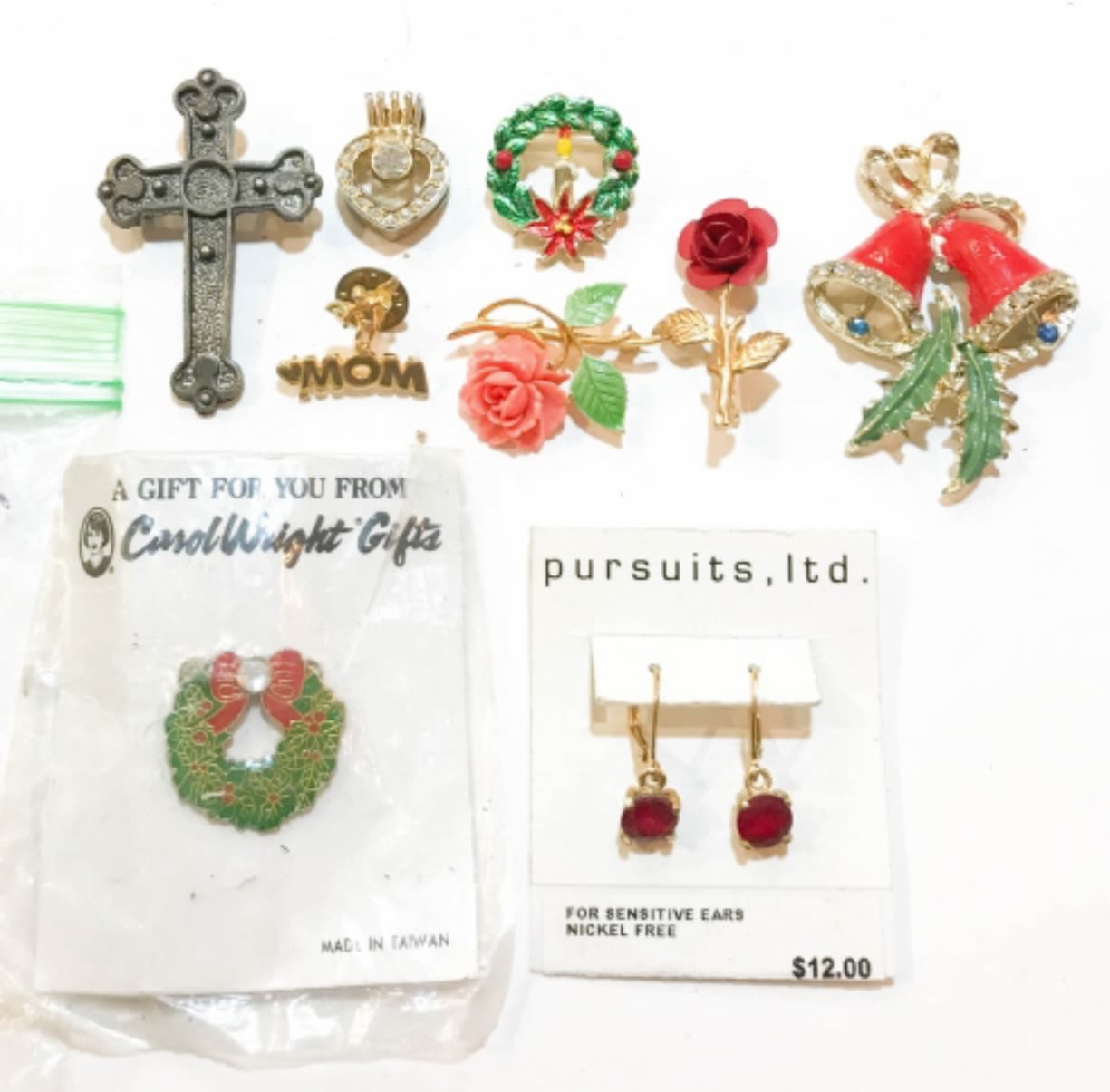 VARIETY EARRINGS, PINS, & PENDANTS. INCLUDED WREATHES, CROSS, FLORAL, BELLS & MORE!