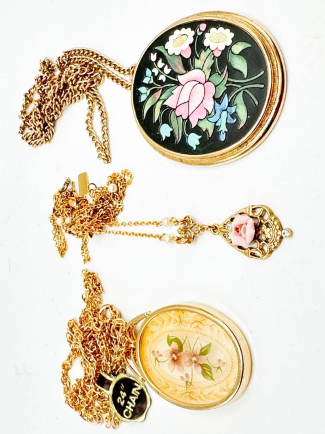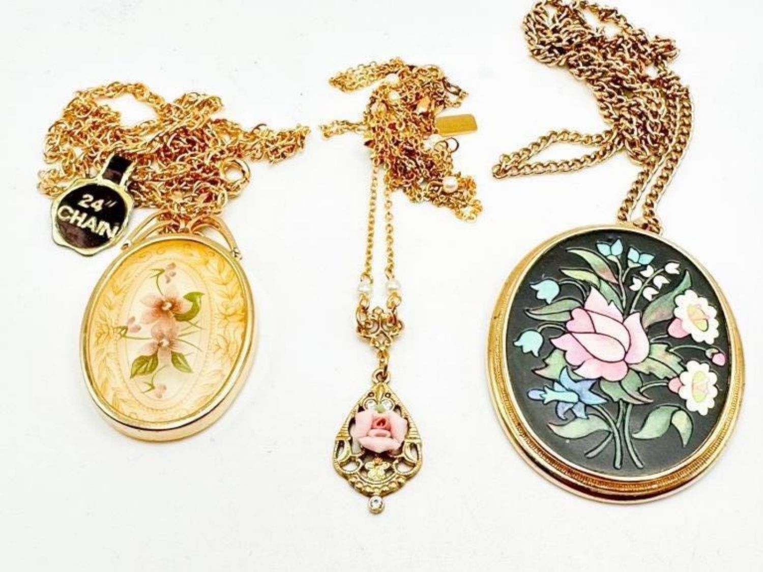 AVON FLORAL WITH BLACK BACKGROUND 26IN LENGTH NECKLACE GOLD TONE, ONE FLORAL WITH WHITE BACKGROUND 24IN IN LENGTH LAST ONE ROSE AND CLEAR STONE NECKLACE ,