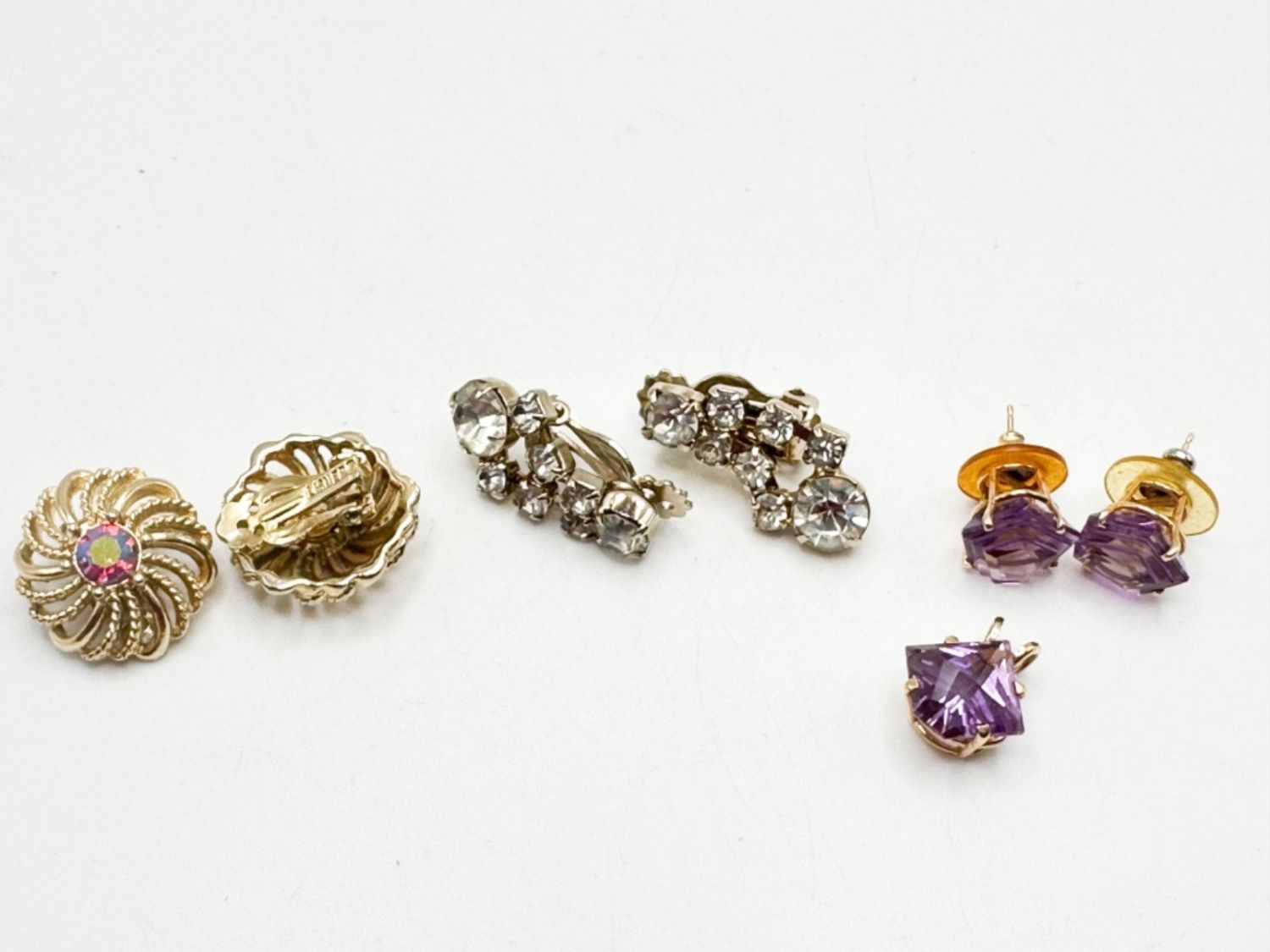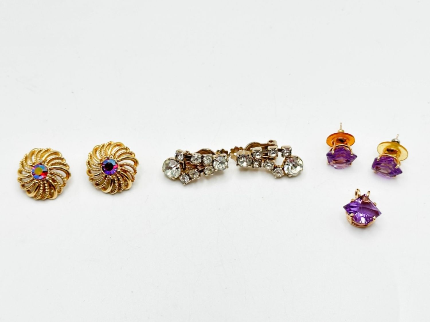 LISNER CLIP ON EARRINGS MARKED WITH LISNER ON THE BACK, GOLD TONE WITH A RED STONE IN THE MIDDLE ONE PAIR CLEAR STONE CLIP ON EARRINGS ONE PAIR OF PURPLE CLEAR STONE WITH A