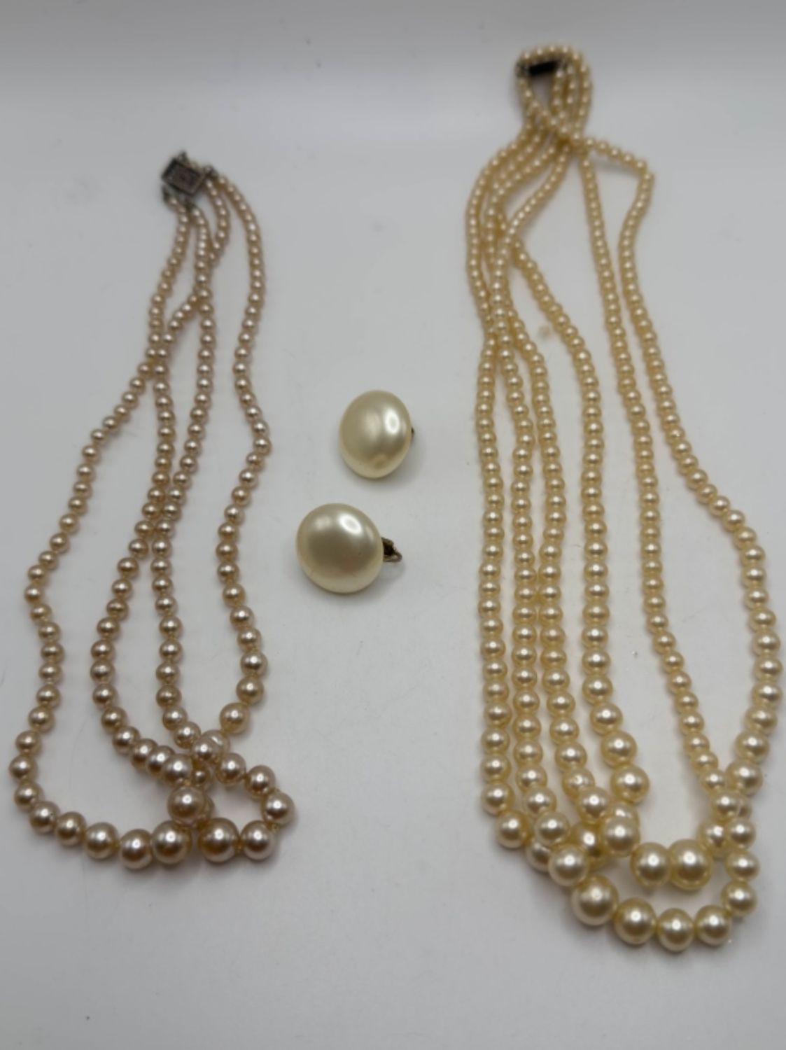 ONE PAIR OF MOTHER OF PERL CLIP ON MARVELLA EARRINGS, TWO LAYERED PEARL NECKLACE WITH BALL CLASP 16IN IN LENGTH FOR ONE AND 18IN LENGTH FOR THE OTHER