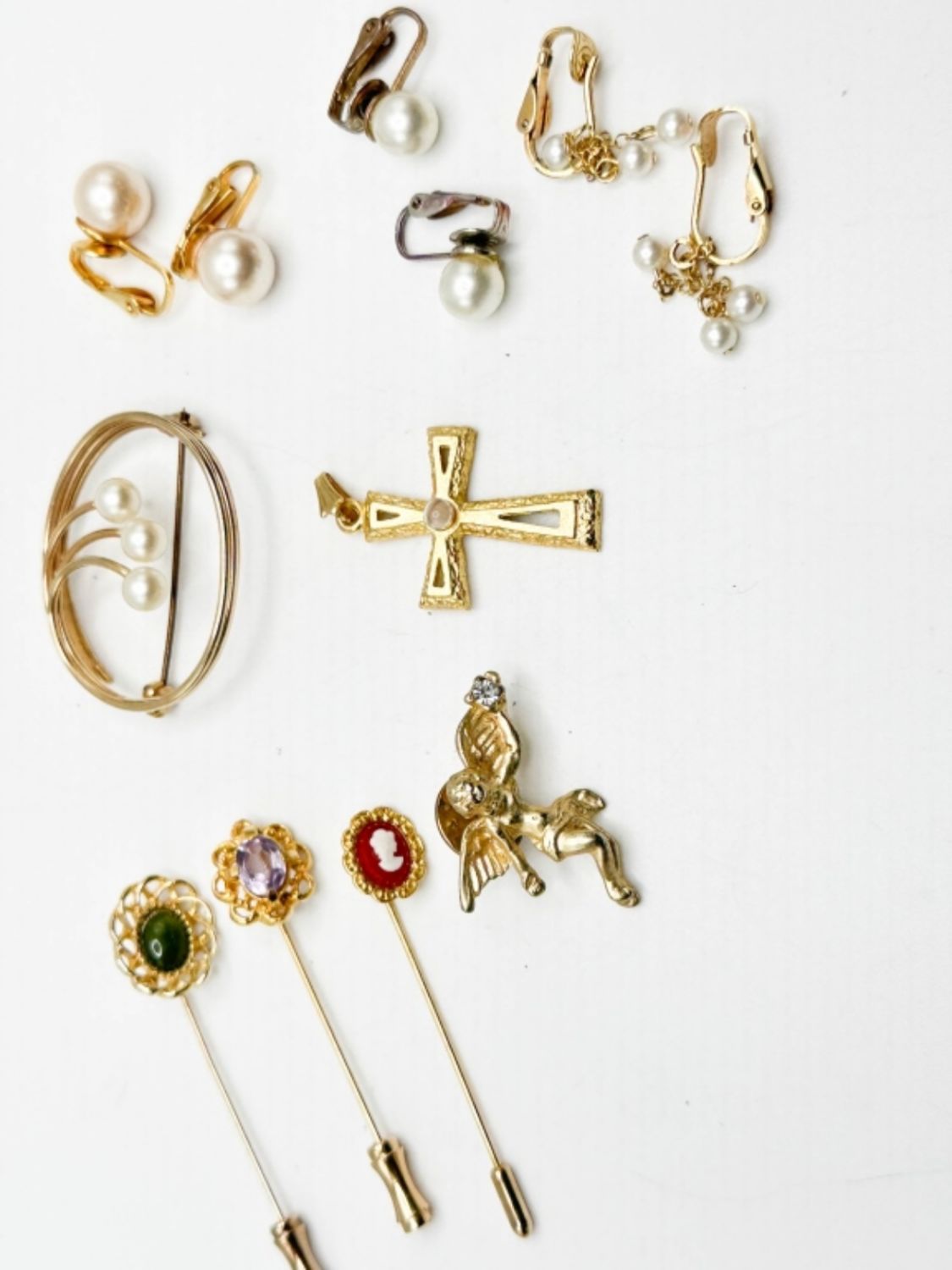 3 PINS (CAMEO WITH BURNT ORANGE BACKGROUND, GREEN STONE AND PURPLE CLEAR STONE) ONE ANGEL PIN WITH A CLEAR STONE, A CROSS WITH CLEAR STONE, ON FAUZ PEARL BROOCH