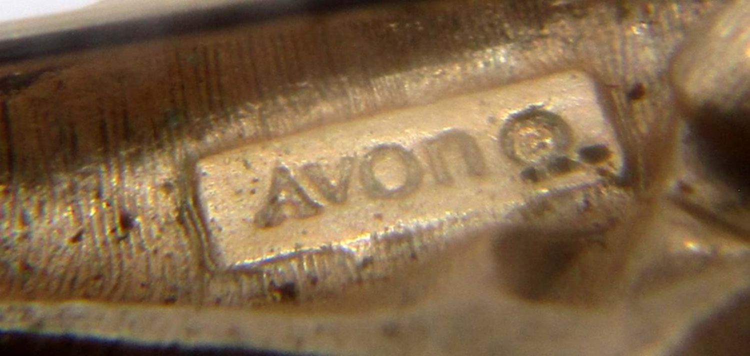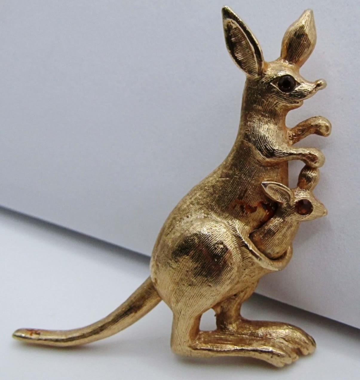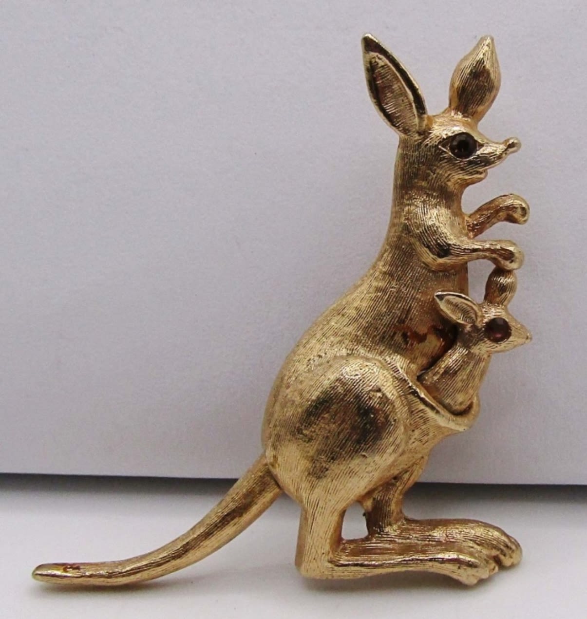 AVON KANGAROO BROOCH WITH COLORED STONE EYES, MOVE ITS TAIL AND THE BABY KANGAROO MOVES OUT OF POUCH MARKED WITH MAKERS MARK ON BACK