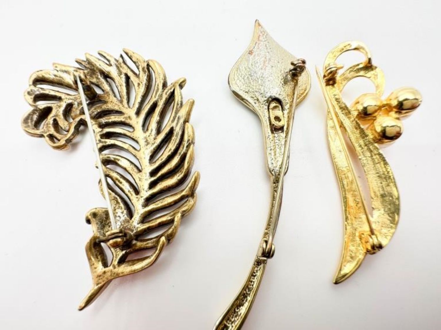 3 VINTAGE BROOCHES ONE HAS CHOCOLATE CLEAR STONES ALL OVER THE LEAF, ONE HAS CLEAR STONE ALL OVER THE PEATALS, THE LAST BROOCH HAS THREE FAUX PEARLS ATTACHED