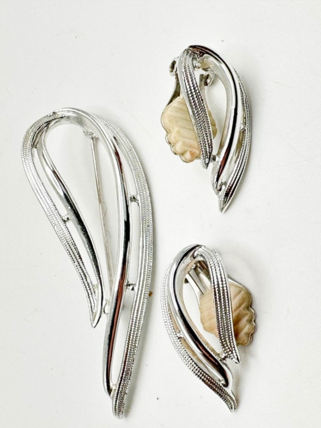 SARAH COVENTRY SILVER TONE BROOCH AND CLIP ON EARRING SET, ALL MARKED BY MAKER