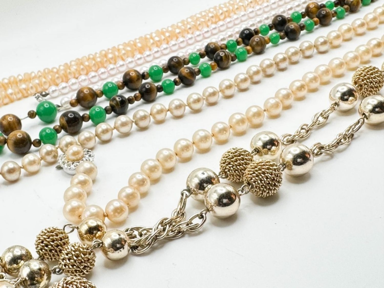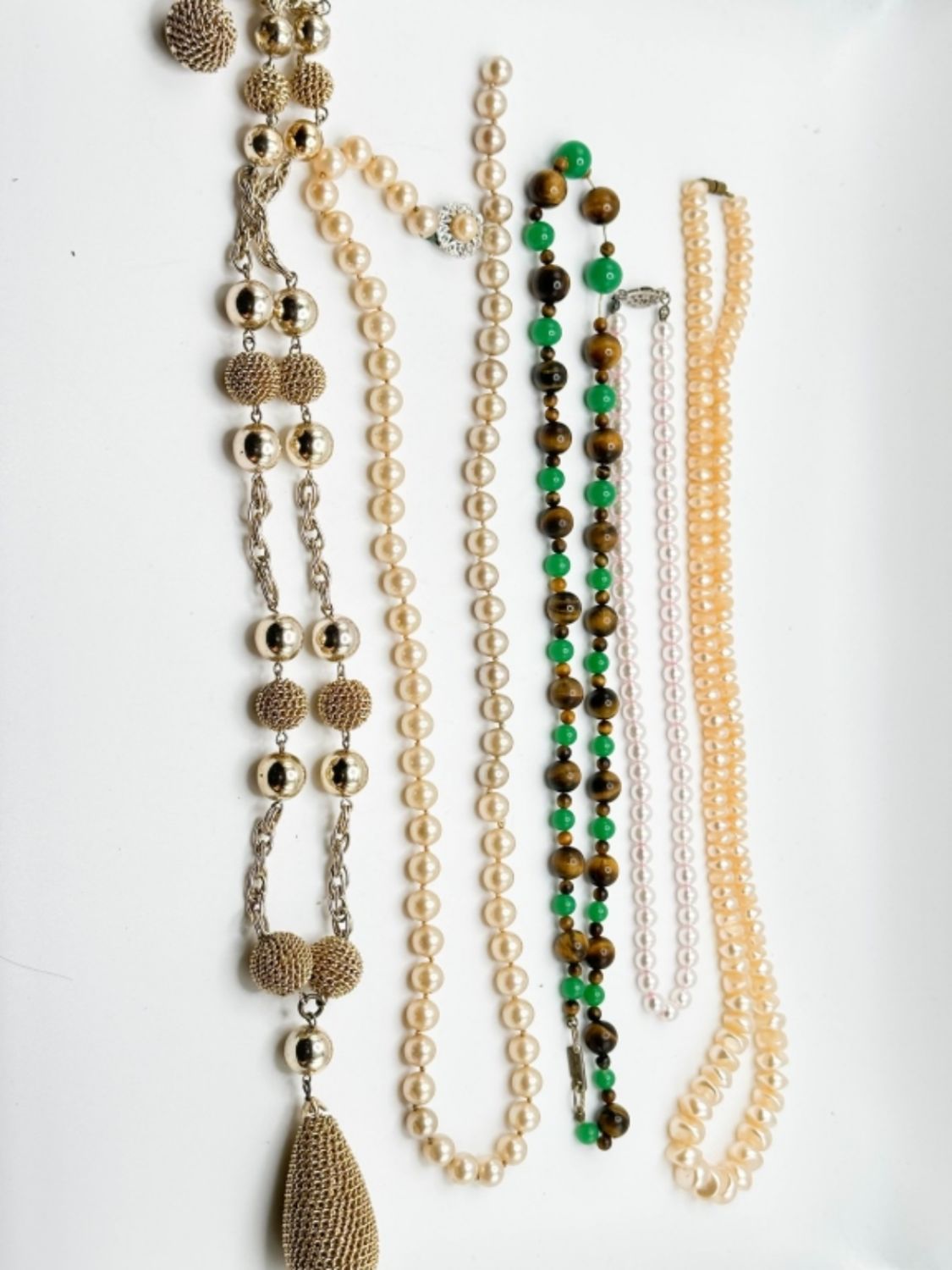 VINTAGE NECKLACES ASSORTMENT , BEADS AND BAUBLES FAUX PEARLS,NATURAL STONES, (ONE PEARL NECKLACE WILL NEED REPAIR AT THE CLASP)