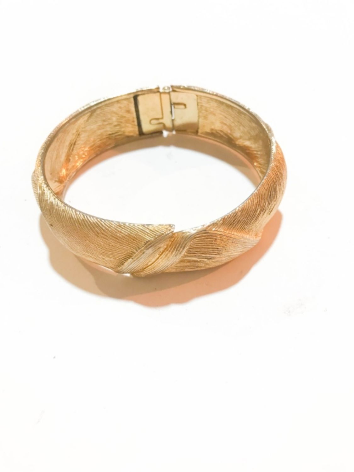 GOLD TONE MONET BANGLE WITH MARKERS MARK INSIDE, DOES OPEN TO PUT ON. HAS A WAVE LIKE DESIGN ALL AROUND