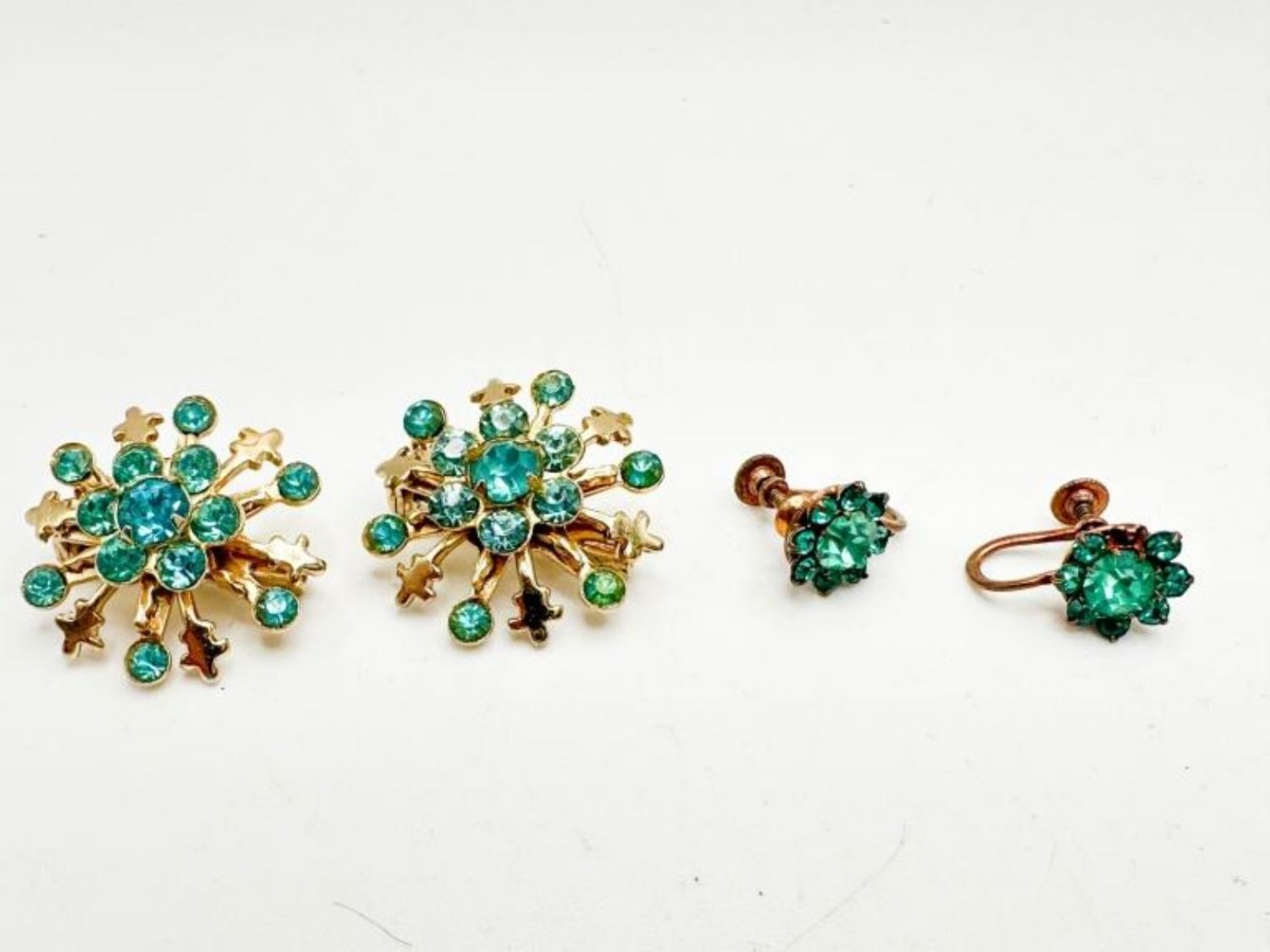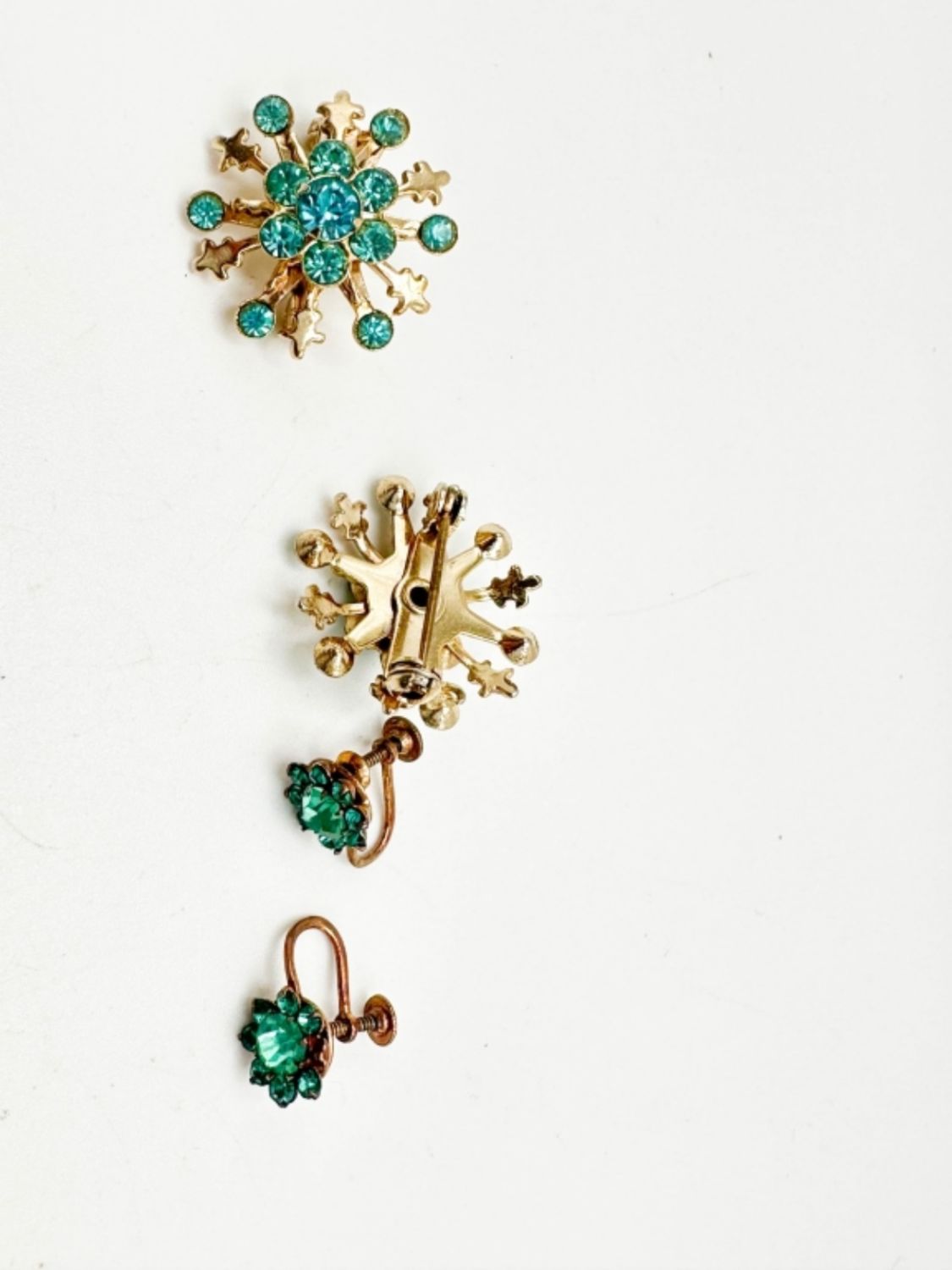 2 AQUA STONES SNOWFLAKE BROOCHES AND ONE PAIR FOR AQUA STONE VINTAGE STYLE SCREWBACK EARRING