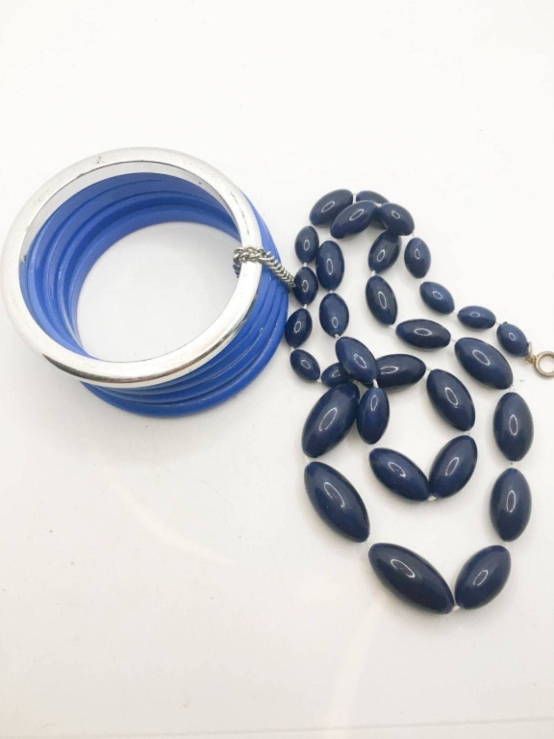 5 BANGLES, A LARGE BLUE BEADED FASHION NECKLACE 24IN IN LENGTH