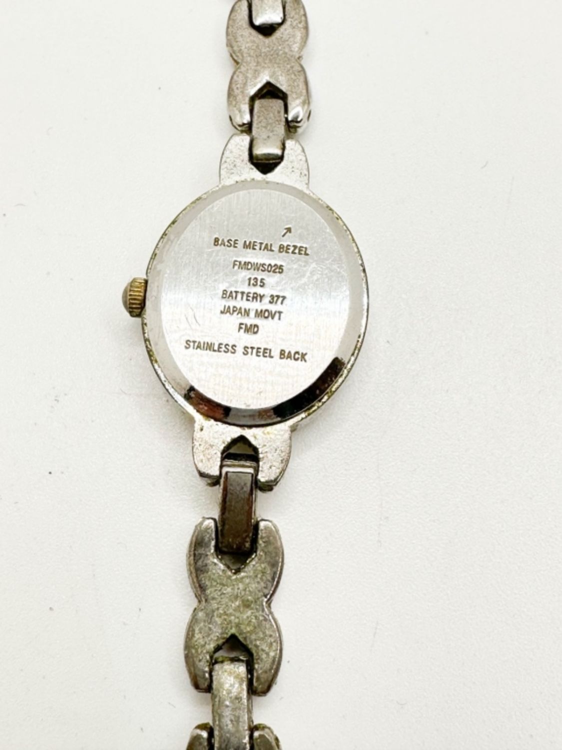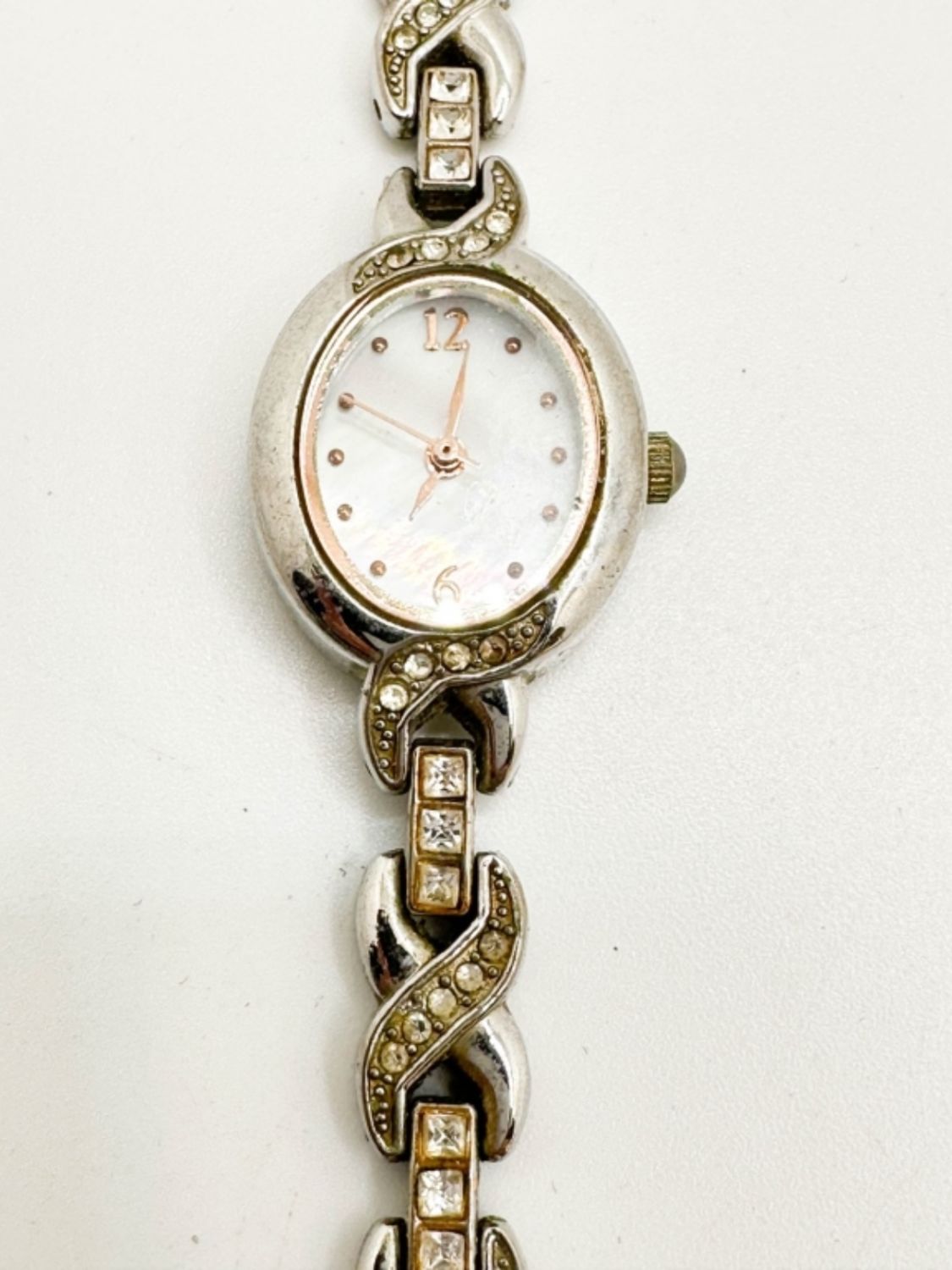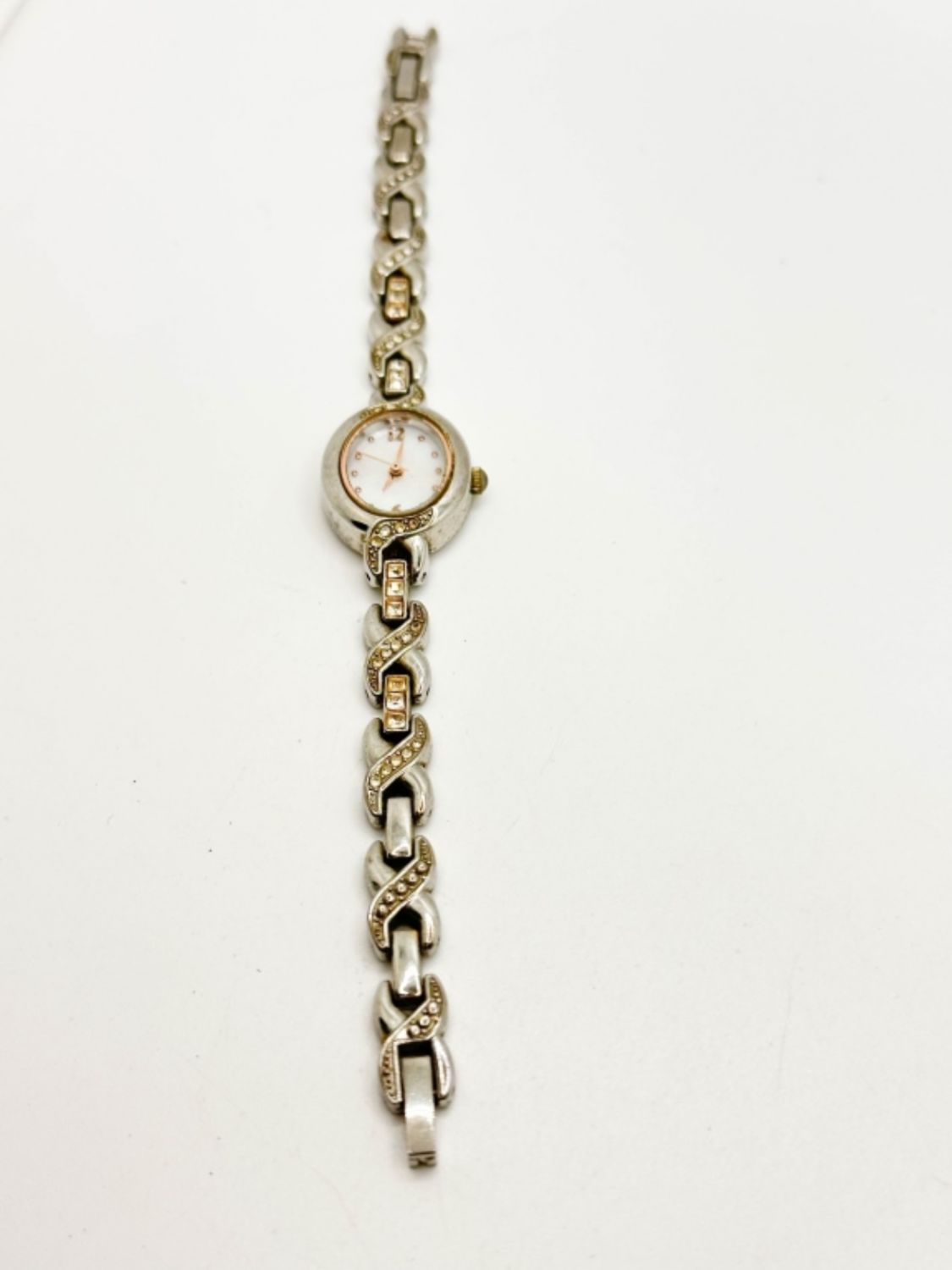 SMALL WATCH W STONES WITH A DESIGN BAND THAT HAS CLEAR STONES ALONG IT, FACE OF WATCH HAS ROSE GOLD TONE FOR THE FACE AND AROUND IT, OPEN FOLD CLASP, NOT TESTED