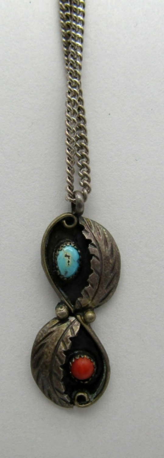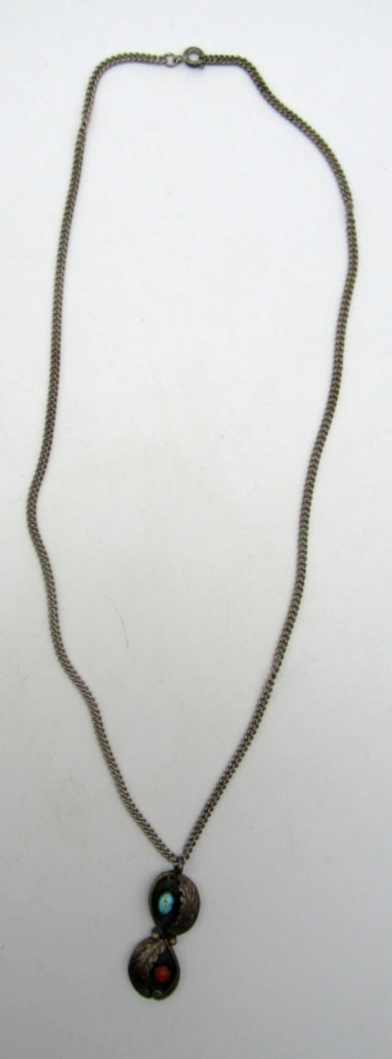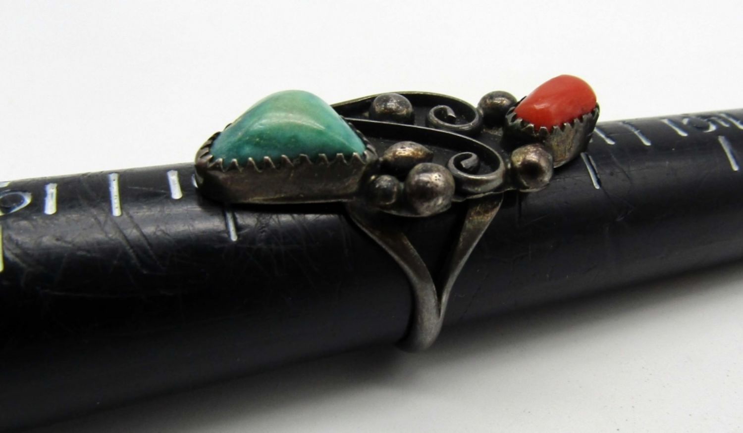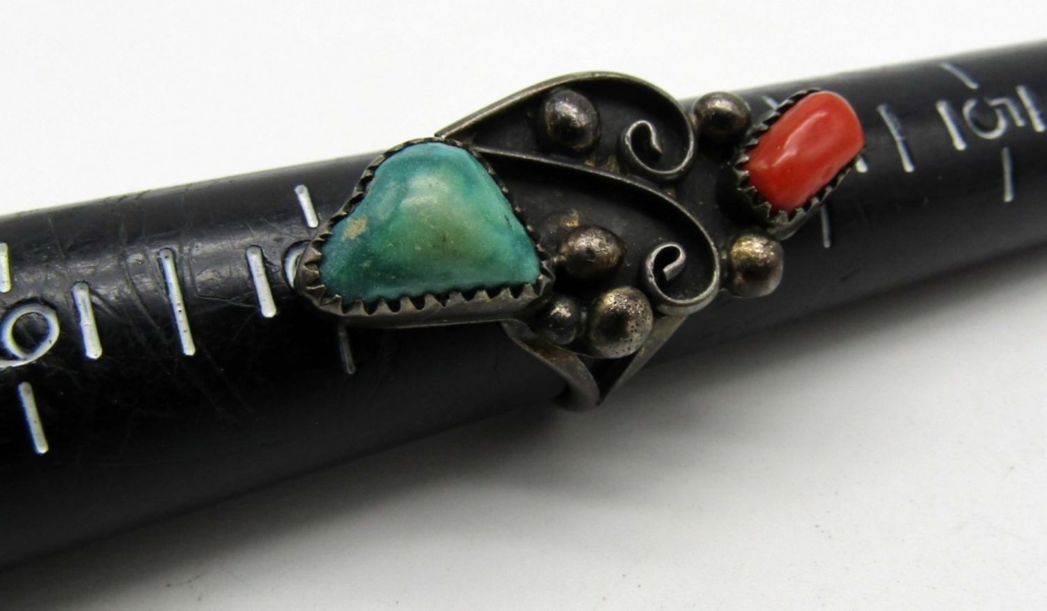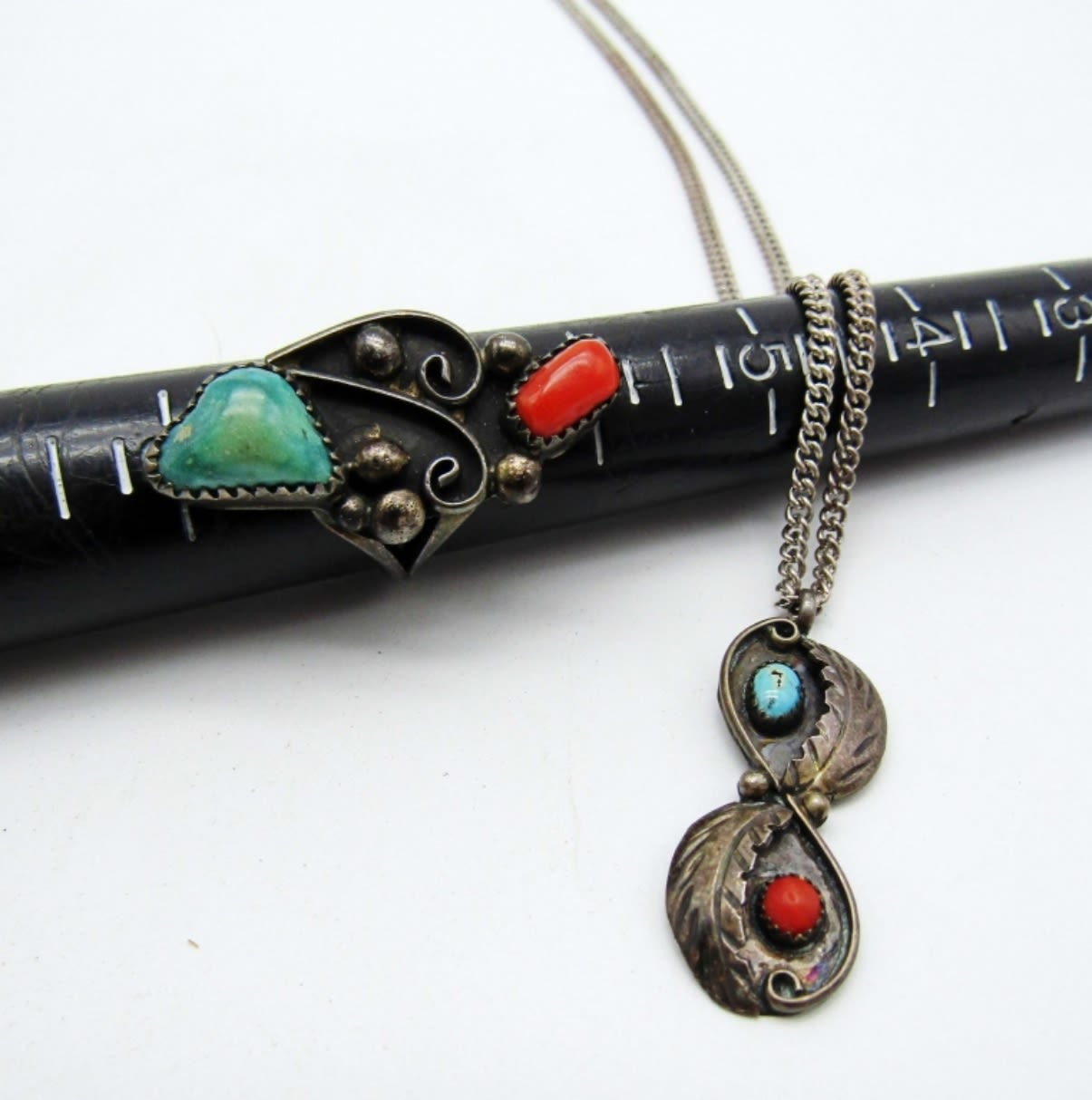 9.2dwt, 18in an infinty pendant with coral and turquoise in the middle of necklace etched AT117 “82”, ring size 7 stamped PM, etched AT57