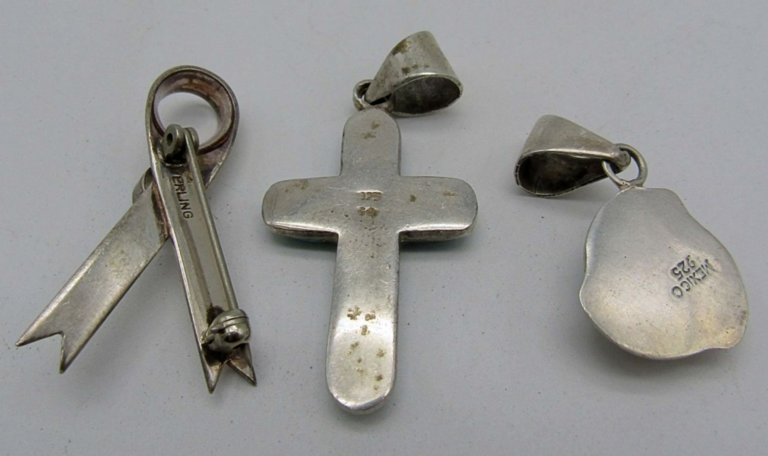 11dwt,a cross with turquoise inlay under 2in stamped 925, circle turquoise pendant, 2in, stamped mexico 925,ribbon with small turquoise stone in the middle, stamped sterling on back,2in